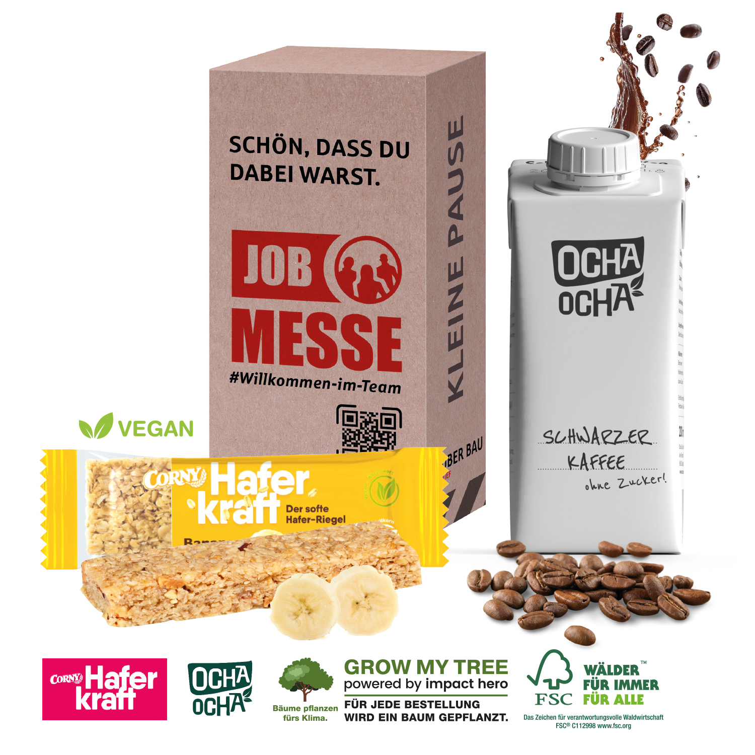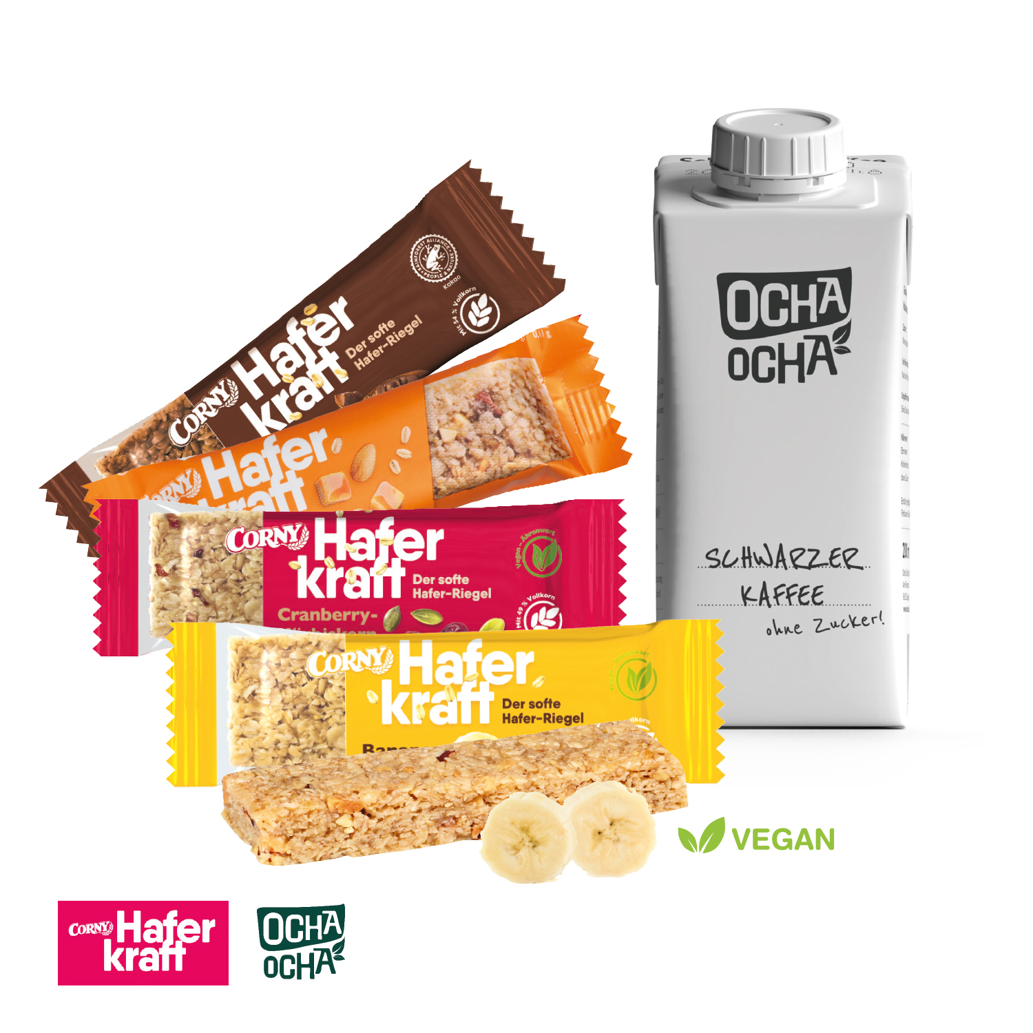 Kleine Stärkung! Eine kleine Stärkung für Zwischendurch? Auf Messen, Veranstaltungen oder auf Reisen ist der kleine Snack Pack das ideale Präsent. Individuell bedruckbar und gefüllt mit einem Corny Haferkraft Riegel und einem Ocha Ocha schwarzen Kaffee ohne Zucker.