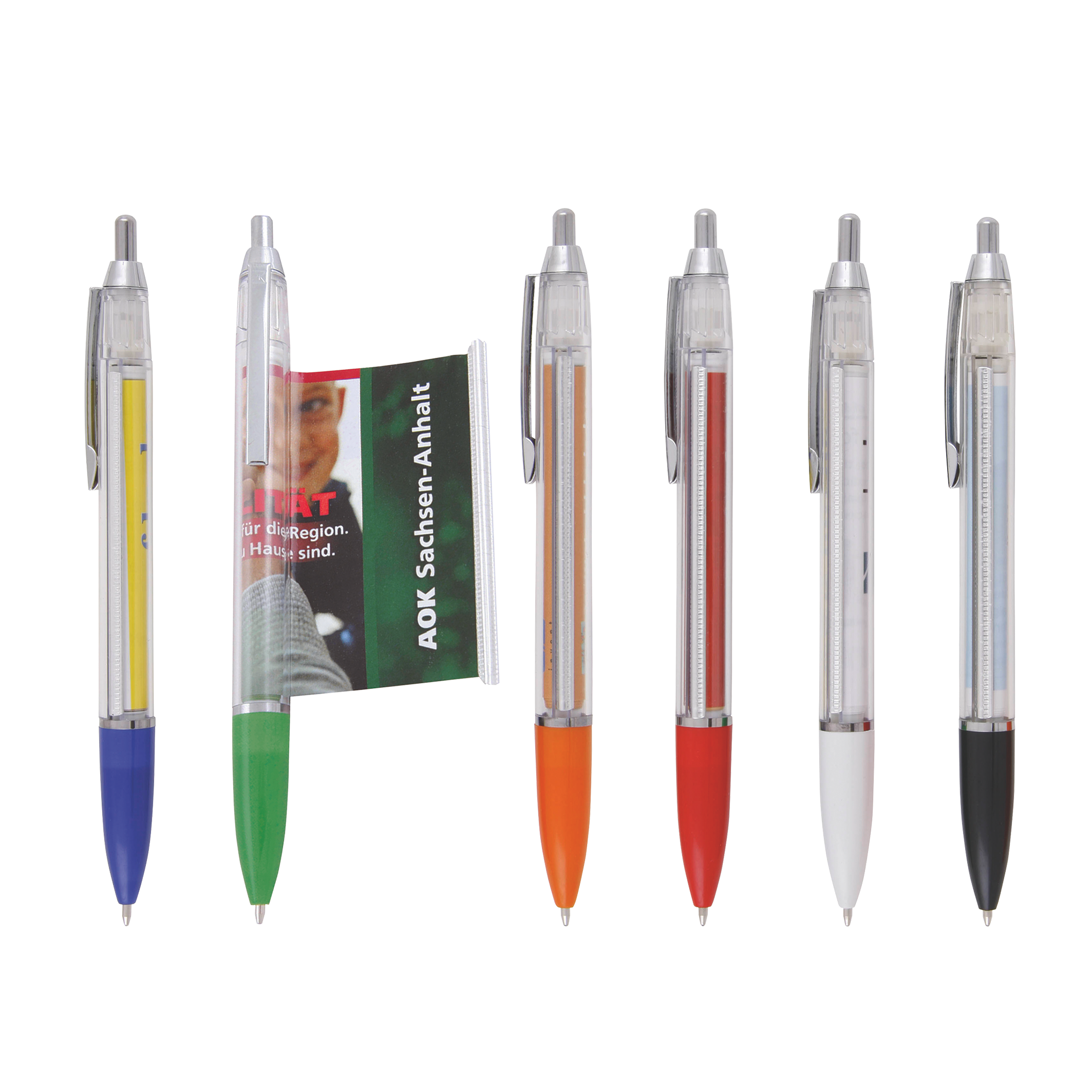 SYLT BANNER Kunststoff Kugelschreiber Peekay. Kugelschreiber mit einzigartigem ausziehbarem Banner im transparenten Schaft, mit farbiger Spitze und silberfarbigem Clip, Ring und Drücker. Banner beidseitig bedruckbar bis zu 4-C, Druck auf Schaft möglich, mit blauschreibender Kunstoffmine X-20.