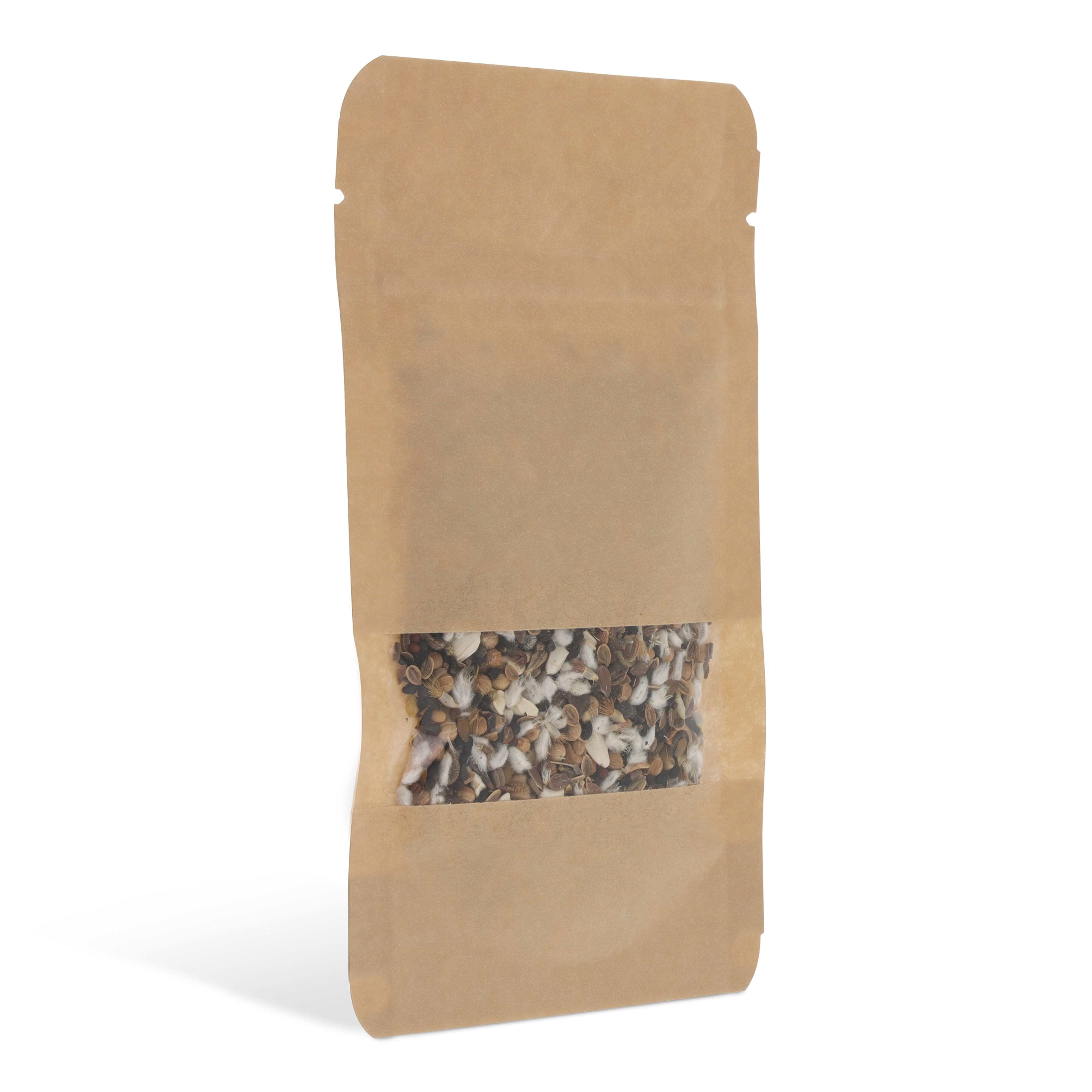 Kraftpapiertüte mit 4 Gramm getrockneten Blumensamen, geeignet für 2 m² Blumen. Ein wirklich nachhaltiges Geschenk.