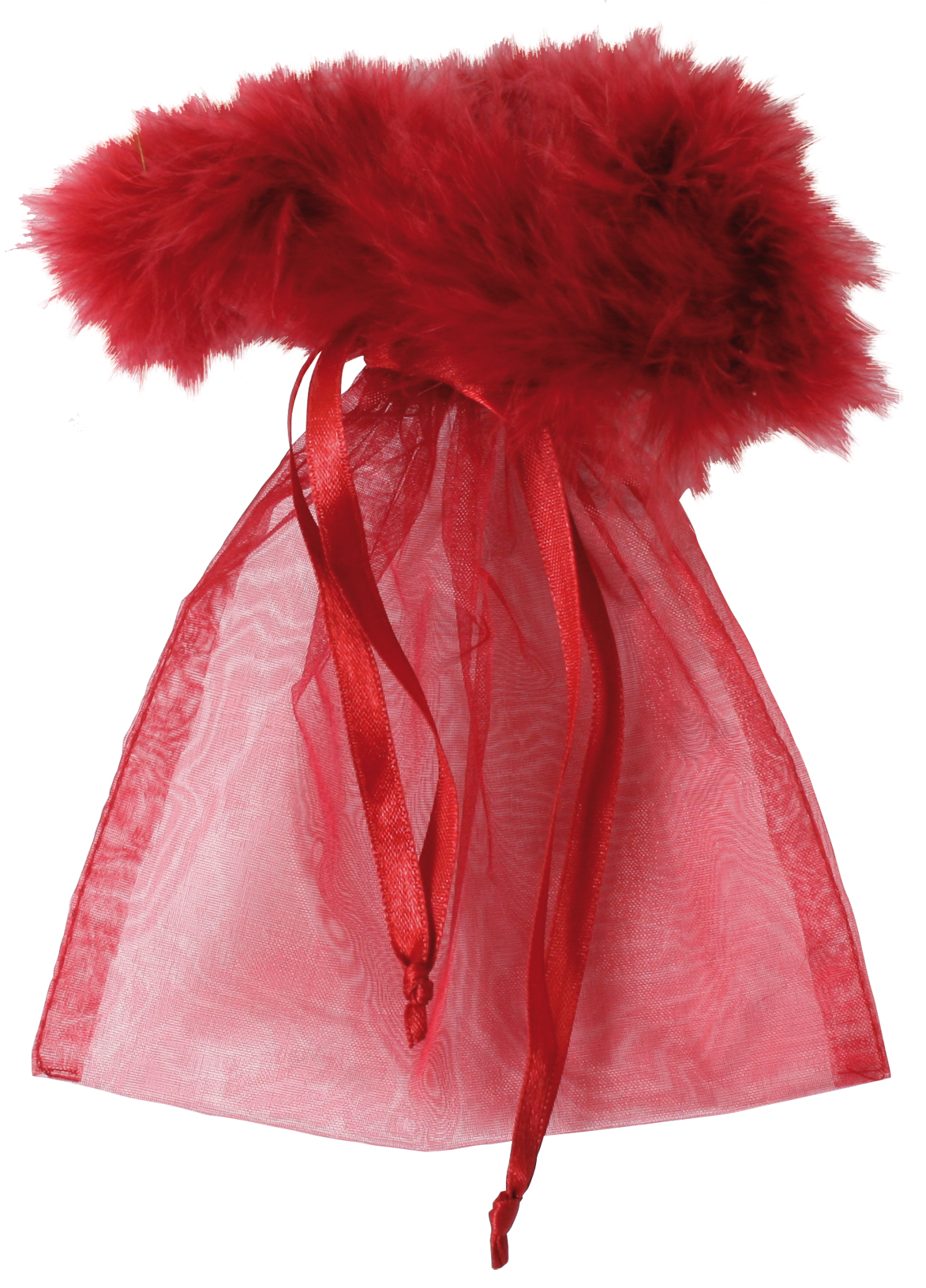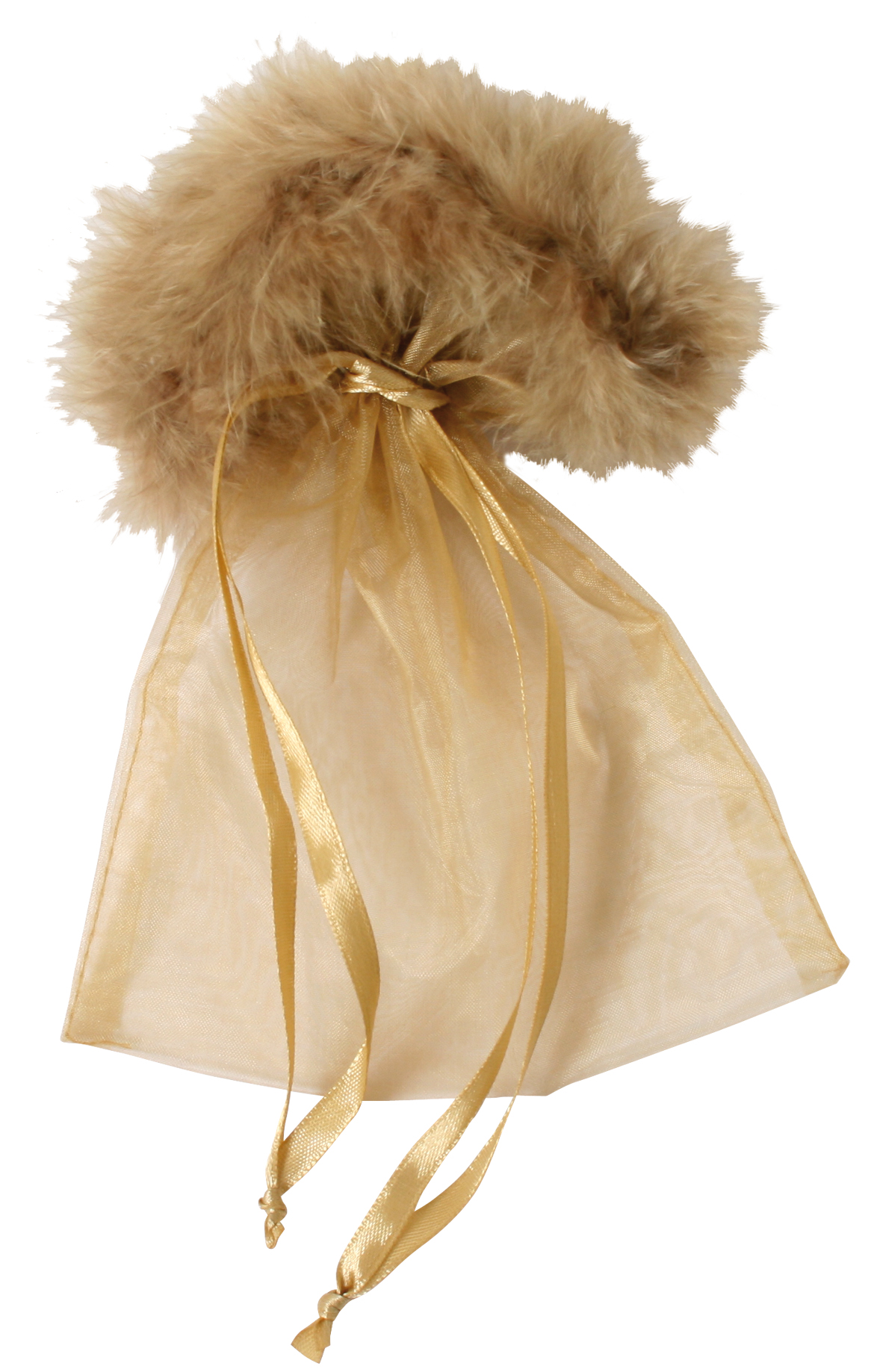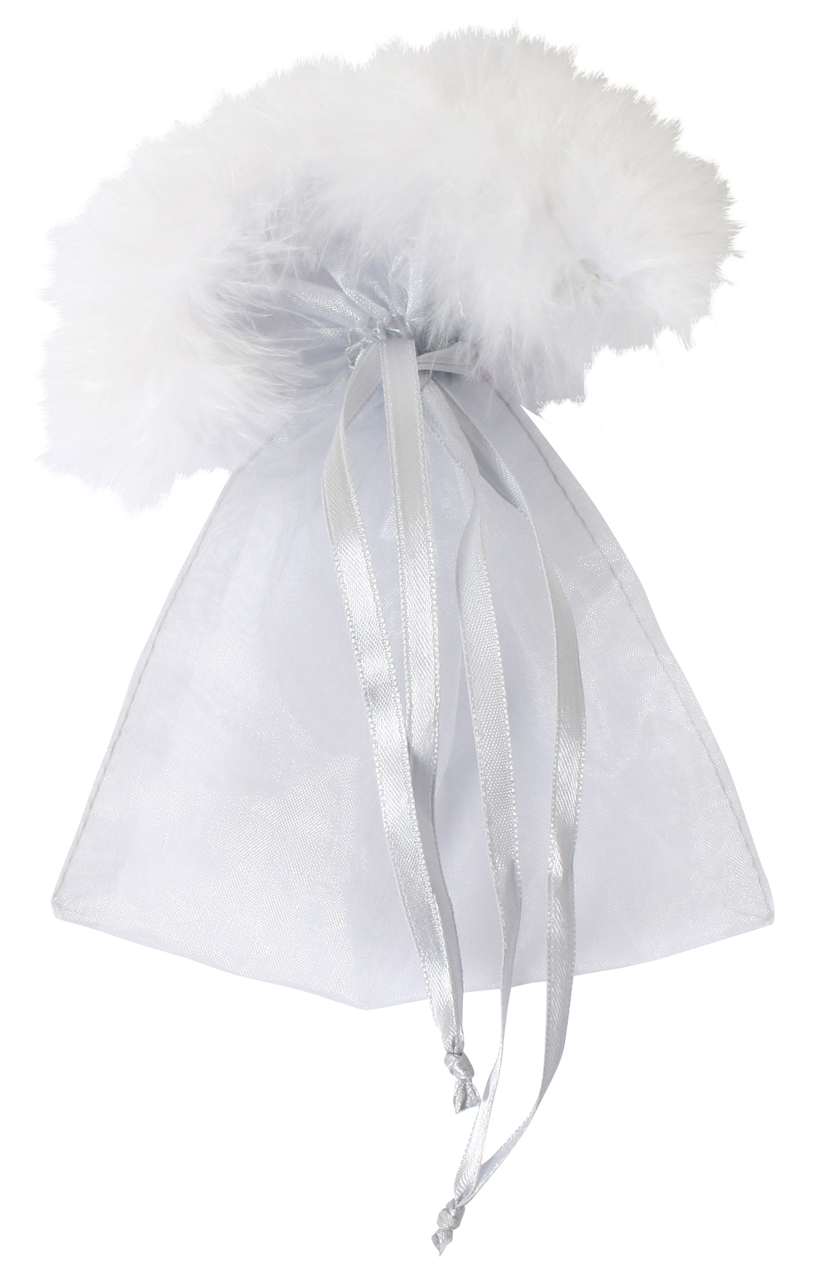 Exklusiver Stoffbeutel mit Federdekor und Stoffband. Verschiedene Farben sortiert.
