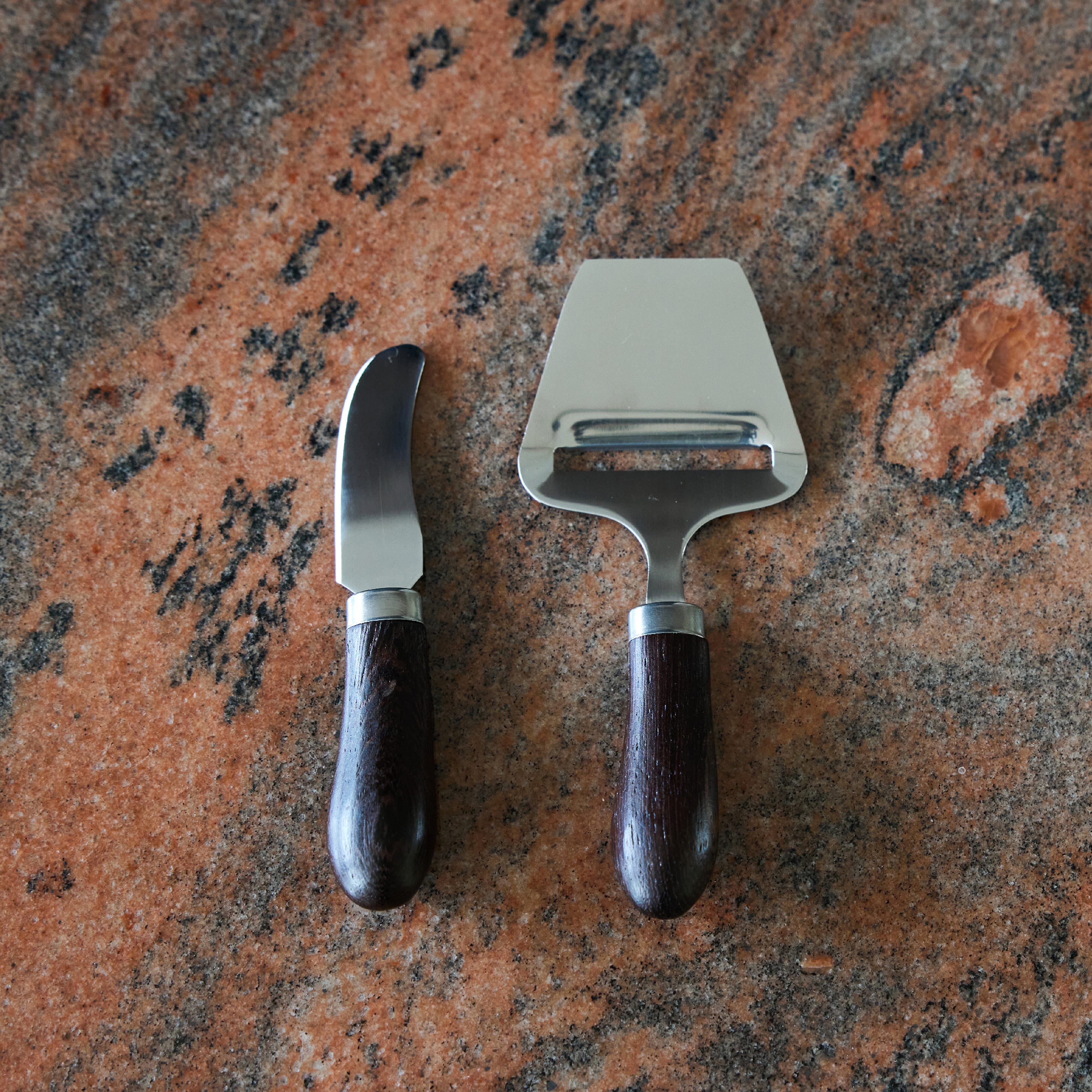 Käseschneider und Buttermesser in unserer Lieblingskombination aus rostfreiem Stahl und schön geschwungenem Griff aus schokoladenbraunem Wengeholz. Die Kombination ist aufregend, ein Klassiker, aber mit einem robusten Touch - im Set geliefert.