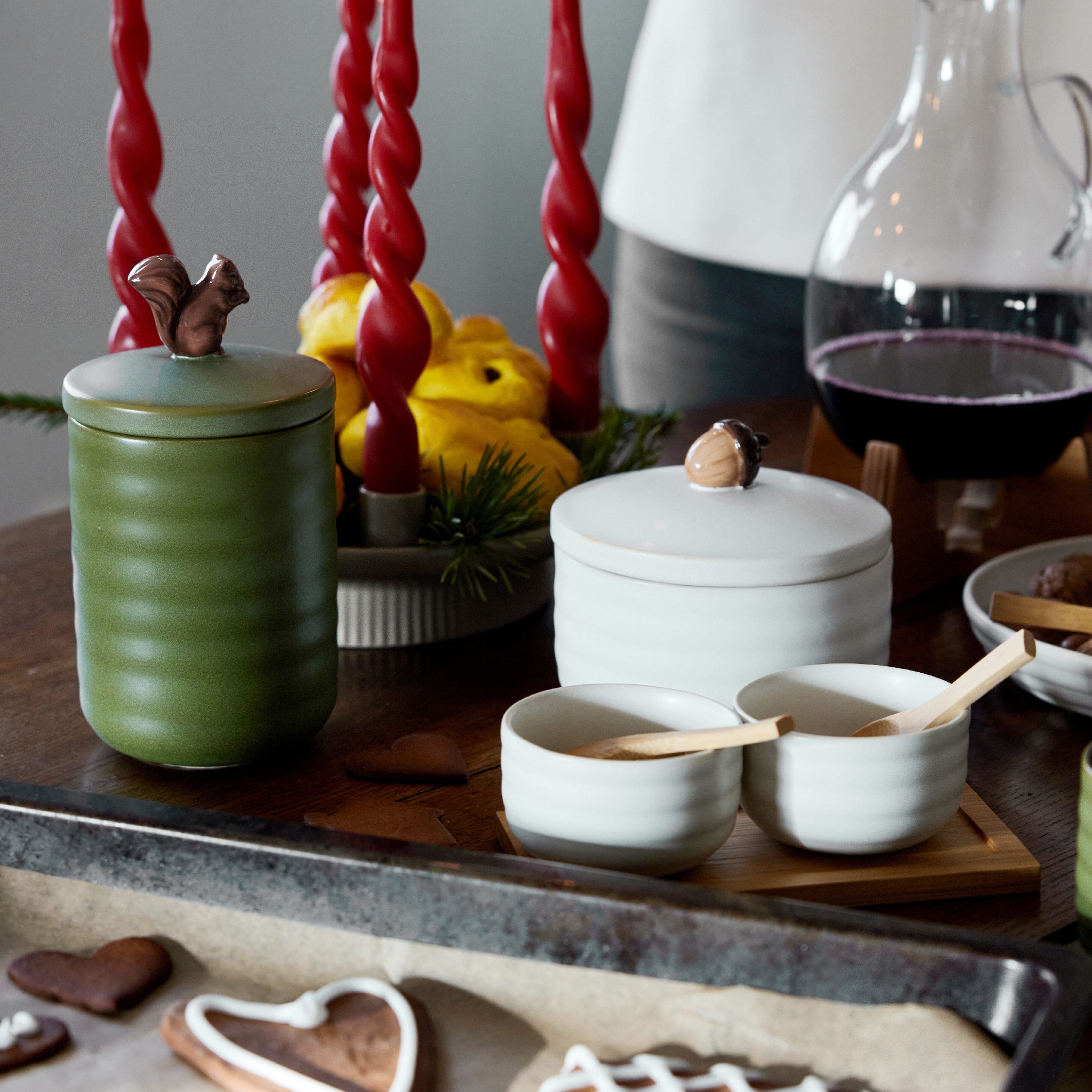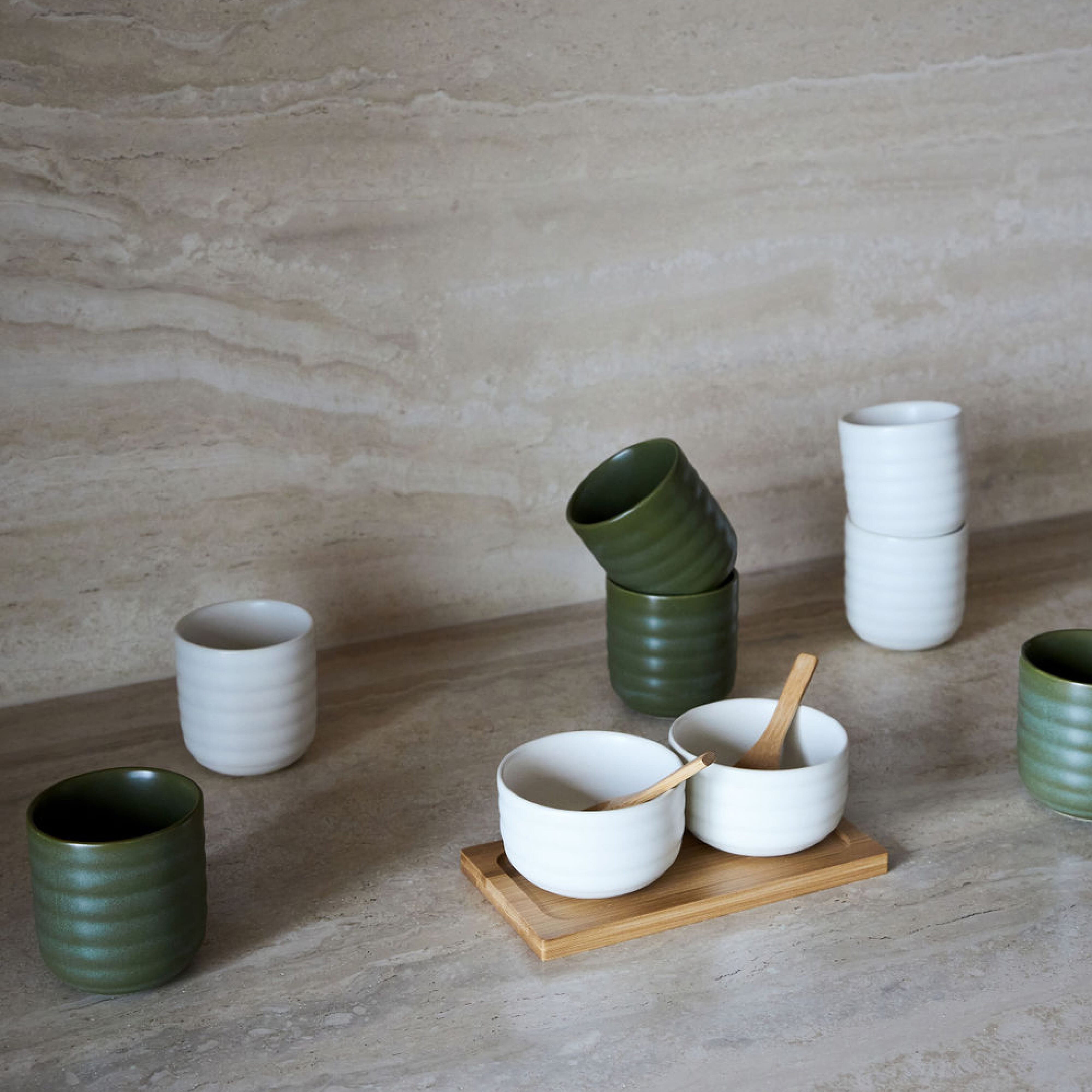 Die Schälchen Ellen werden paarweise mit zwei Löffeln auf einem hübschen kleinen Bambustablett geliefert. Sie sind aus Steingut in einem natürlichen Beigeton gefertigt. Sie sind die perfekten Schalen für Glühwein, aber auch für andere Dinge im Rest des Jahres.