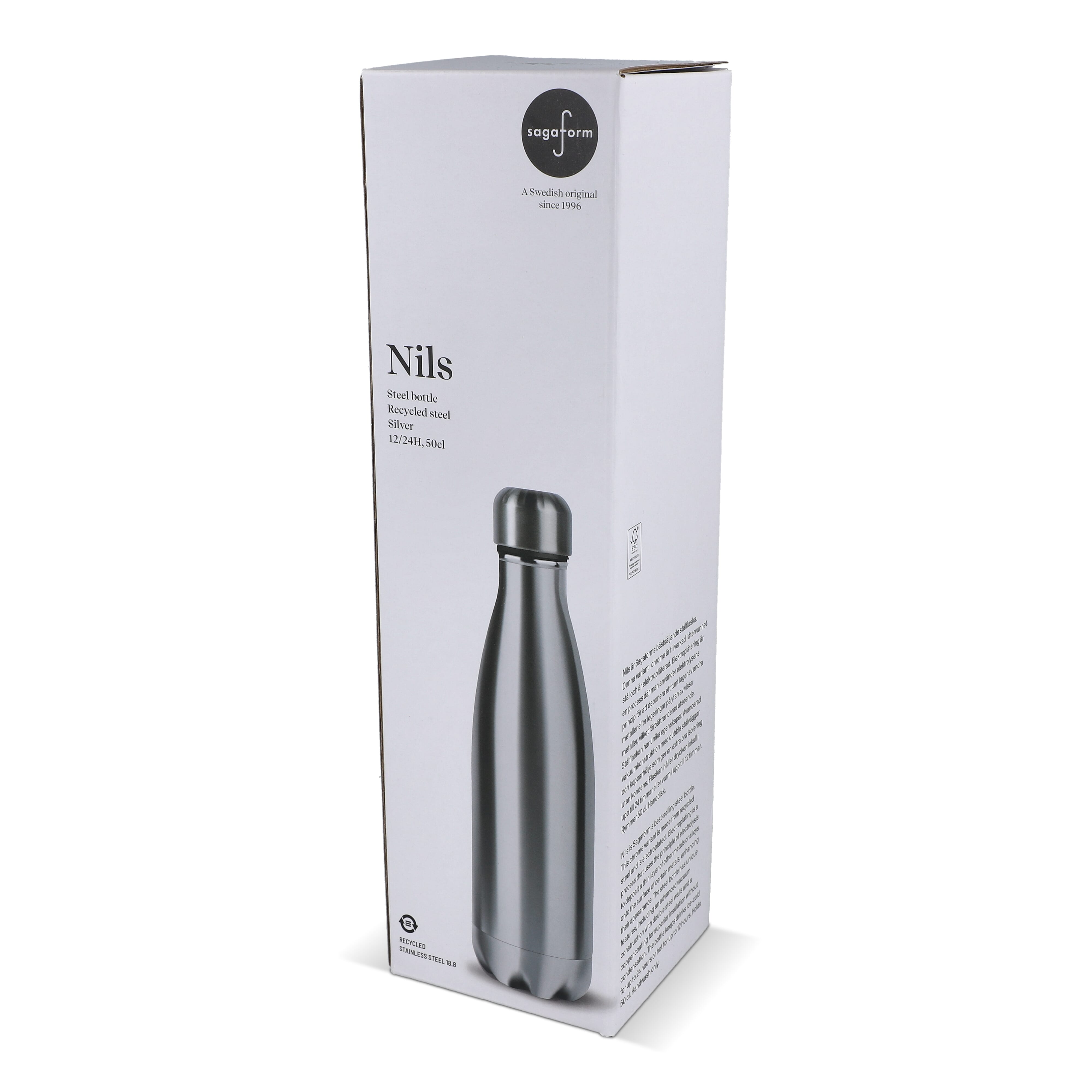 Die Sagaform Nils Stahlflasche in Chrom vereint Stil und Funktion. Aus recyceltem Stahl mit glänzender Oberfläche hält sie Getränke bis zu 24 Stunden kalt oder 12 Stunden heiß – ganz ohne Kondenswasser. Ideal für Lasergravur, per Hand zu spülen und in Geschenkbox verpackt.