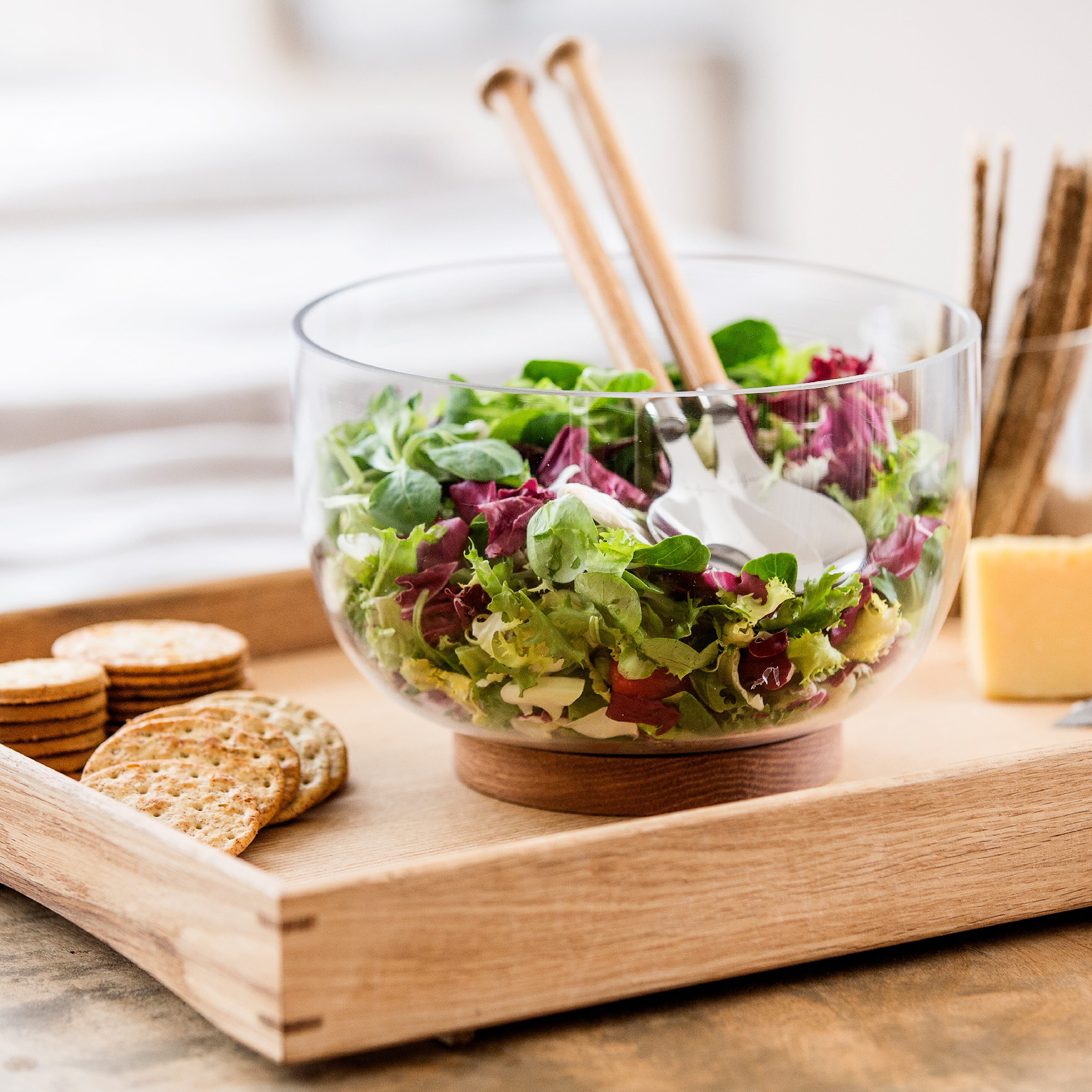 Servierschüssel in coolem Design mit einer Bodenplatte aus massiver Eiche, die abnehmbar ist und die darunter befindlichen Gegenstände schützt. Perfekt für Salat oder Obst. Denken Sie daran, die Bodenplatte regelmäßig zu ölen.
