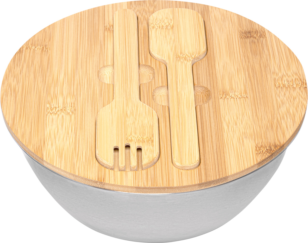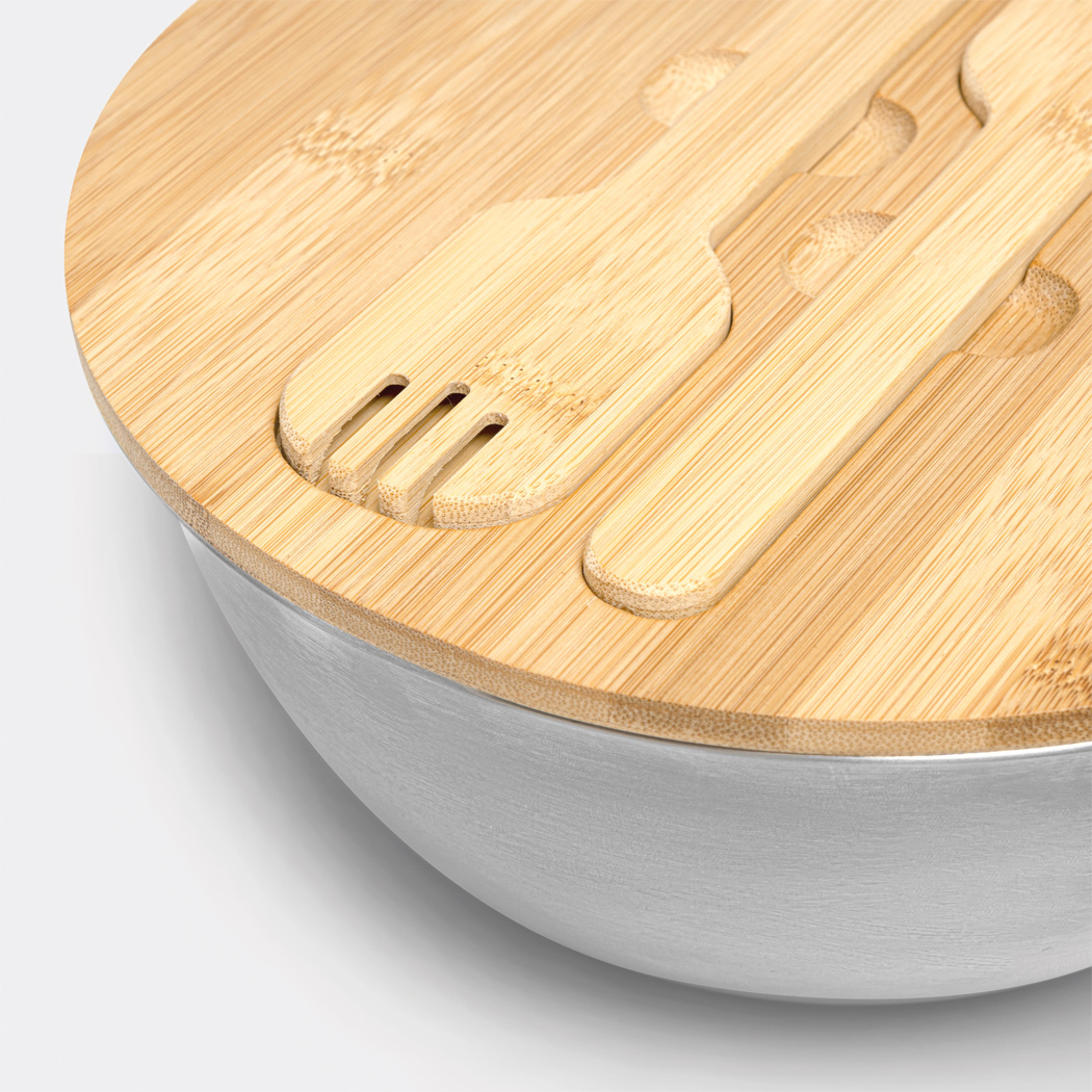 Salatschüssel EAT HEALTHY: große Edelstahlschale mit Bambus-Deckel und durch Magnete im Deckel befestigtes Bambus-Salatbesteck, Füllmenge ca. 3 Liter