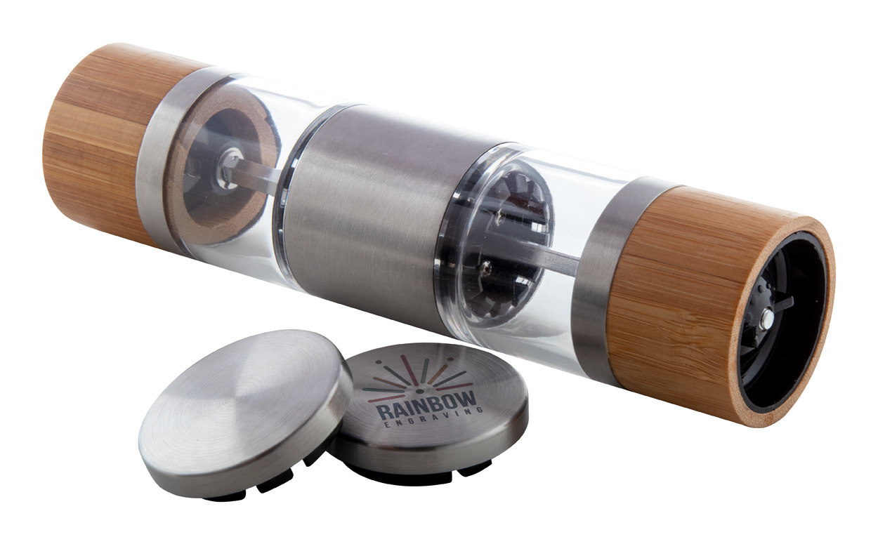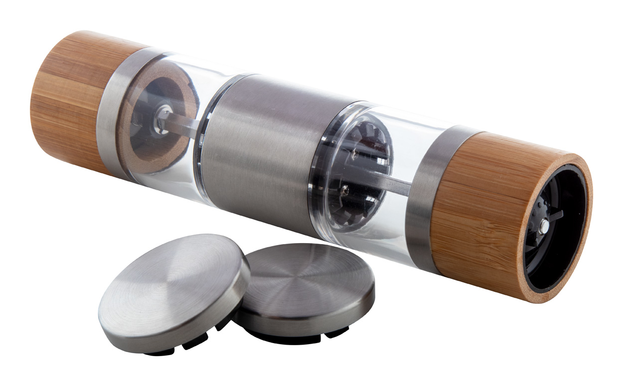 Zweiseitige Salz- und Pfeffermühle mit Keramikmahlwerk. Material: Edelstahl und Bambus.