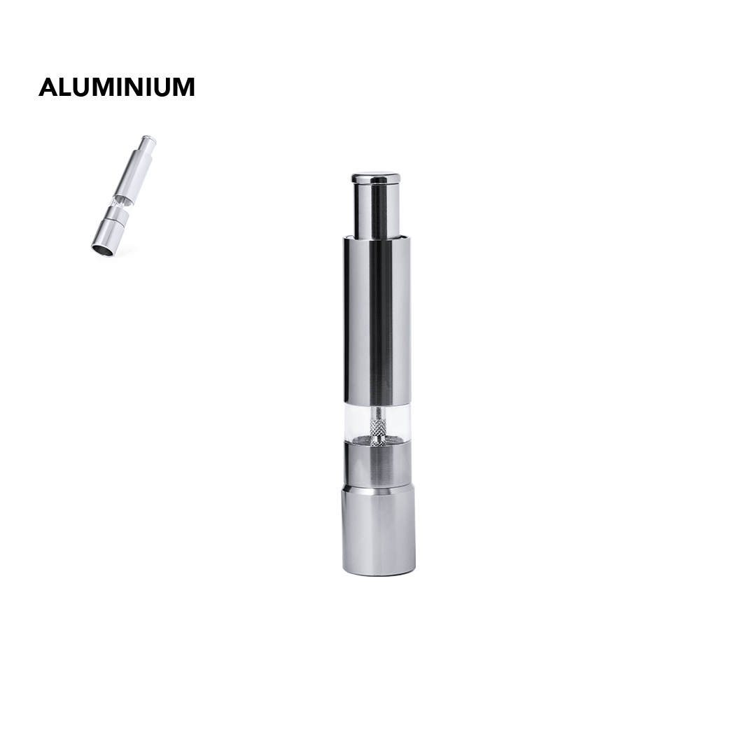 Manuelle Salz- und Pfeffermühle aus Aluminium. Ideal zum Hinzufügen der gewünschten Gewürze mithilfe der manuellen Druckknopfmühle. Mit einem Fenster zur Anzeige des Gewürzfüllstands. Präsentiert in einer Kraft-Design-Box.