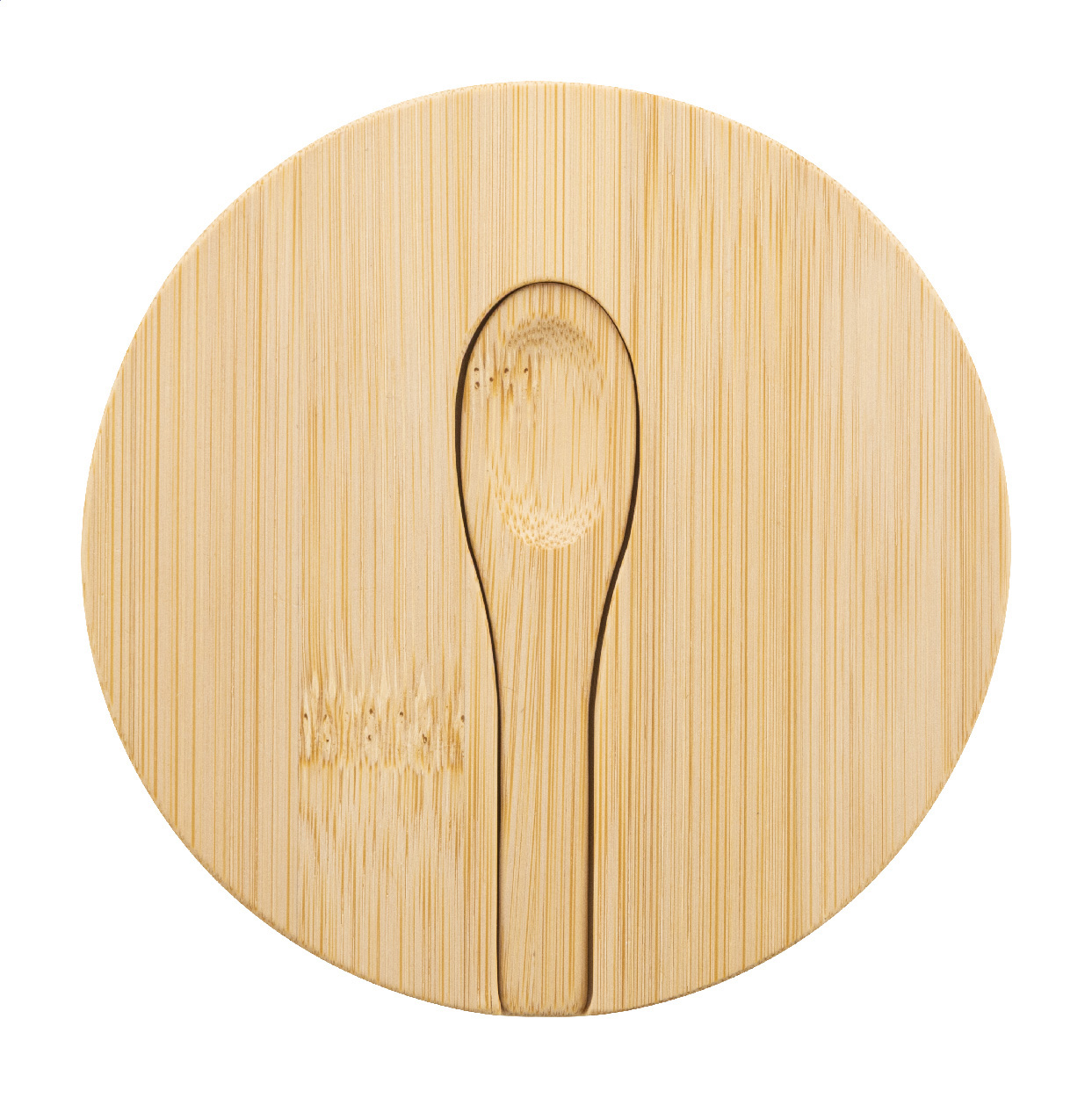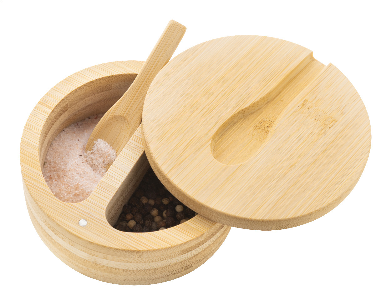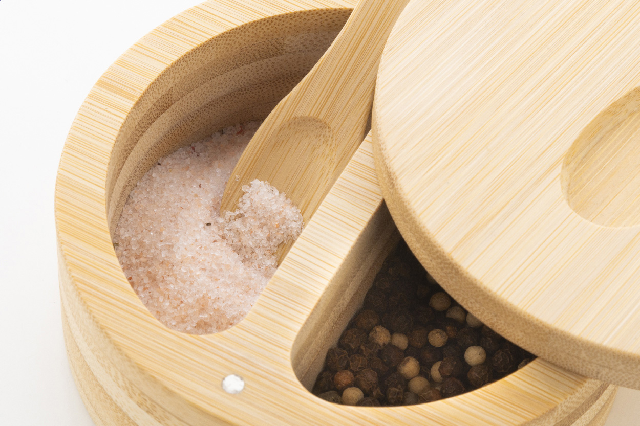 Salz- und Pfefferstreuer aus Bambus mit zwei Fächern und magnetischem Drehdeckel. Inklusive integriertem Servierlöffel.