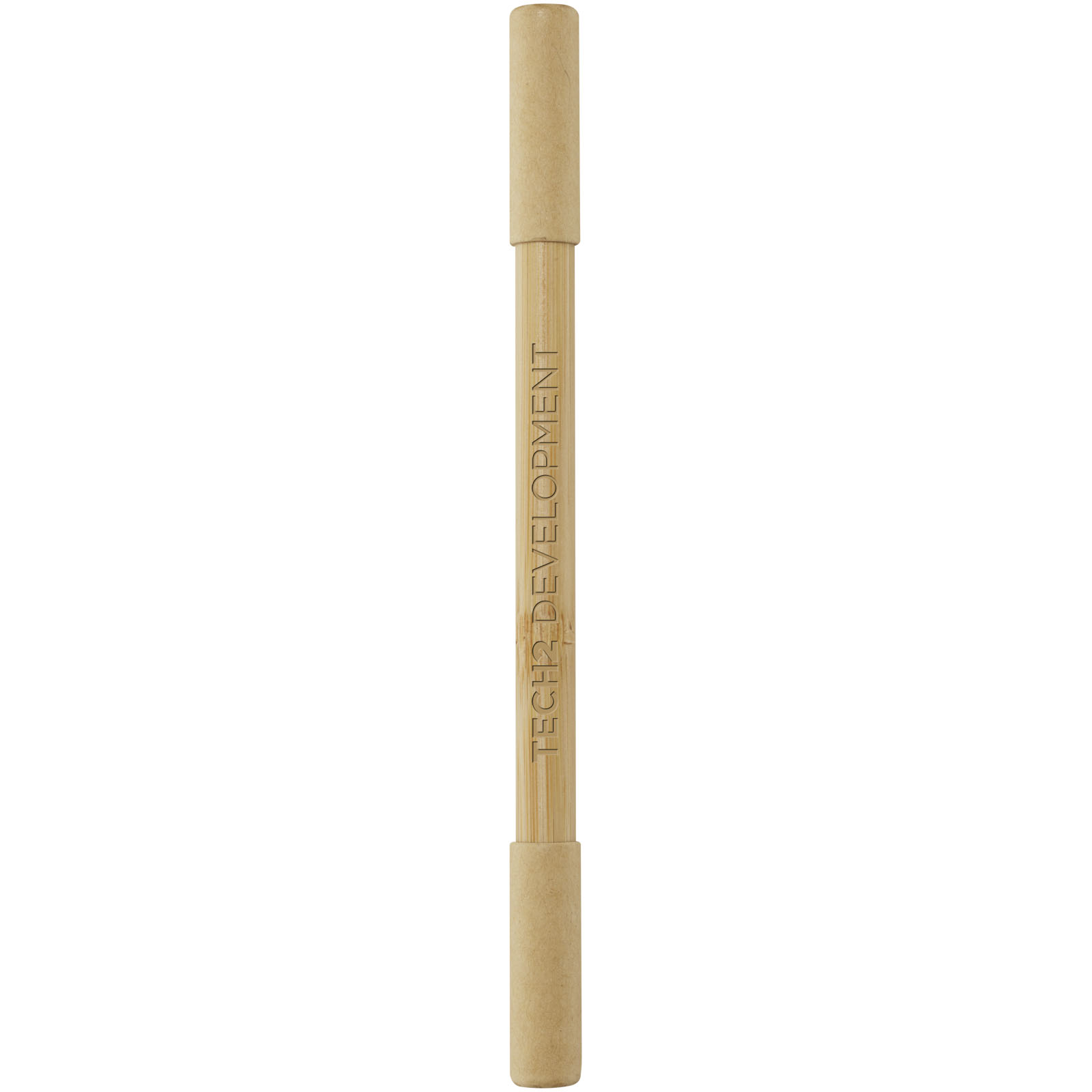 Der Samambu Bambus Duo-Stift hat zwei Köpfe: Ein Kugelschreiber und ein Kugelschreiber ohne Tinte. Für den Kugelschreiber ohne Tinte sind keine Tintenpatronen oder Nachfüllminen erforderlich. Die schwarze Grafitspitze des Stiftes hinterlässt sichtbare Spuren, wenn sie mit der Schreibfläche in Kontakt kommt. Wenn Sie sich für einen Kugelschreiber aus Bambus entscheiden, treffen Sie eine nachhaltigere Wahl und fördern die Verwendung erneuerbarer Materialien. Der Kugelschreiber hat schwarze Tinte, eine Spitze von 1,00 mm und eine Schreiblänge von 600 Metern. Schreiblänge des Kugelschreibers ohne Tinte: 1500 Meter.