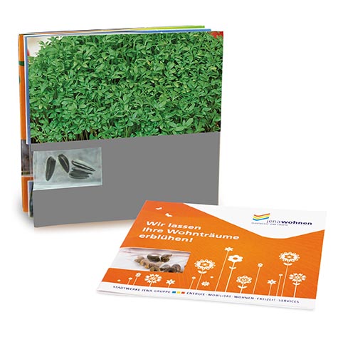 Ein ideales Format hat der quadratische Botschafter für Mailings als Beilage oder Giveaway. Das originelle Sichtfensterbietet Einblicke auf den Samen Ihrer Wahl. Beide Seiten der Karte können komplett individuell gestaltet werden.