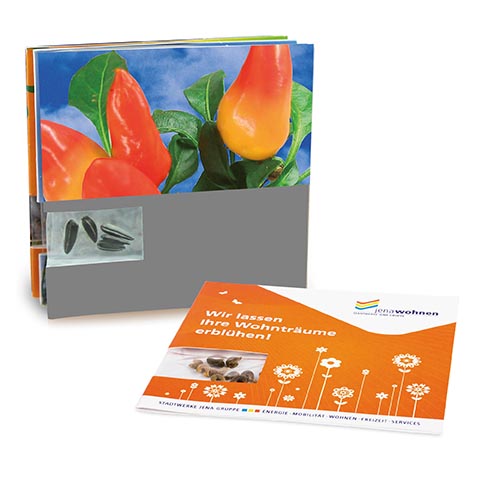 Ein ideales Format hat der quadratische Botschafter für Mailings als Beilage oder Giveaway. Das originelle Sichtfensterbietet Einblicke auf den Samen Ihrer Wahl. Beide Seiten der Karte können komplett individuell gestaltet werden.