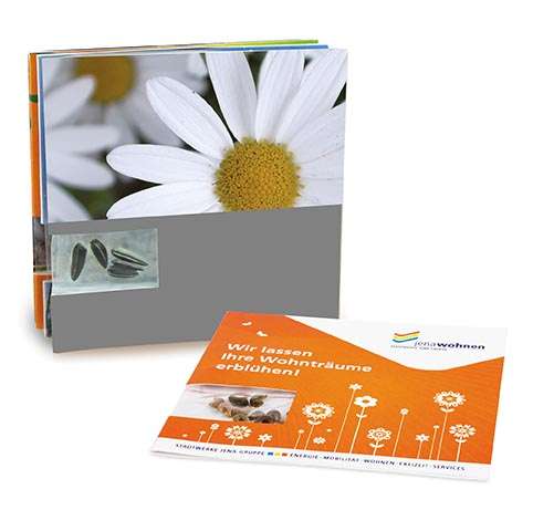Ein ideales Format hat der quadratische Botschafter für Mailings als Beilage oder Giveaway. Das originelle Sichtfensterbietet Einblicke auf den Samen Ihrer Wahl. Beide Seiten der Karte können komplett individuell gestaltet werden.