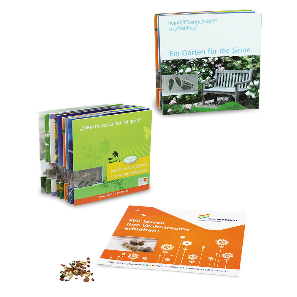 Ein ideales Format hat der quadratische Botschafter für Mailings als Beilage oder Giveaway. Das originelle Sichtfensterbietet Einblicke auf den Samen Ihrer Wahl. Beide Seiten der Karte können komplett individuell gestaltet werden.