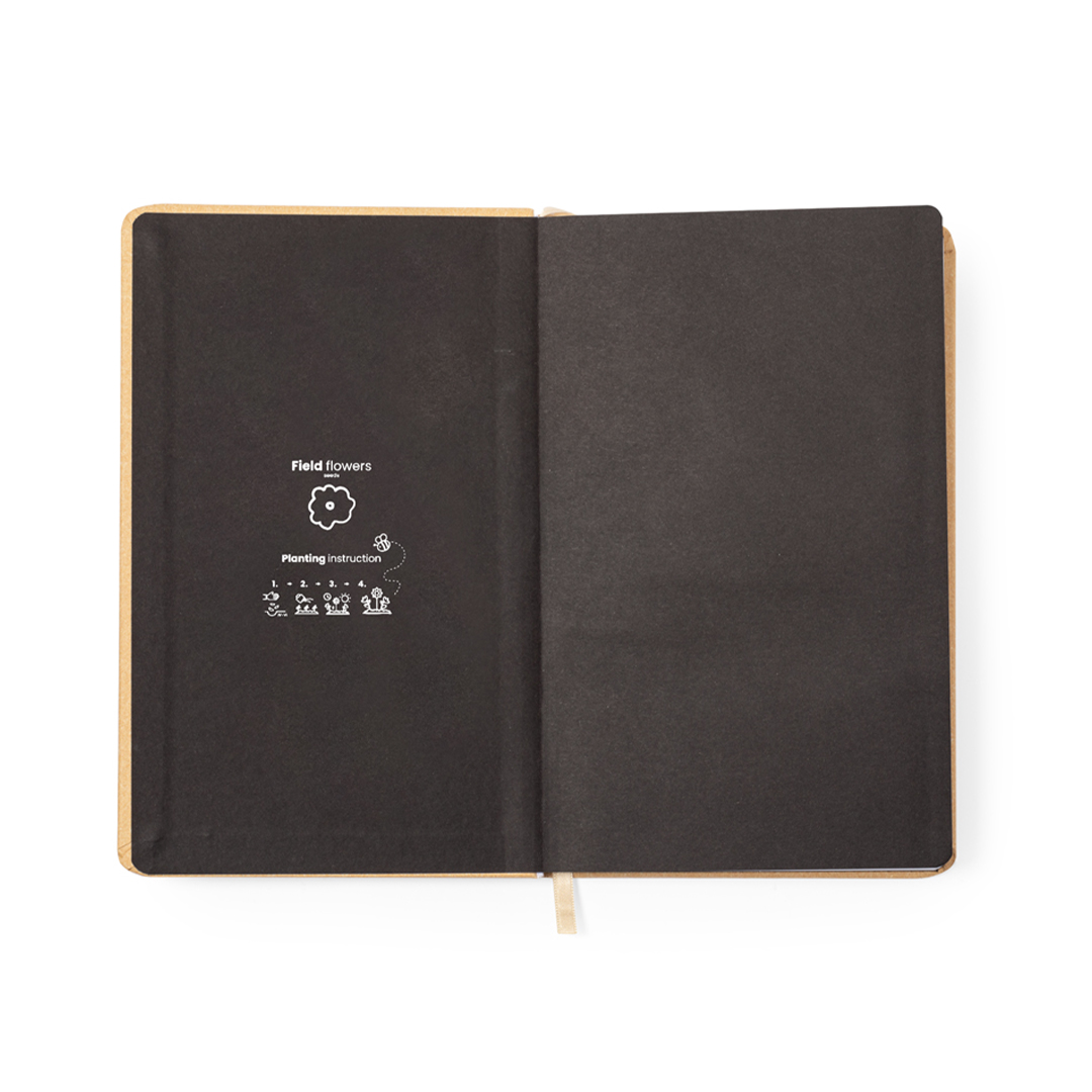 Saatgut-Notizbuch aus widerstandsfähigem, recyceltem Karton. Mit festem Einband, Lesezeichen und 80 linierten Blättern aus Recyclingpapier. Außerdem enthält der vordere Umschlag eine Kapsel mit Wildblumensamen in verschiedenen Farben und mit Pflanzanweisungen auf der Rückseite des Umschlags. Der Recycling-Karton stammt aus der Wiederverwendung von überschüssigem Produktions- und Recycling-Papier am Ende seiner Nutzungsdauer, was ihn zu einer umweltfreundlichen und nachhaltigen Alternative macht.