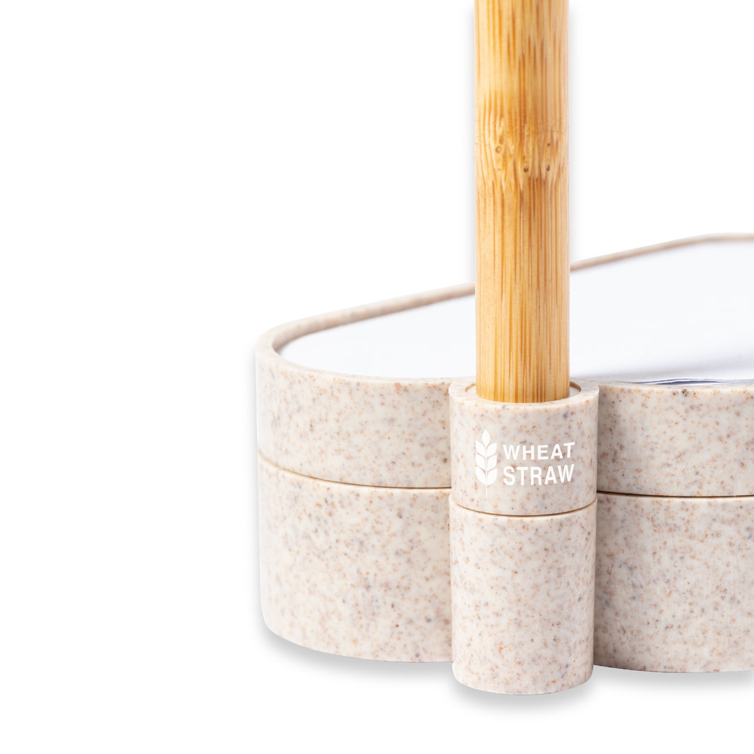 Linie Natur Samen-Notizblockhalter mit originellem Wolkendesign. Enthält:Notizblock mit 80 weißen Zetteln in Form einer Wolke. Sockel mit Stiftehalter und zwei Fächern, inklusive einem Blatt Saatgutpapier. Hergestellt aus Weizenstroh, um die Verwendung natürlicher Rohstoffe zu fördern und Schadstoffemissionen zu reduzieren. Kugelschreiber Pointer mit Bambusgehäuse, Kappe und Details aus Weizenstroh. Mit blauschreibender Tinte. Das Set wird in einer individuellen Design-Kraftbox präsentiert, mit einer Bedienungsanleitung in Englisch und Spanisch.