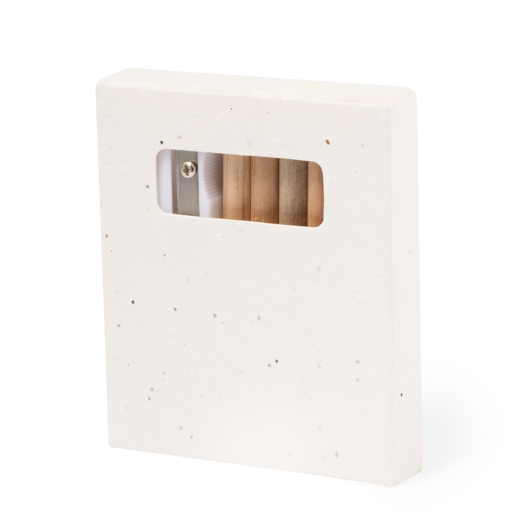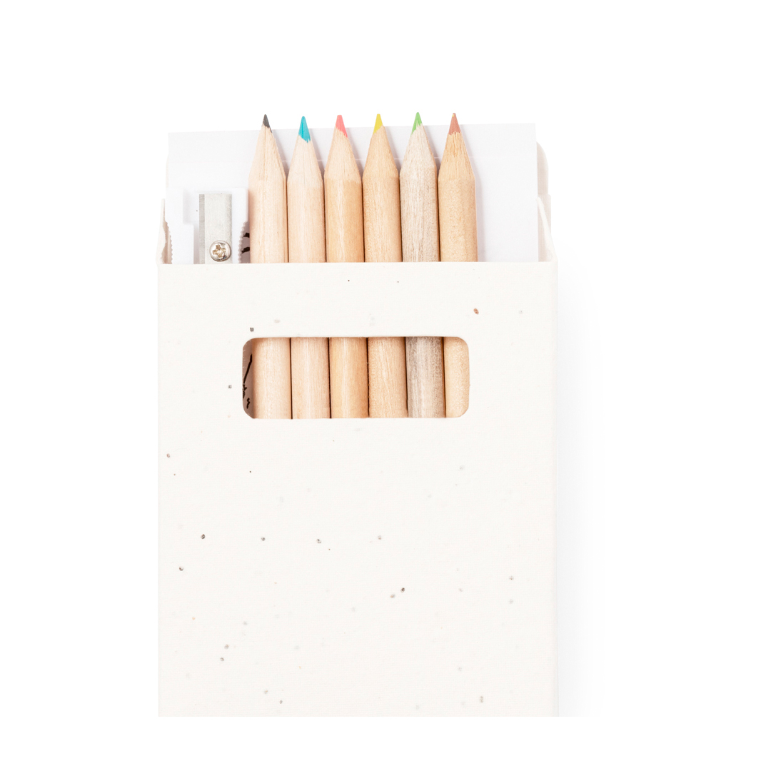 Set aus 6 Stiften mit Malschablonen und Anspitzer, präsentiert in einer natürlichen Kartonschachtel mit Samen. Holzstifte mit rundem Körper mit natürlicher Oberfläche und Minen in einer breiten Palette von Farben. In der Schachtel sind Petuniensamen enthalten, so dass der Karton am Ende seiner Nutzungsdauer bepflanzt werden kann. Blumen in verschiedenen Farben, mit Pflanzanleitung auf der Rückseite.