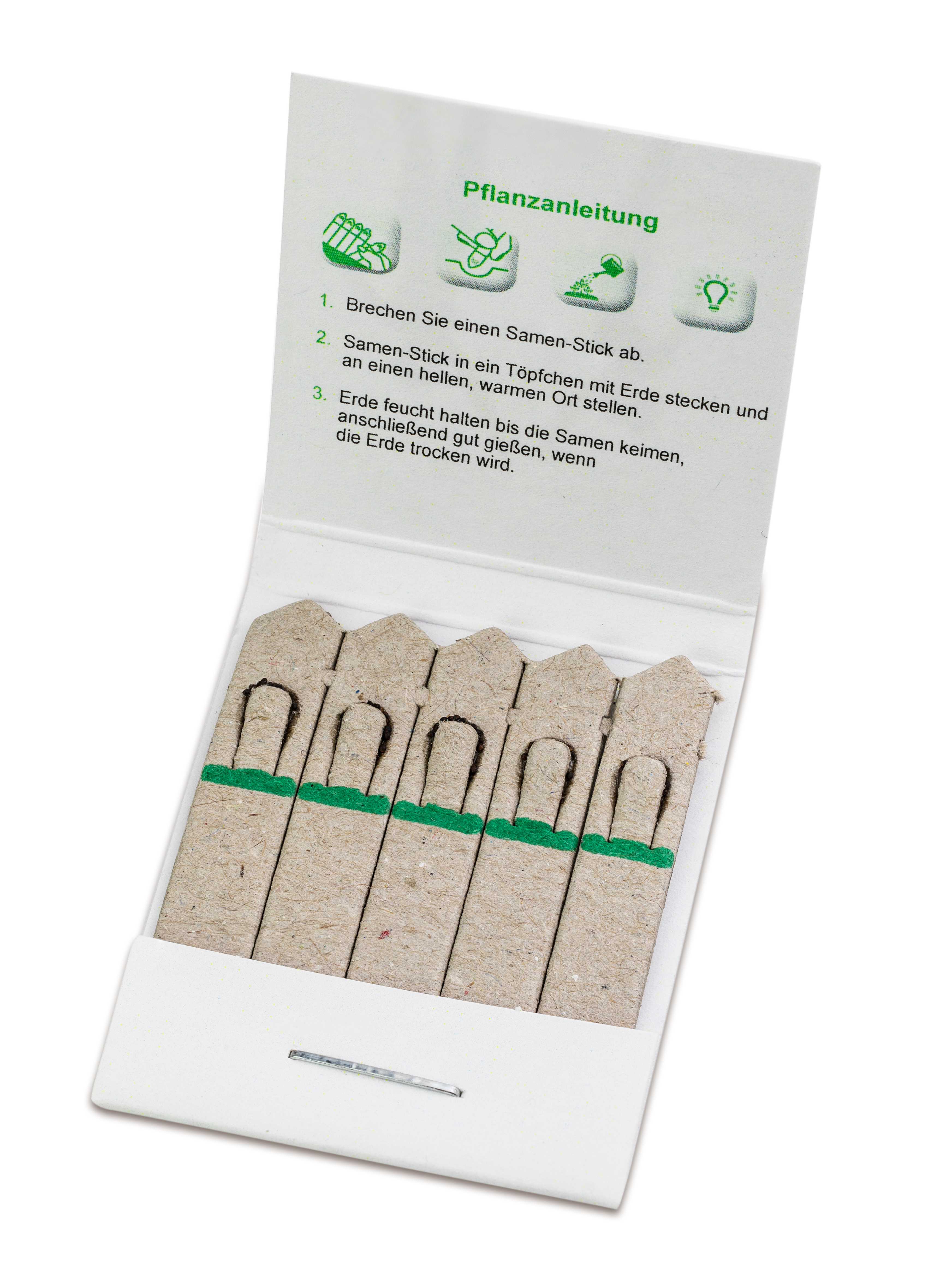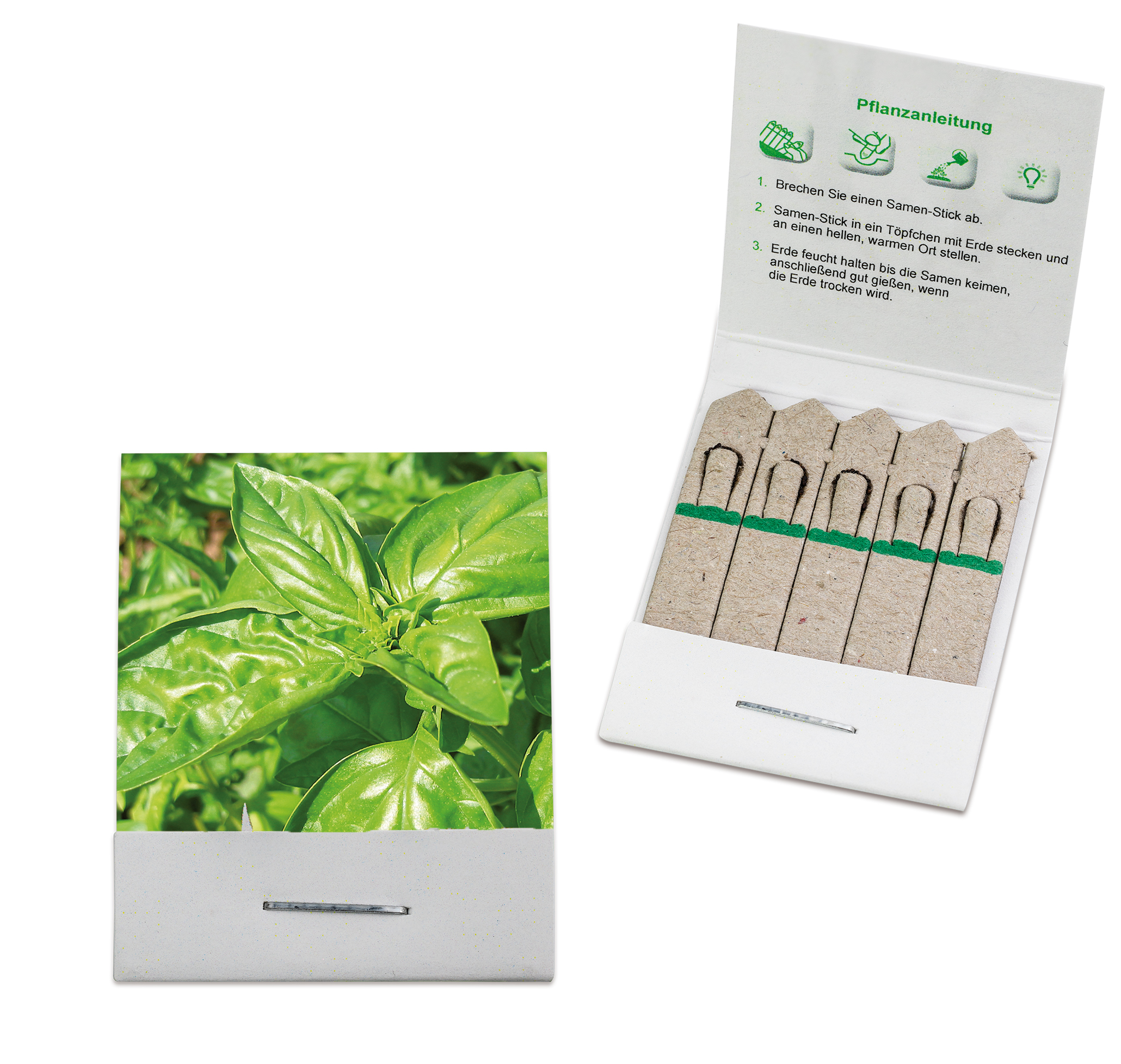 Frühlings- und Sommergrüße oder einfach von Herzen Danke sagen! Anlässe für einen Werbegruß gibt es viele. Mit den Samen-Sticks gelingt einemdabei noch ein Überraschungseffekt: Denn im flachen Briefchen aus Papier erwarten einen keine Streichhölzer, sondern Werbegrüße mit Samen, die sich durch die flache Form und das geringe Gewicht perfekt als Selfmailer eignen. Auf fünf kleine Sticks aus Papier werden wahlweise Basilikum, Fichtensamen, Wildblumen- oder Kräutermischung aufgebracht. Wird ein Stick in die Erde gesteckt und gegossen, sprießt schnell ein kleines Pflänzchen. In Herzform, Standard-Briefchen oder als lustige Biene können sie je nach Werbethema die Botschaft durch die Form unterstützen und individuell angepasst werden. Das Briefchen selbst ist auf vier Seiten individuell gestaltbar. Eine Pflanzanleitung komplettiert das Werbemittel.