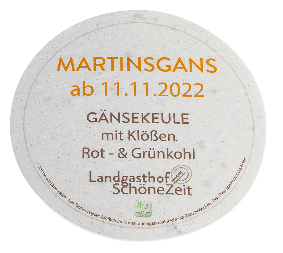 Bierdeckel haben als Werbefläche Tradition. Oftmals werden auf den Untersetzern humorvolle Slogans aufgedruckt und beim kühlen Bier oder einer Limonade in entspannter Atmosphäre wird die Werbung optimal wahrgenommen. Mögliche Samensorten: Blumenmischung, Kräutermischung, Mohnblume, Thymian.