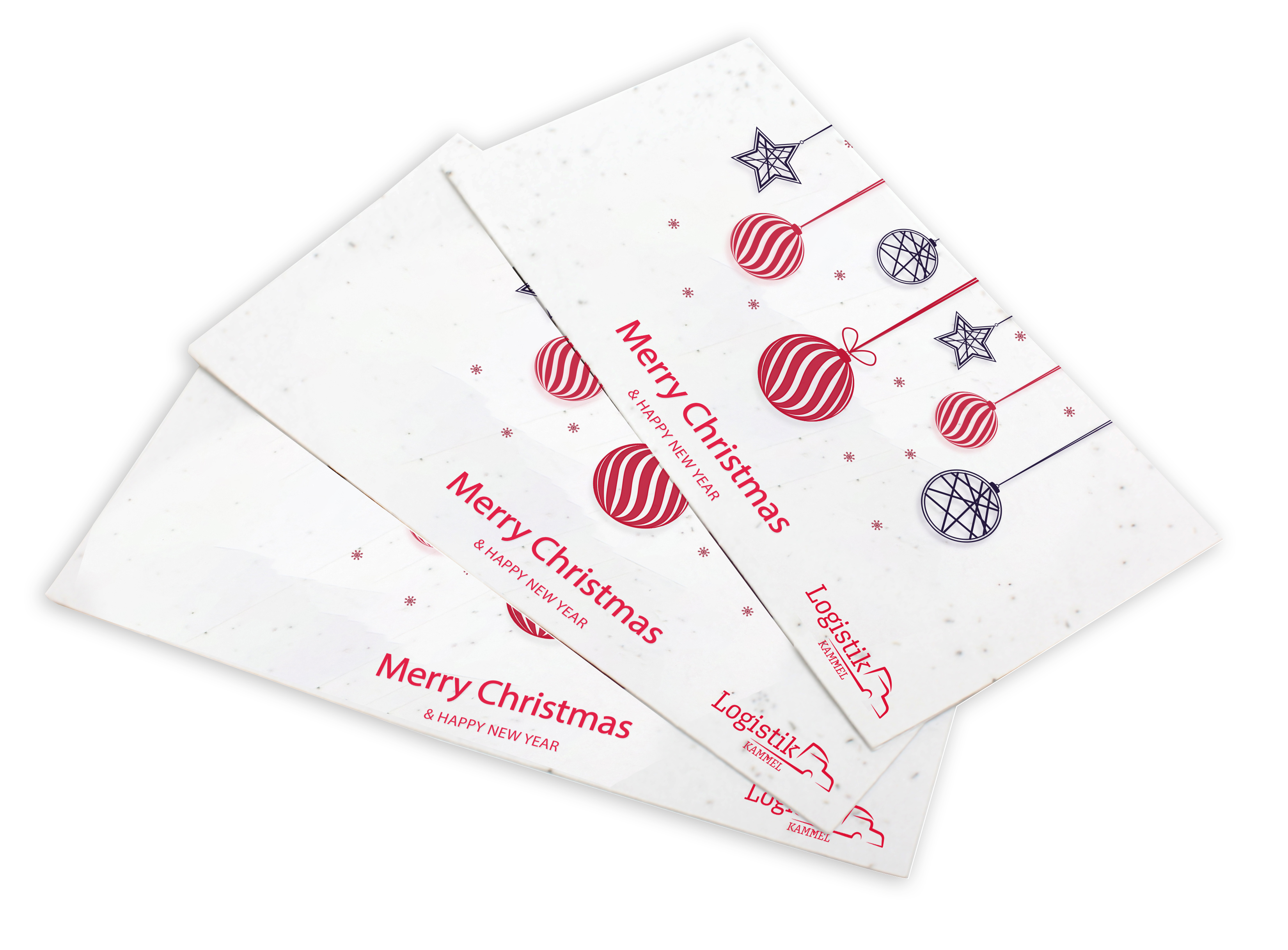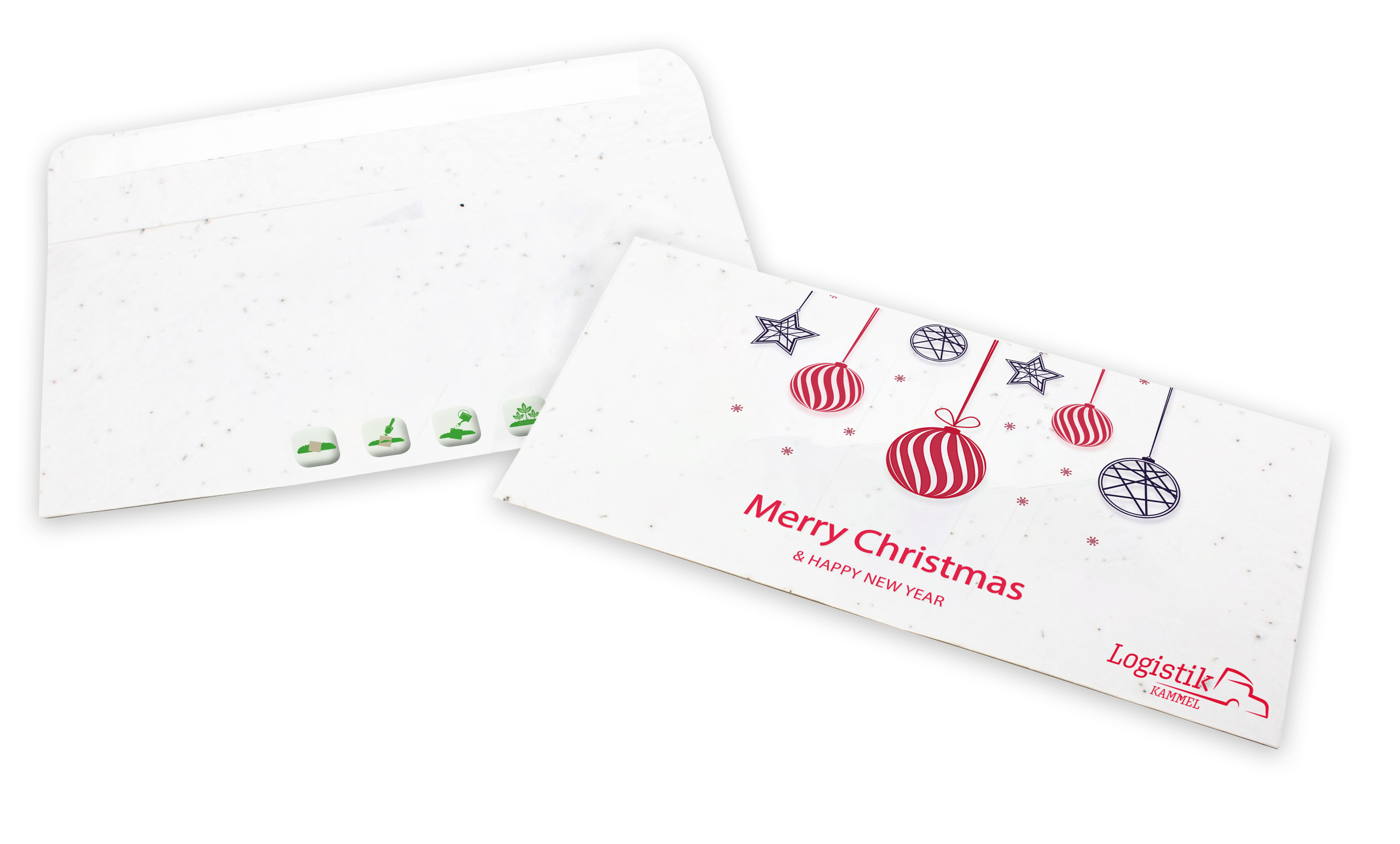 Oftmals ist ein Kuvert ein reines Wegwerfprodukt. Das Gegenteil ist beim DIN-lang Umschlag aus Samenpapier der Fall. In das Papier des Briefumschlages sind Fichtensamen eingearbeitet, die in Kombination mit Wasser und Erde zum zukünftigen Weihnachtsbaum heranwachsen. Somit stellt schon der Umschlag ein sinnvolles Geschenk dar. Das Kuvert selbst ist rundum bedruckbar, hat einen Haftklebestreifen und das Papier ist vollständig im Boden abbaubar. Mit gutem Gewissen unter Einhaltung des grünen Gedankens, kann so der Advents- oder Weihnachtsgruß zum Kunden geschickt werden. Das Samenpapier enthält Fichtensamen.
