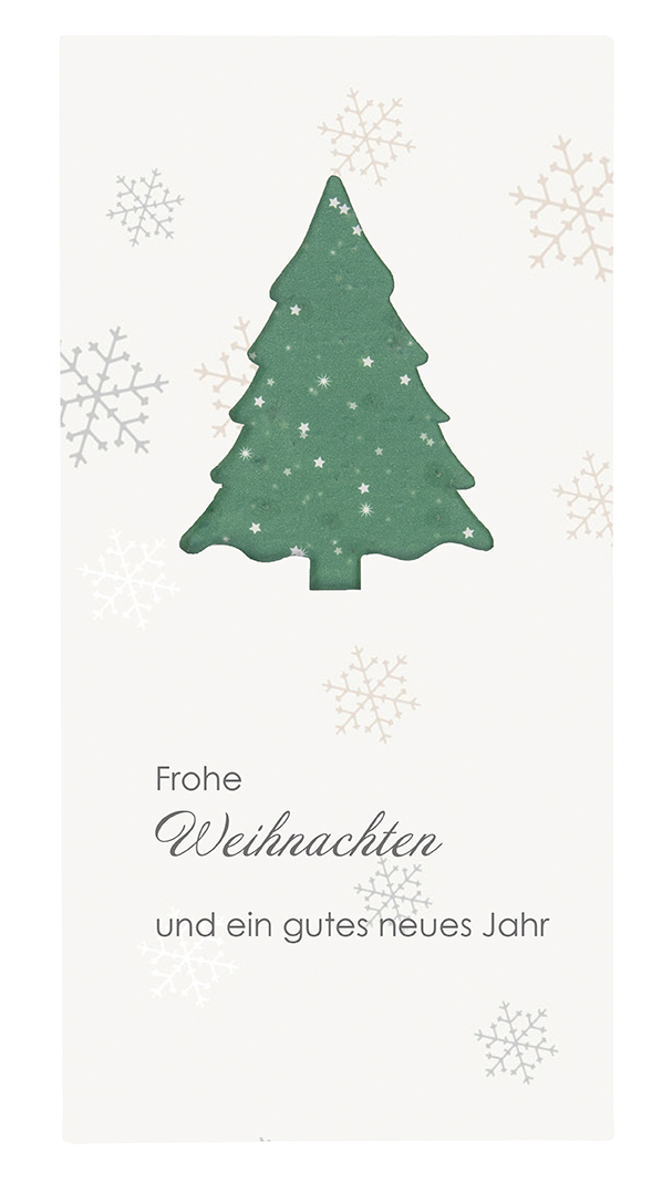 Eine DIN lang Karte, in weiß-transparentem Umschlag, beinhaltet ein dekoratives Samenpapier in Tannenbaumform, in das Fichtensamen eingearbeitet sind. Einfach auf Erde gelegt und mit Wasser benetzt, zieht der Kunde den Weihnachtsbaum von morgen heran – zuerst auf dem Fenstersims und später im Garten. Das im Fichtensamen enthaltene ätherische Öl kann in manchen Fällen minimale Flecken auf der Karte hinterlassen.
