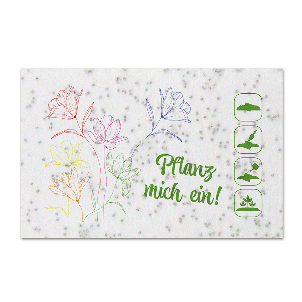 Möchten Sie einen bleibenden Eindruck bei Ihren Geschäftspartnern hinterlassen? Visitenkarten aus Samenpapier sind eine kreative und individuelle Lösung. Diese Karten werden nach Ihren Wünschen gestaltet und enthalten Samen, die im Papier integriert sind. Mögliche Samensorten: Blumenmischung, Kräutermischung, Mohnblume, Thymian.