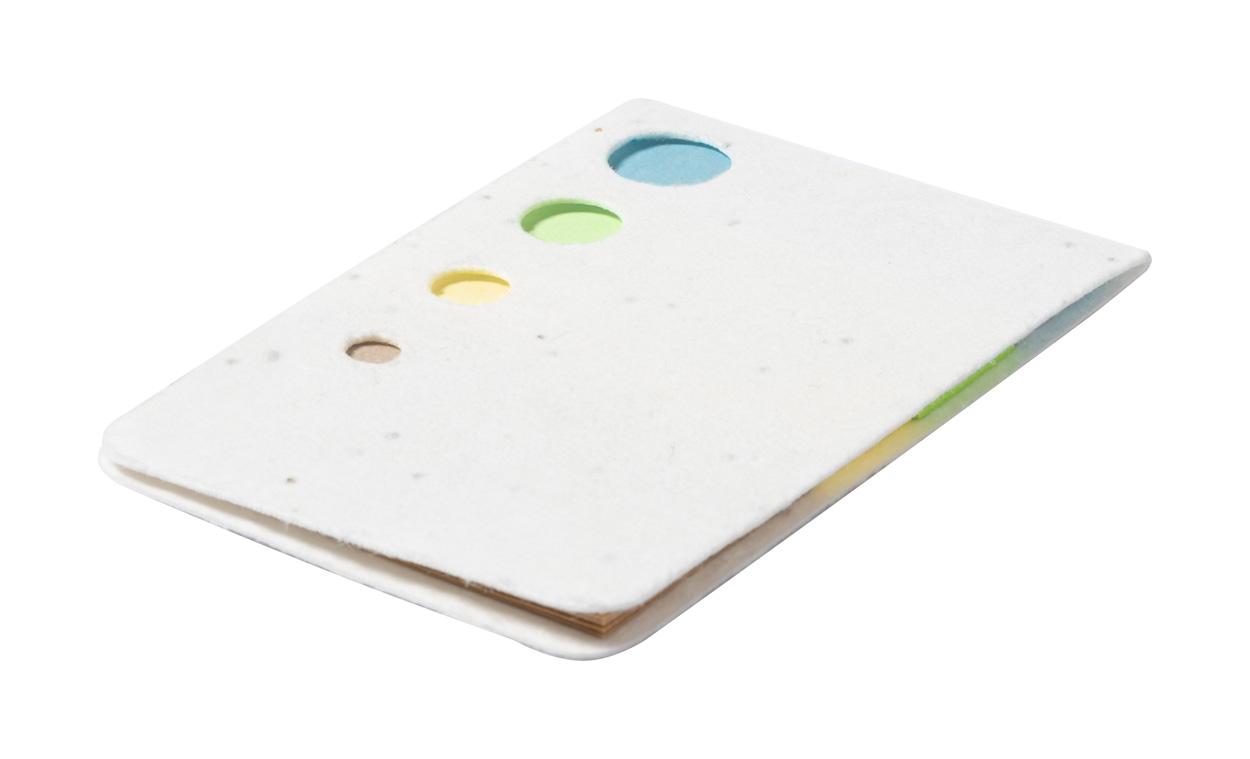 Notizblock aus Recyclingpapier (10 Haftnotizen und 30 Seitenmarker in 3 Farben) mit Hülle aus Samenpapier. Das Samenpapier besteht aus Petuniensamen in gemischten Farben, die gepflanzt werden können nachdem die Haftnotizen vom Samenpapier entfert worden sind.