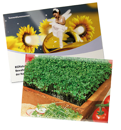 Das große Samentütchen kann vollständig nach Ihren Wünschen gestaltet sowie mit einer Vielzahl an Samensorten befüllt werden. Weitere Papiersorten (Recycling-, Gras- und Natronkraftpapier) sind auf Anfrage möglich.