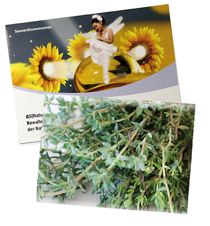 Das große Samentütchen kann vollständig nach Ihren Wünschen gestaltet sowie mit einer Vielzahl an Samensorten befüllt werden. Weitere Papiersorten (Recycling-, Gras- und Natronkraftpapier) sind auf Anfrage möglich.