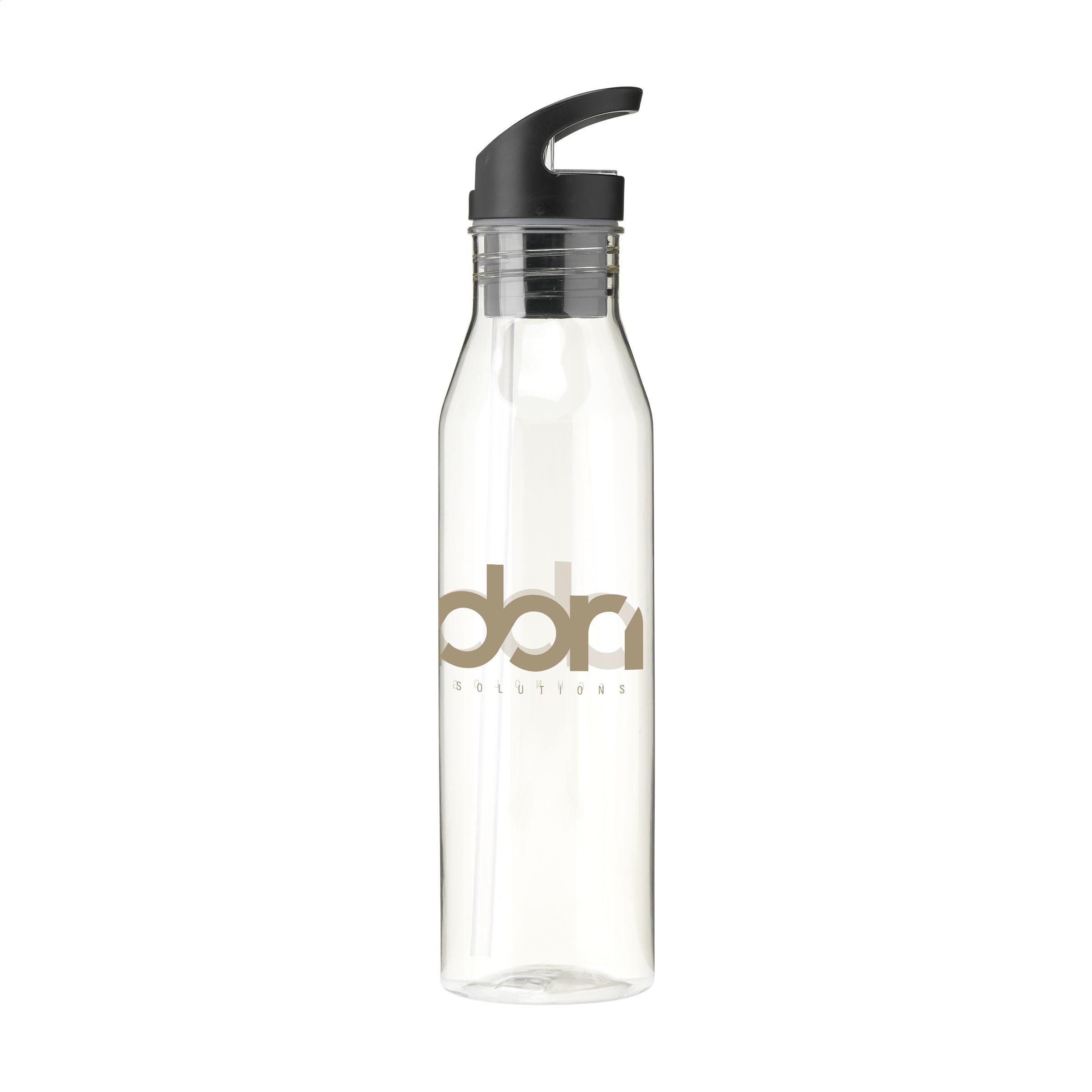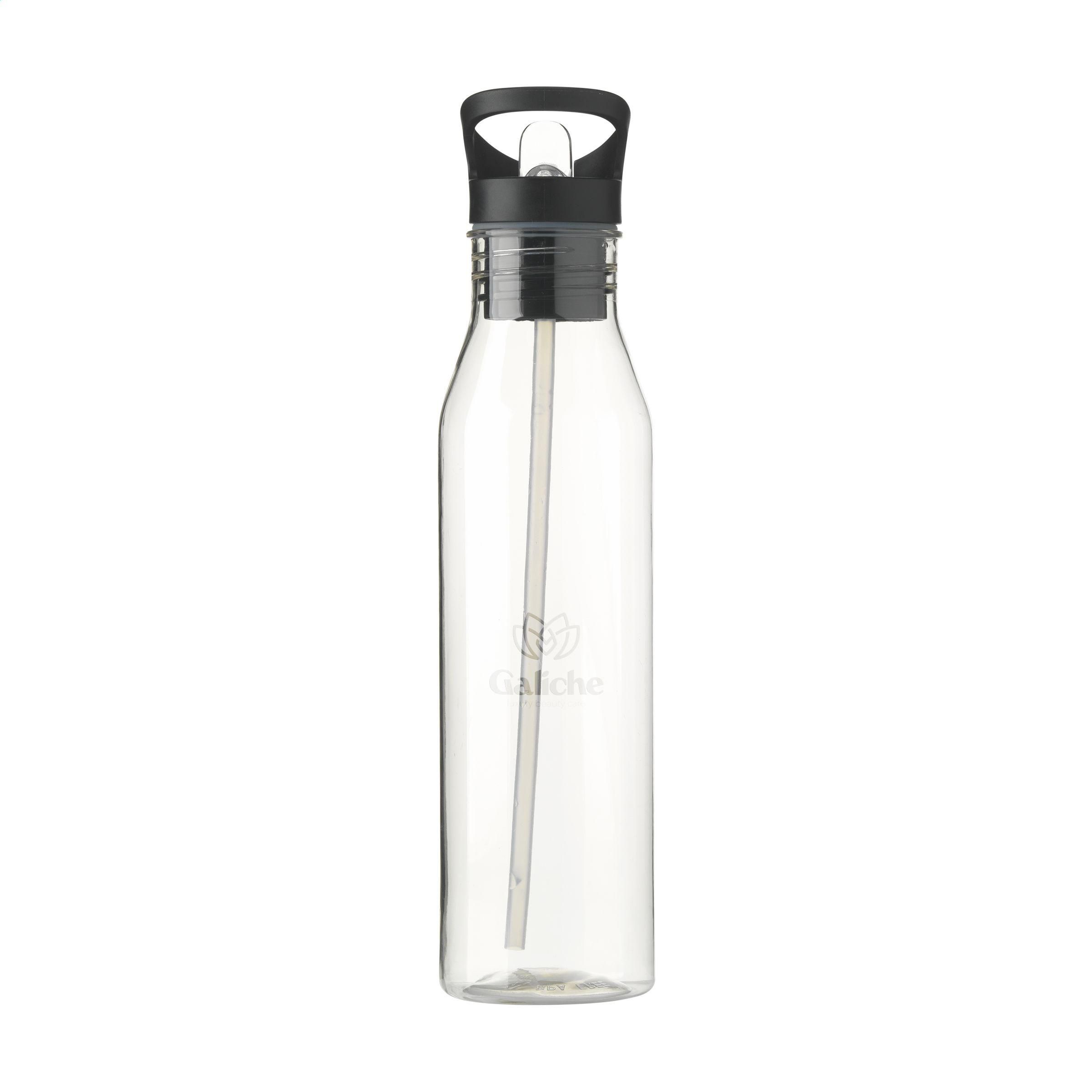 asserflasche mit transparentem Körper aus RPET. Der Schraubverschluss verfügt über ein einklappbares Mundstück und einen verschließbaren Strohhalm. Beim Trinken kann man den Kopf gerade halten. So können Sie beim Fahren die Augen auf der Straße halten, während Sie trinken. Die Flasche lässt sich mühelos an einem Finger mitnehmen. Wiederverwendbar und auslaufsicher. Nicht spülmaschinengeeignet. GRS-zertifiziert. Gesamtes recyceltes Material: 69%. Fassungsvermögen: 720 ml.