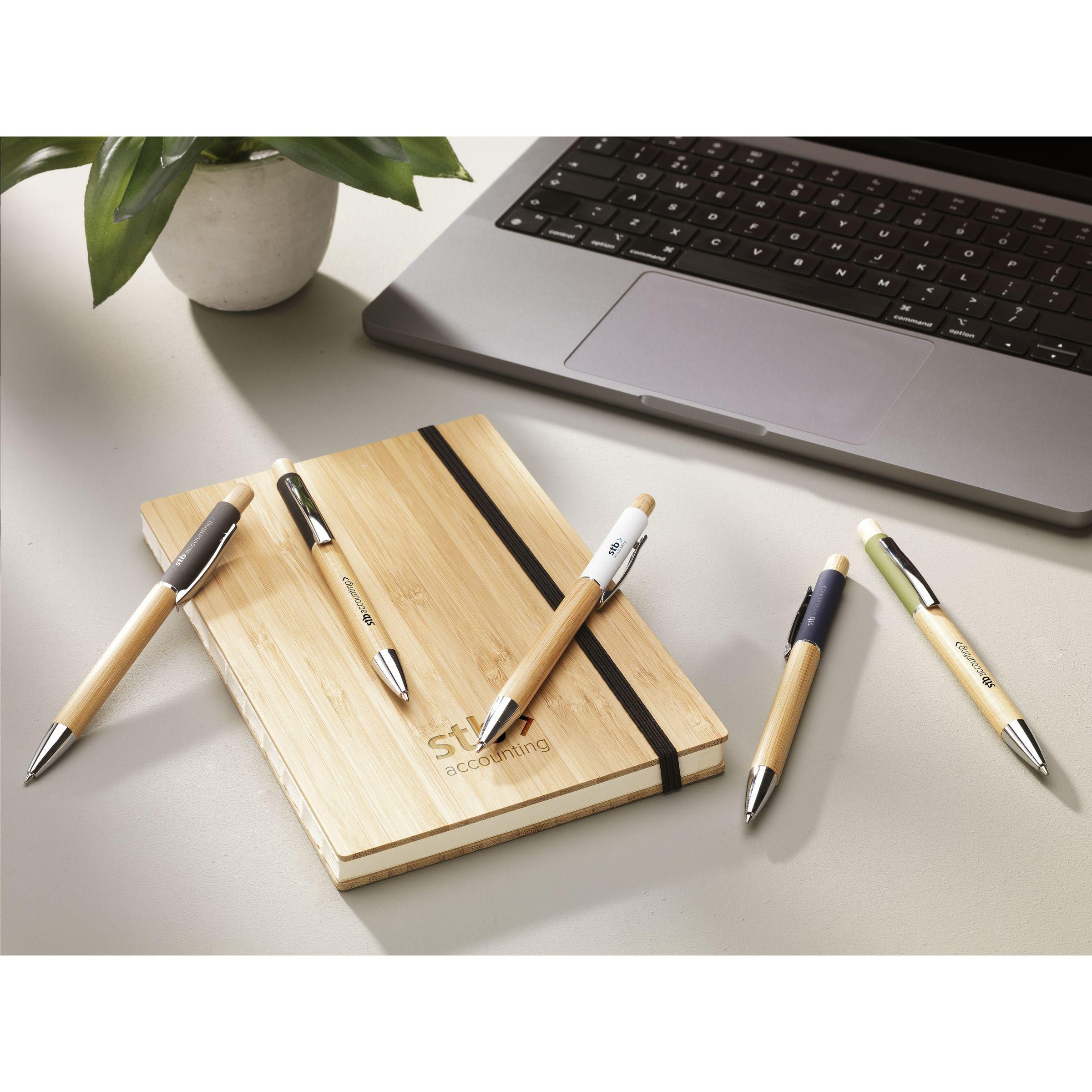 Beschreibung: Blauschreibender Kugelschreiber mit schönem Gehäuse und Druckknopf aus FSC 100% zertifiziertem Bambus. Metallclip. Die Aluminiumoberseite des Halters ist mit einer gummierten Oberfläche versehen.