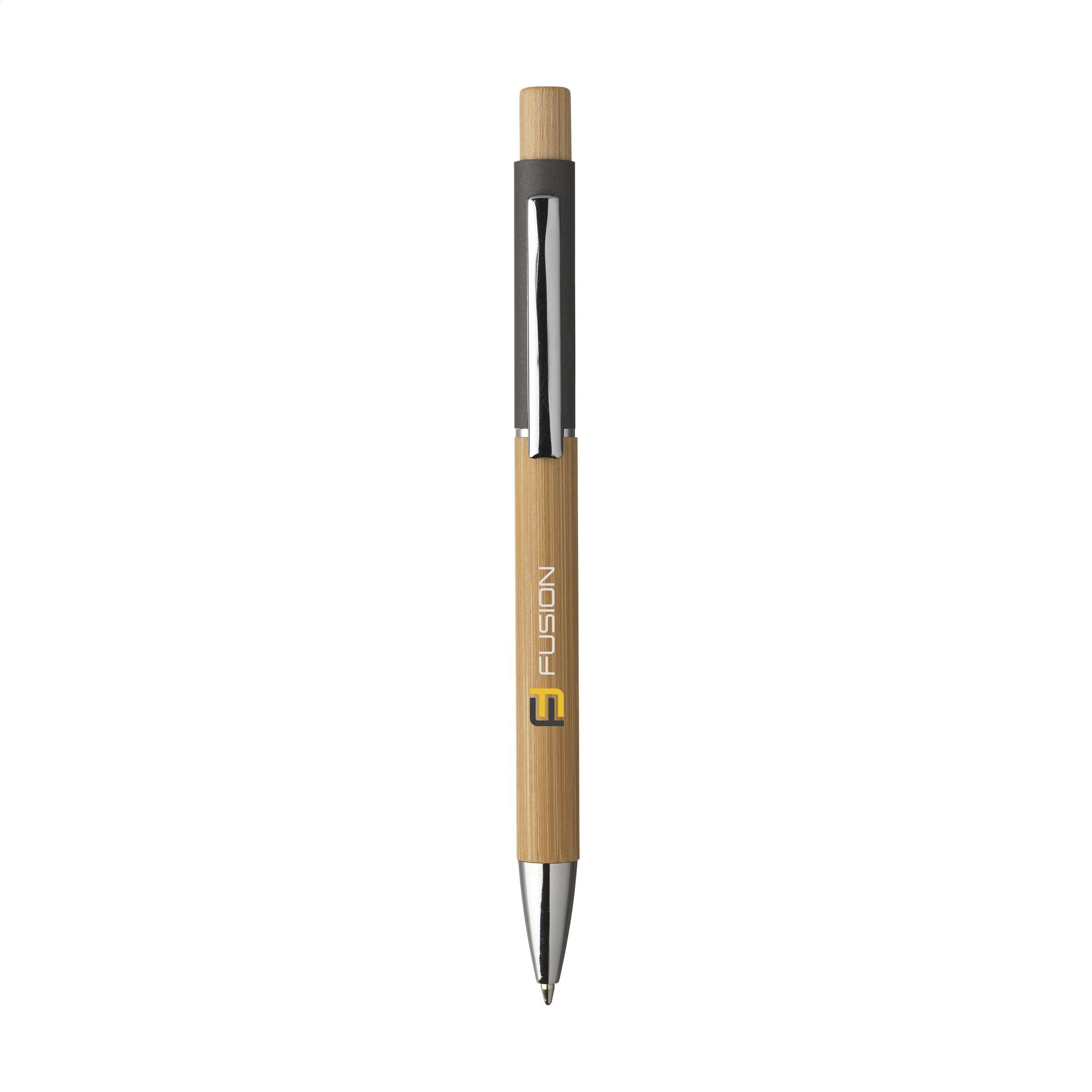 Beschreibung: Blauschreibender Kugelschreiber mit schönem Gehäuse und Druckknopf aus FSC 100% zertifiziertem Bambus. Metallclip. Die Aluminiumoberseite des Halters ist mit einer gummierten Oberfläche versehen.