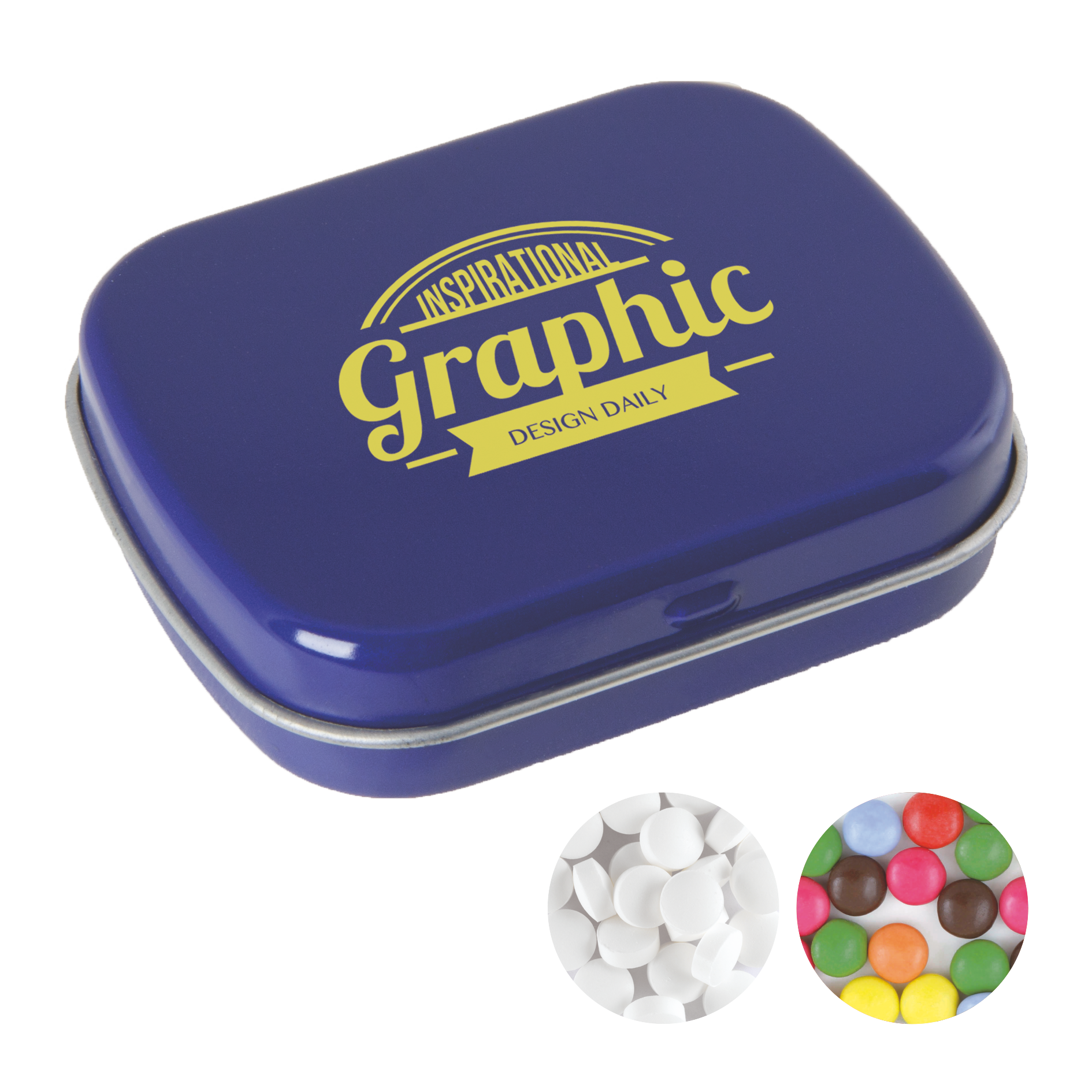 Scharnierblechdose 62 x 50 x 17 mm mit ca. 25 gr. Minties, TAMPONDRUCK, erhältlich in einer großen Farbenvielfalt mit verschiedenen Füllungen: Minties, extra strong Minties `Triangle`, Schokocarletties, Jelly Beans, Fruchtherzchen, Schokoperlen gold, knuspriger Schokoladen festival, knusprige schokoladen Juwelen, goldglitzer Milchschokolade, kleine Herzen gold, kleine Herzen rot / weiß, marmorgold Schoko dunkel, mikro Milchschokoladeneier, mini Schokoperlen gold, mini Schokoperlen kupfer, roseglitzer Milchschokolade, silberglitzer Milchschokolade oder sommerkonfetti Schoko dunkel.