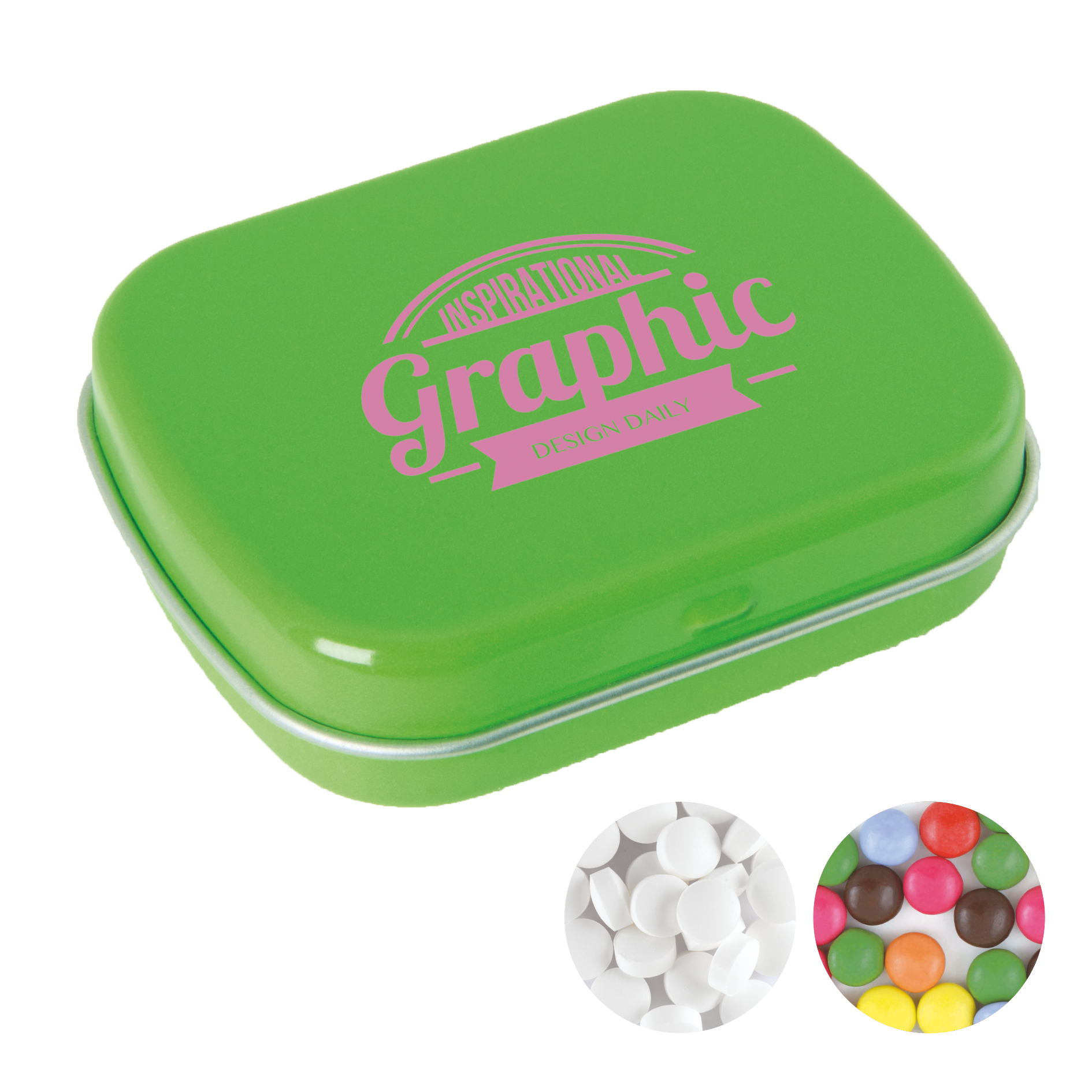 Scharnierblechdose 62 x 50 x 17 mm mit ca. 25 gr. Minties, TAMPONDRUCK, erhältlich in einer großen Farbenvielfalt mit verschiedenen Füllungen: Minties, extra strong Minties `Triangle`, Schokocarletties, Jelly Beans, Fruchtherzchen, Schokoperlen gold, knuspriger Schokoladen festival, knusprige schokoladen Juwelen, goldglitzer Milchschokolade, kleine Herzen gold, kleine Herzen rot / weiß, marmorgold Schoko dunkel, mikro Milchschokoladeneier, mini Schokoperlen gold, mini Schokoperlen kupfer, roseglitzer Milchschokolade, silberglitzer Milchschokolade oder sommerkonfetti Schoko dunkel.