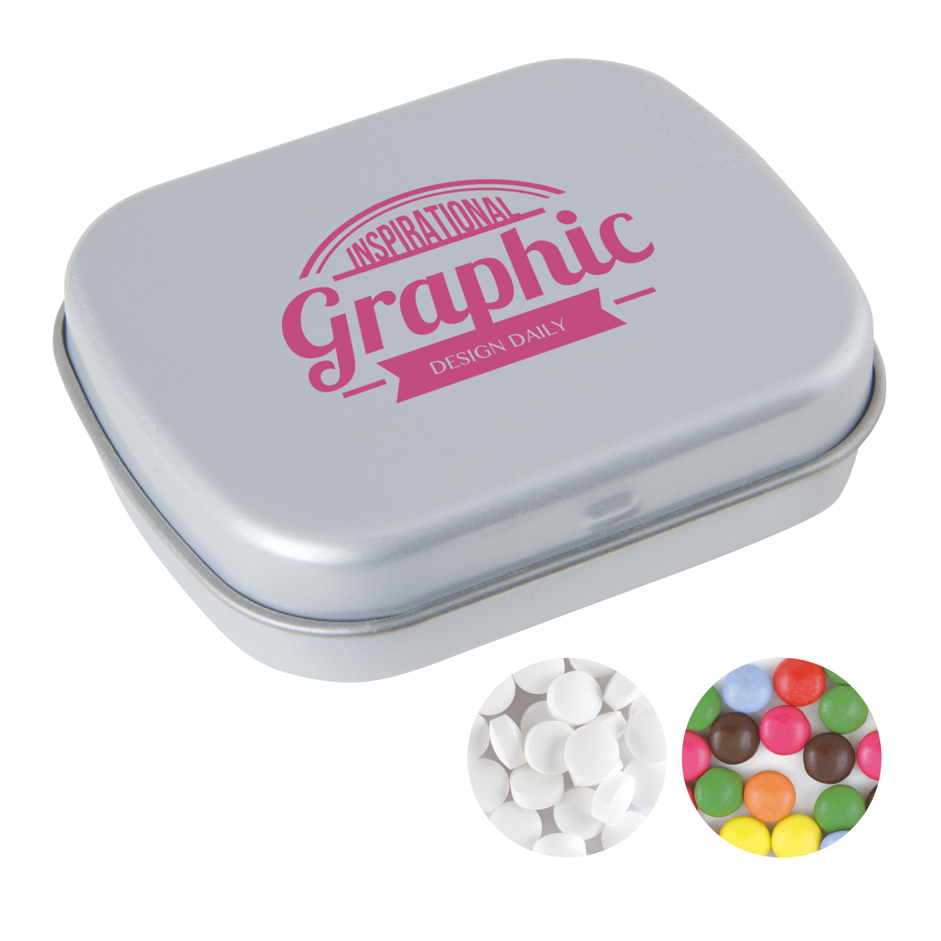 Scharnierblechdose 62 x 50 x 17 mm mit ca. 25 gr. Minties, TAMPONDRUCK, erhältlich in einer großen Farbenvielfalt mit verschiedenen Füllungen: Minties, extra strong Minties `Triangle`, Schokocarletties, Jelly Beans, Fruchtherzchen, Schokoperlen gold, knuspriger Schokoladen festival, knusprige schokoladen Juwelen, goldglitzer Milchschokolade, kleine Herzen gold, kleine Herzen rot / weiß, marmorgold Schoko dunkel, mikro Milchschokoladeneier, mini Schokoperlen gold, mini Schokoperlen kupfer, roseglitzer Milchschokolade, silberglitzer Milchschokolade oder sommerkonfetti Schoko dunkel.