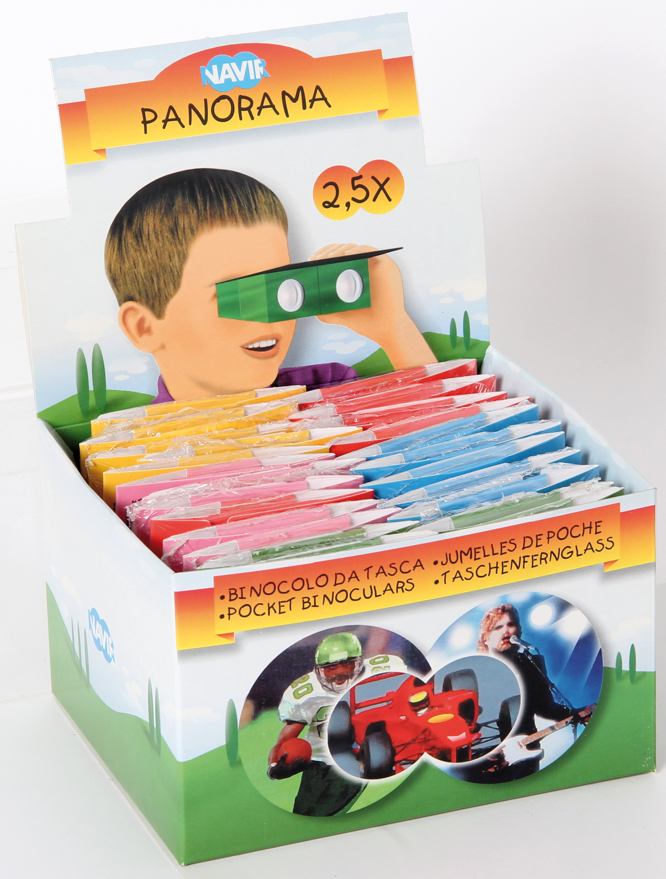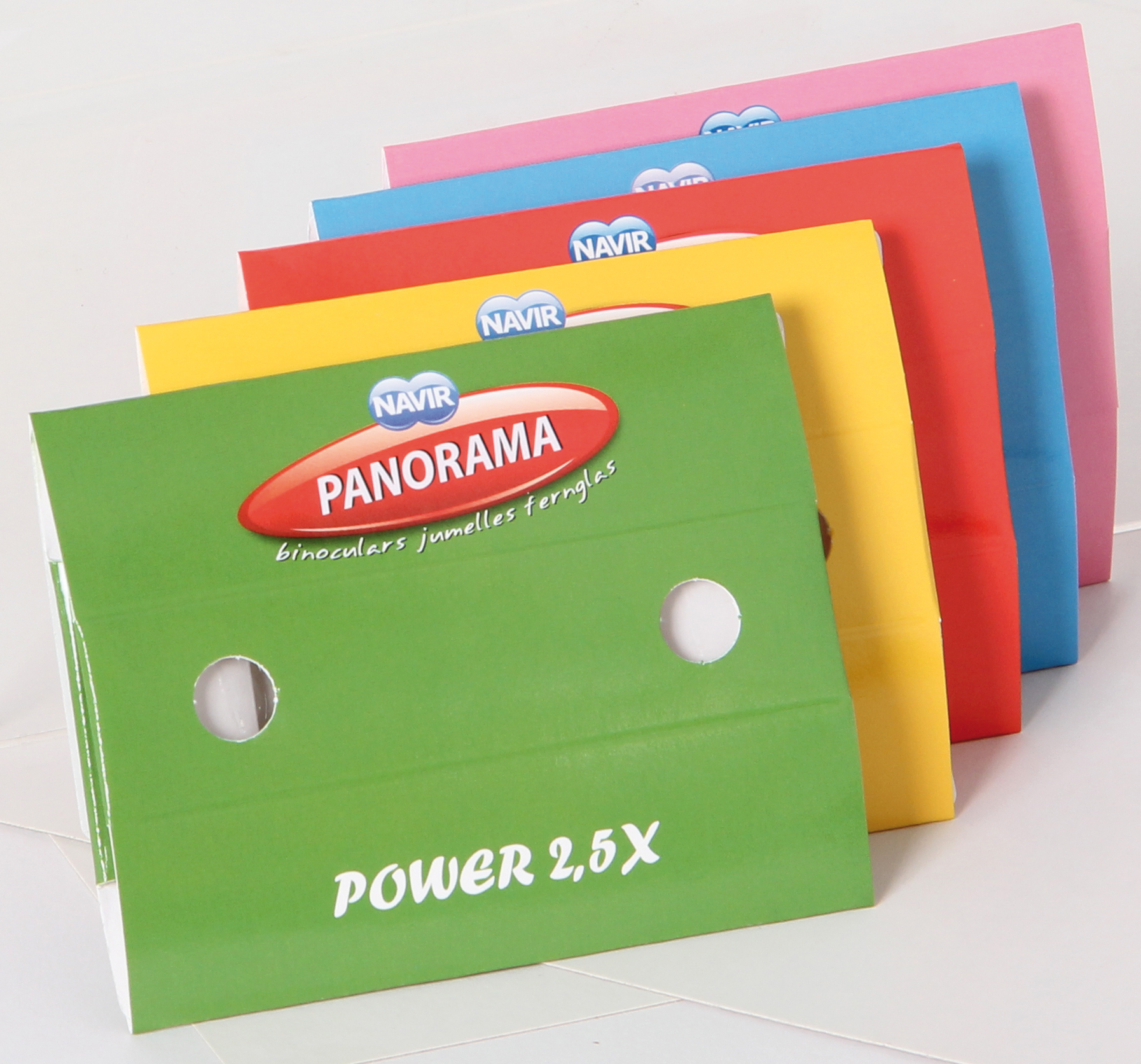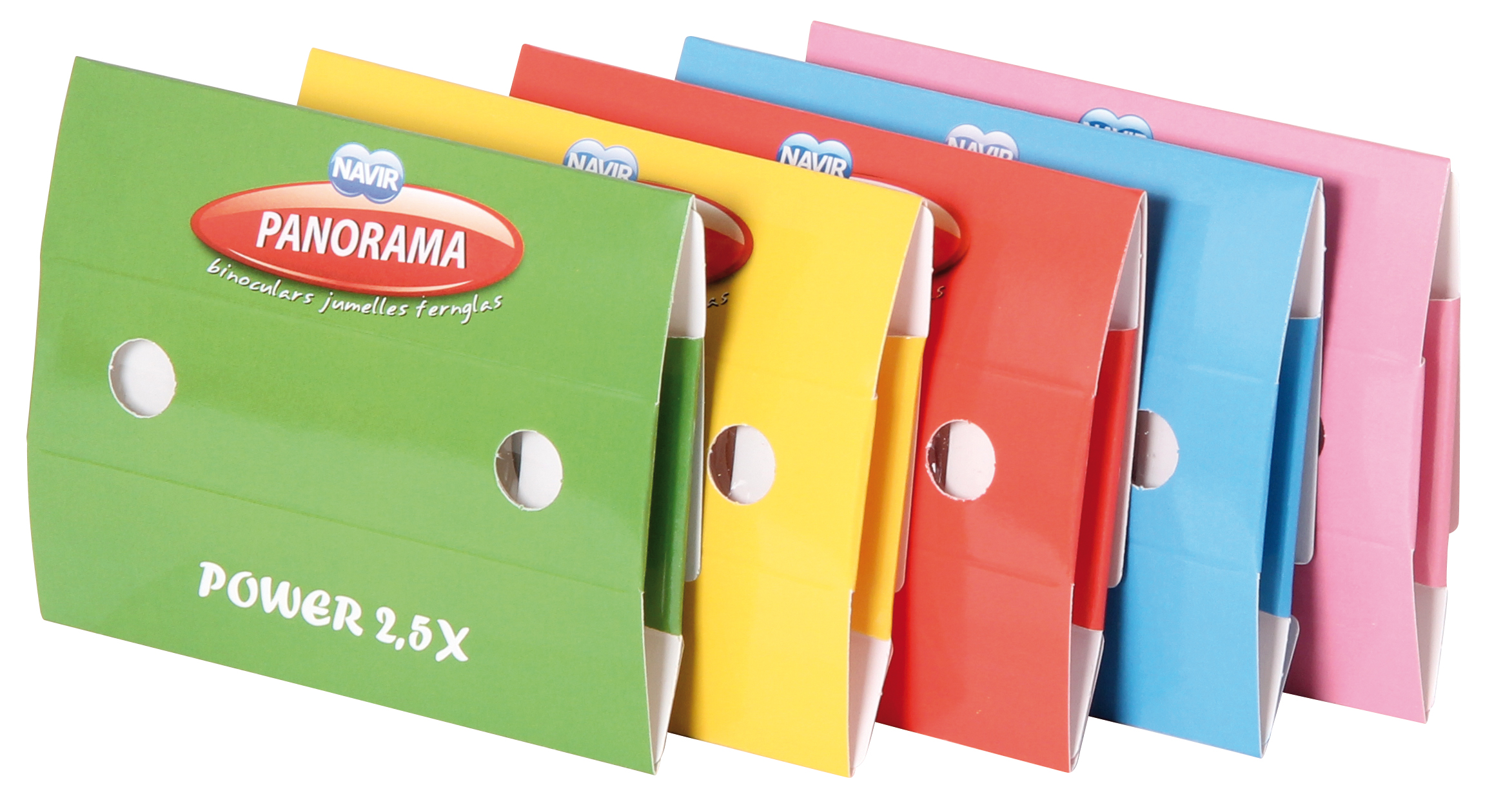 Originelles Taschenfernglas mit 2,5-facher Vergrößerung. Passt in jede Hand- oder Jackentasche. Sortiert in den Farben gelb, rot, grün, blau.