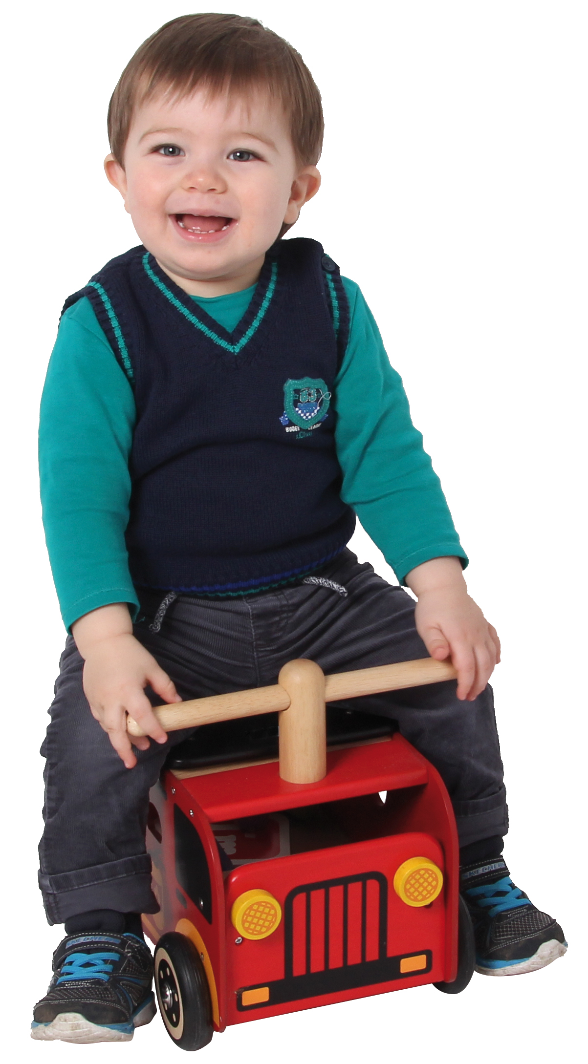 Stabiler Spielwagen aus Holz. Das multifunktionelle Gefährt hat einen Griffbügel, eine abnehmbare Ablage- und Sitzfläche sowie ein Formensortierspiel in den Seitenteilen. Inklusive sechs Bauklötzen für das Sortierspiel. Kleine Kinder können auf dem Wagen sitzen und ihn als Rutscher verwenden. Sitzhöhe: 20 cm. Griffhöhe: 44 cm.