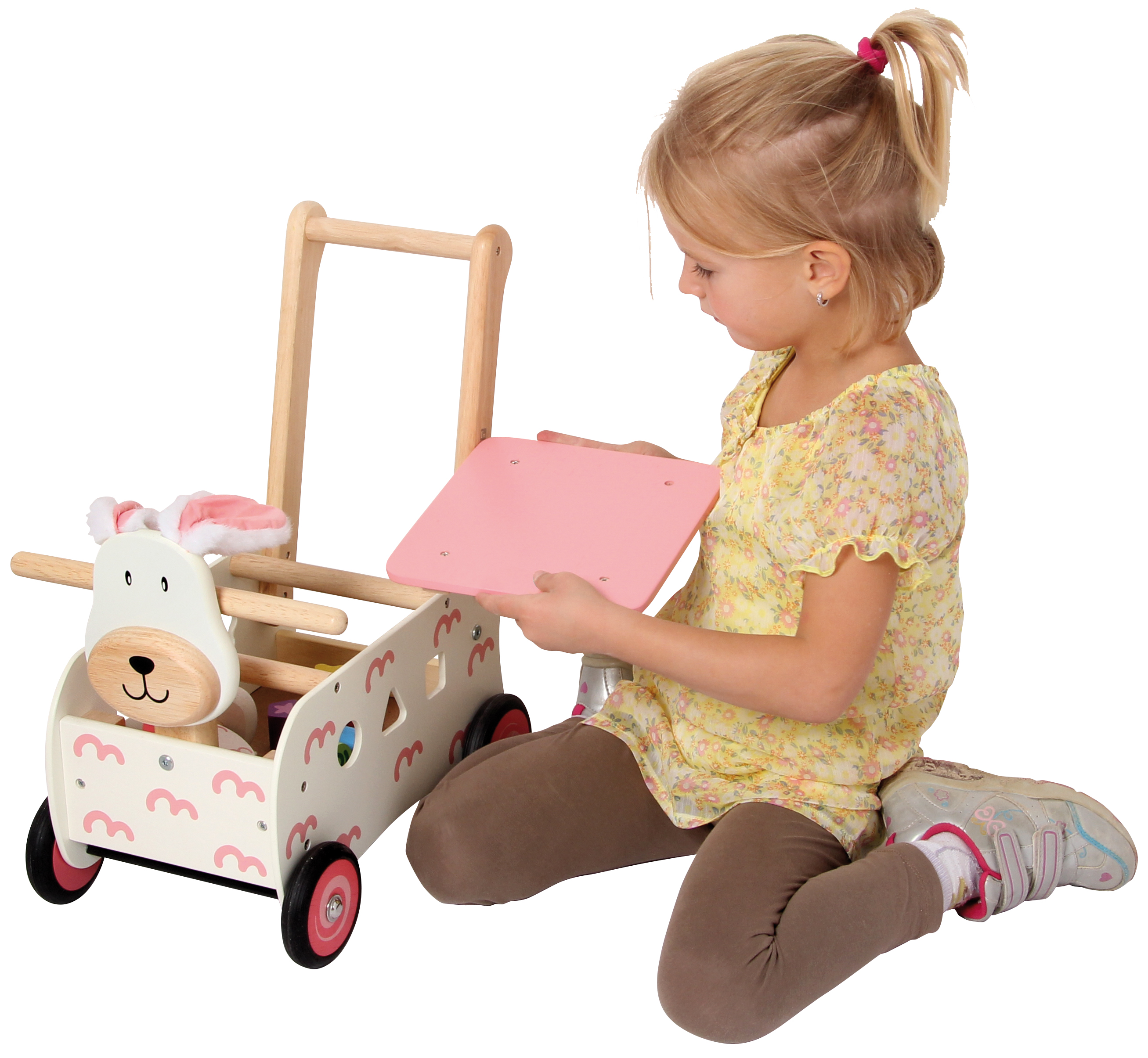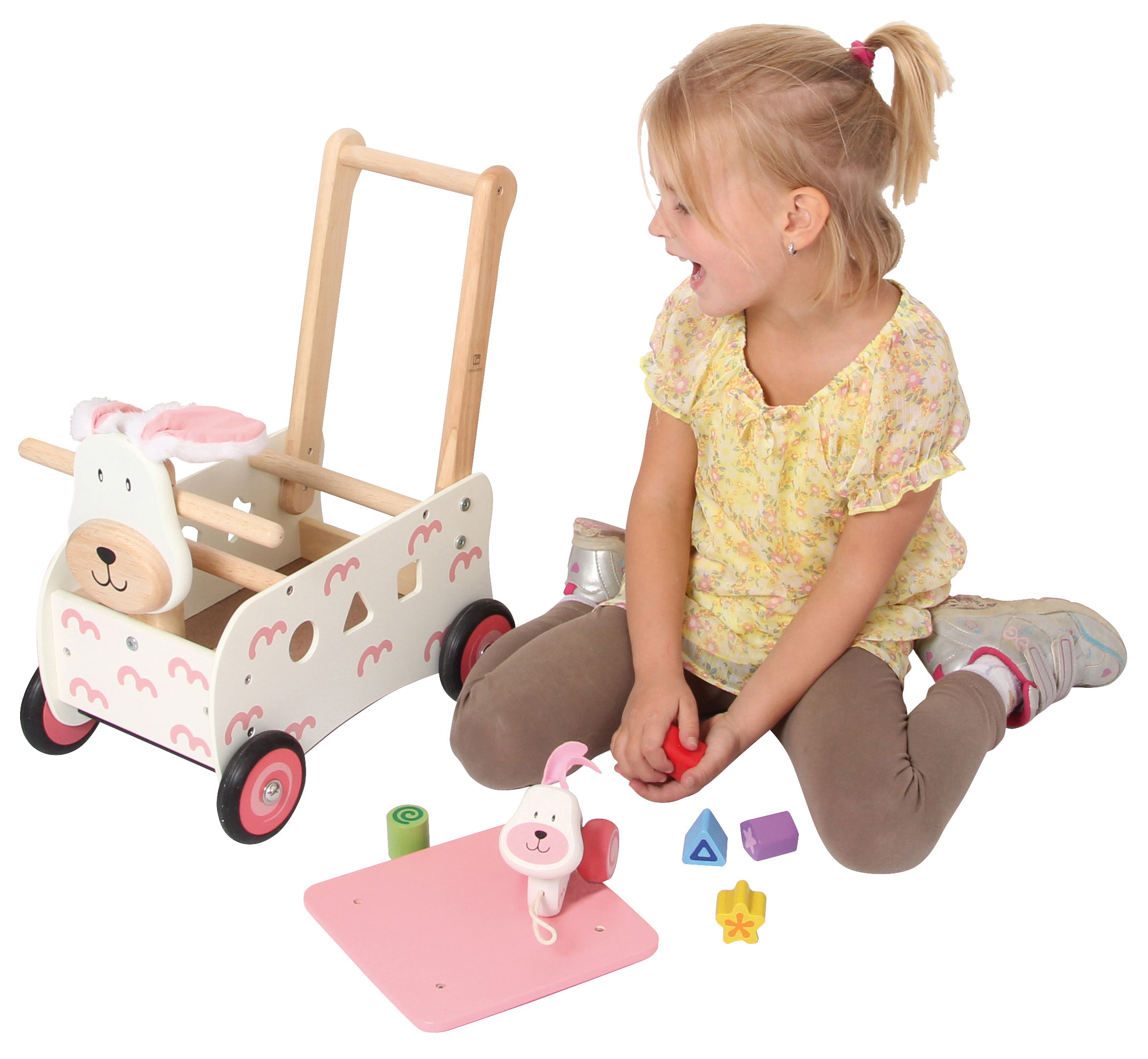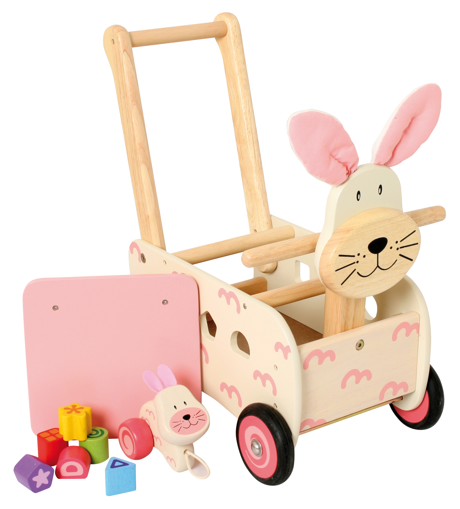 Stabiler Spielwagen aus Holz im Tier-Design. Das multifunktionelle Gefährt hat einen Griffbügel, eine abnehmbare Ablage- und Sitzfläche sowie ein Formensortierspiel in den Seitenteilen. Inklusive sechs Bauklötzen für das Sortierspiel und einem kleinen Spiel-Hasen, den man am Schwänzchen des Schiebewagen-Tieres festmachen und hinter sich herziehen kann. Kleine Kinder können auf dem Wagen sitzen oder ihn als Rutschfahrzeug verwenden. Ab 12 Monaten. Sitzhöhe: 20 cm. Griffhöhe: 44 cm.