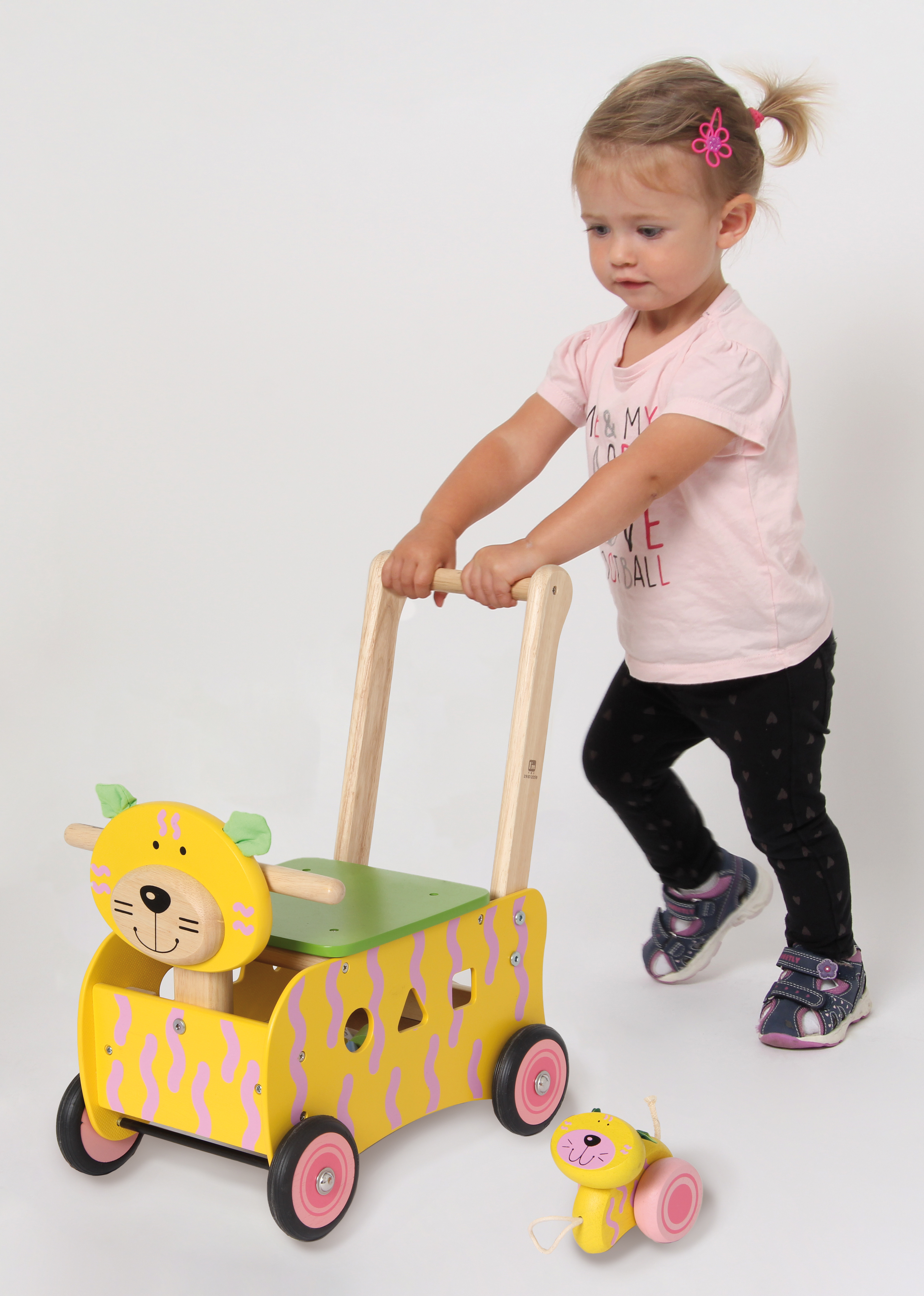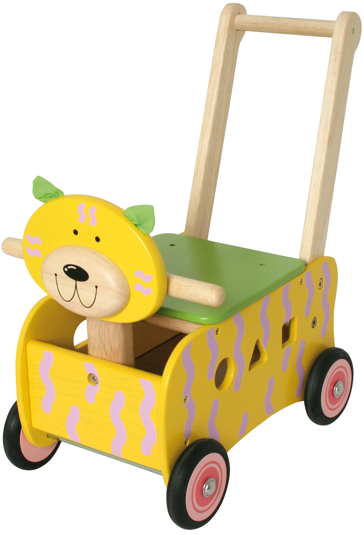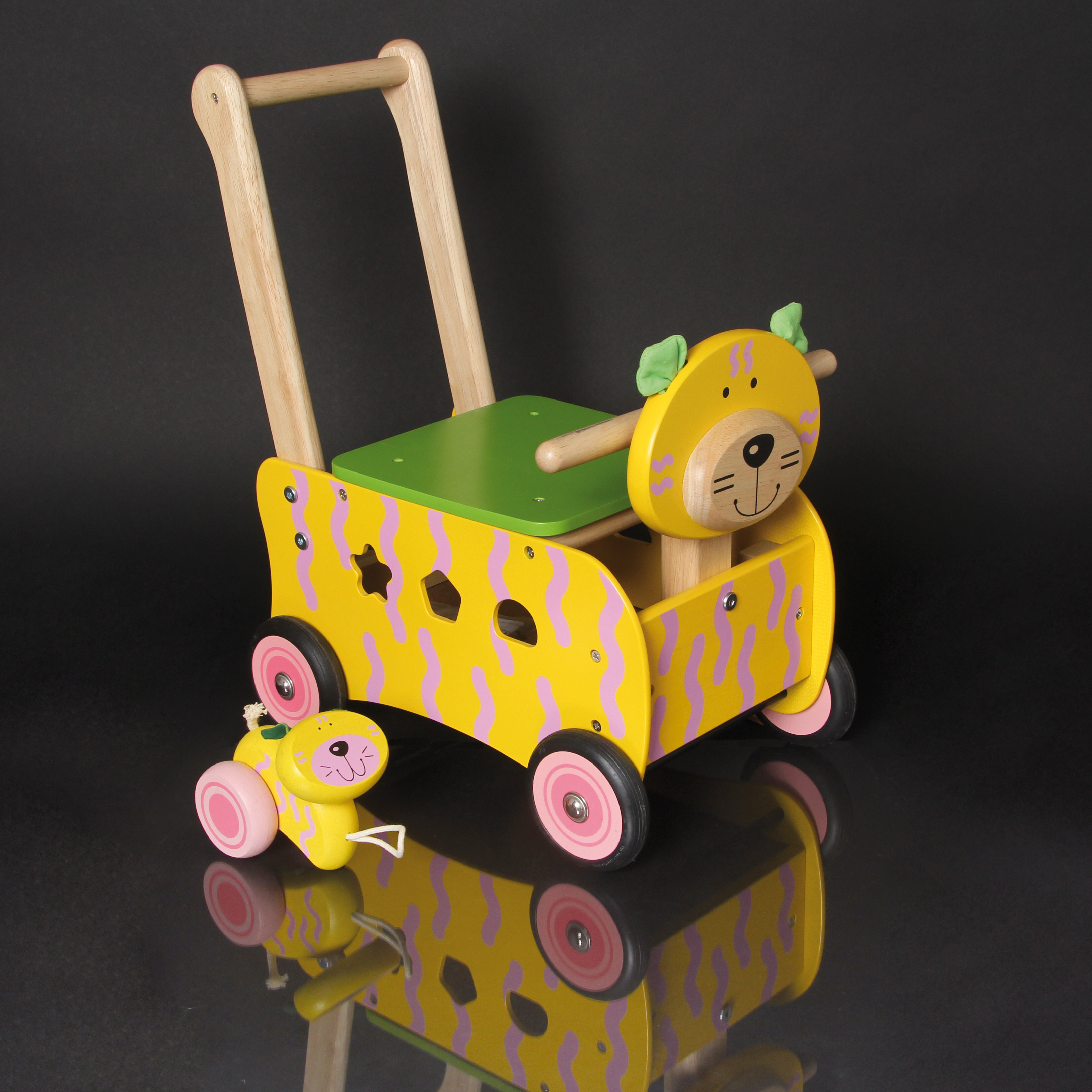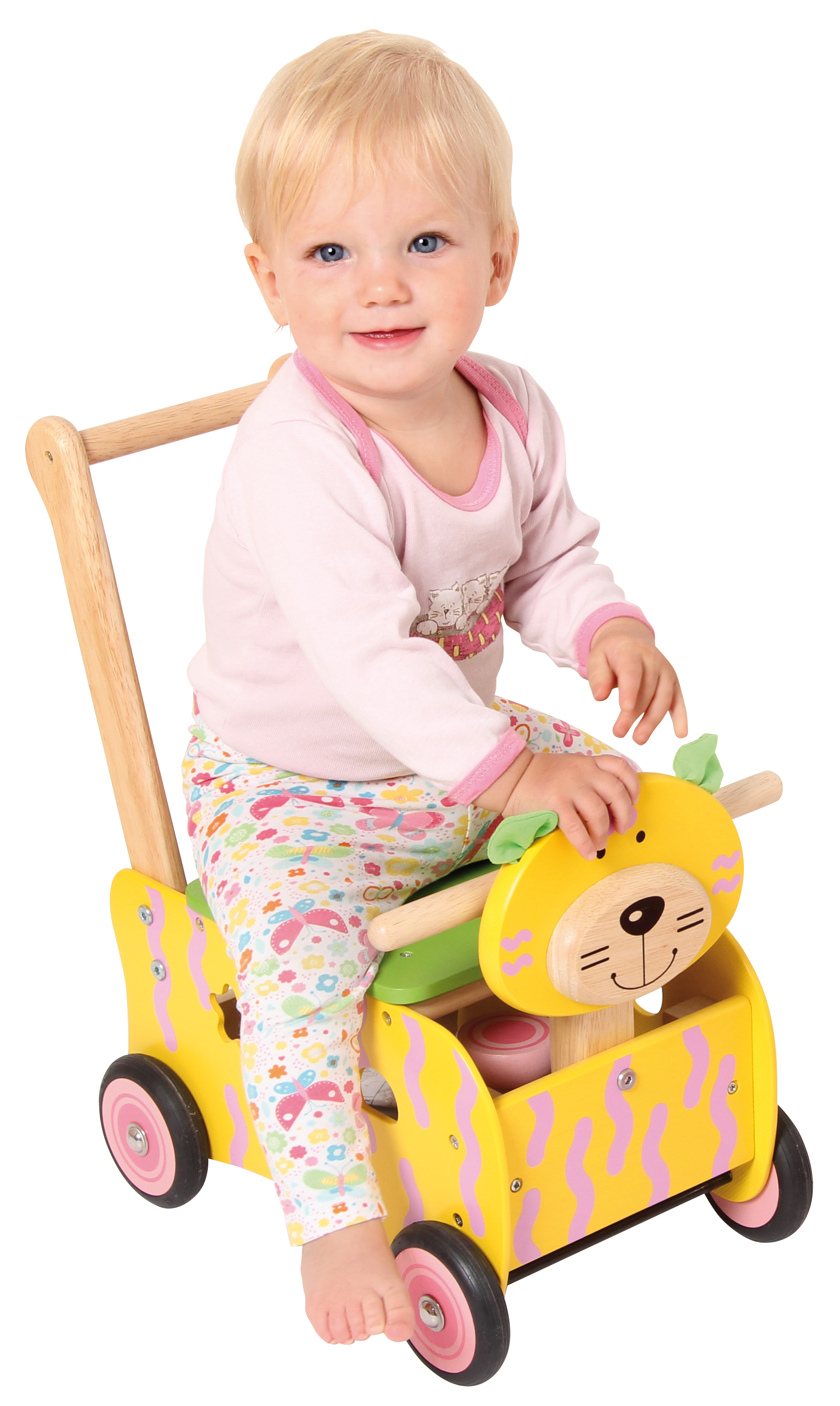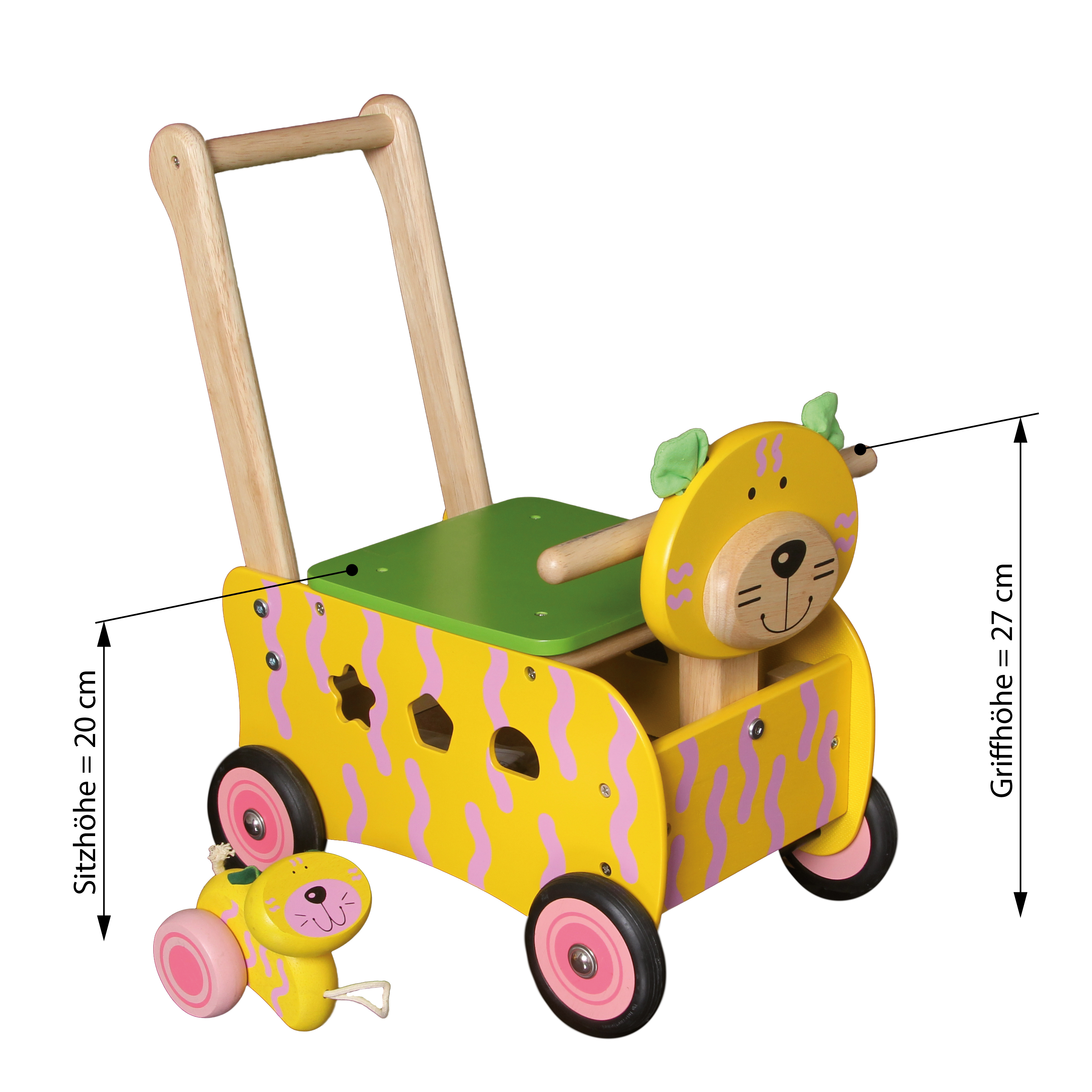 Stabiler Spielwagen aus Holz im Tier-Design. Das multifunktionelle Gefährt hat einen Griffbügel, eine abnehmbare Ablage- und Sitzfläche sowie ein Formensortierspiel in den Seitenteilen. Inklusive sechs Bauklötzen für das Sortierspiel und einer kleinen Spiel-Katze, die man am Schwänzchen des Schiebewagen-Tieres festmachen und hinter sich herziehen kann. Kleine Kinder können auf dem Wagen sitzen oder ihn als Rutscher verwenden. Ab 12 Monaten. Sitzhöhe: 20 cm. Griffhöhe: 44 cm.