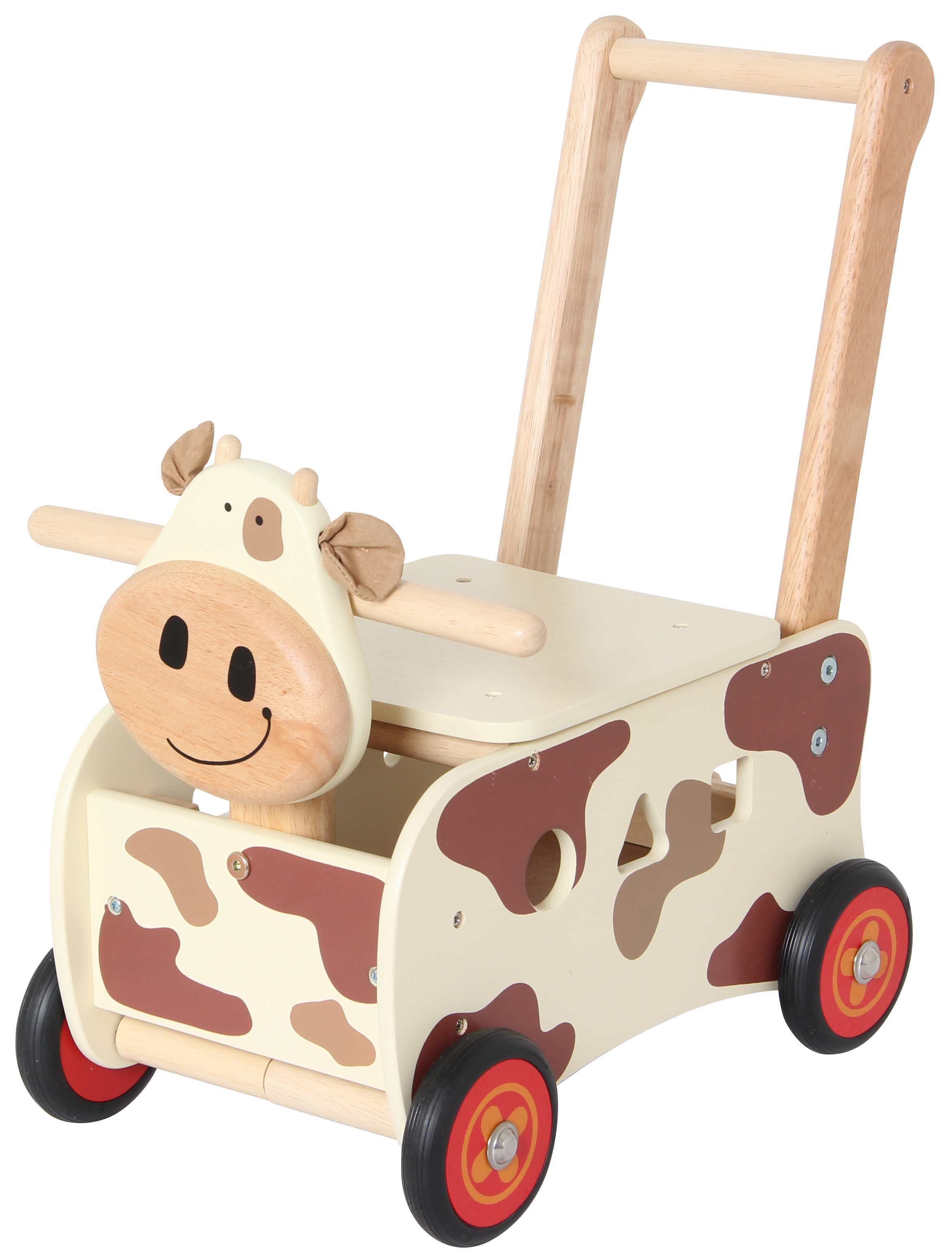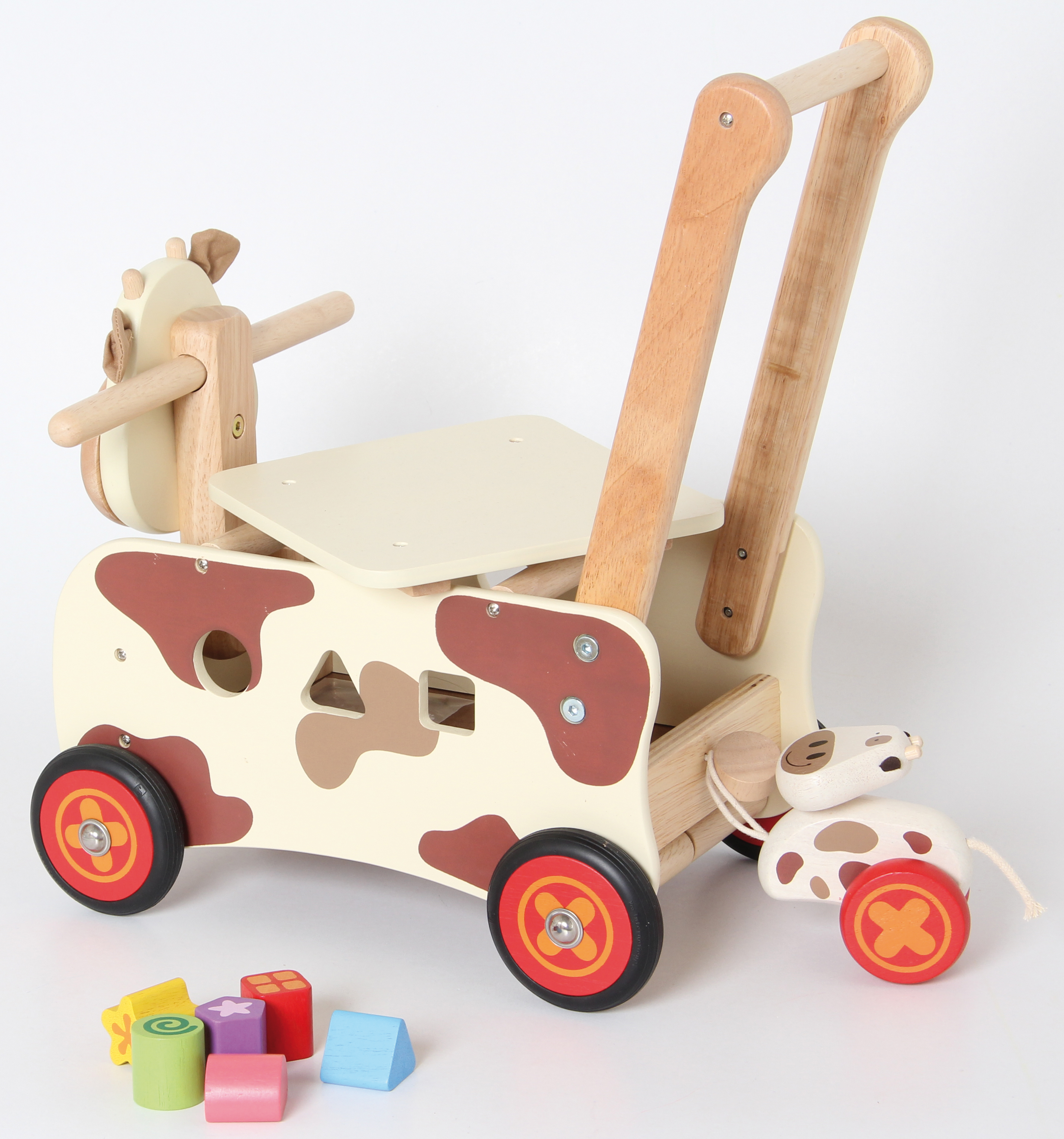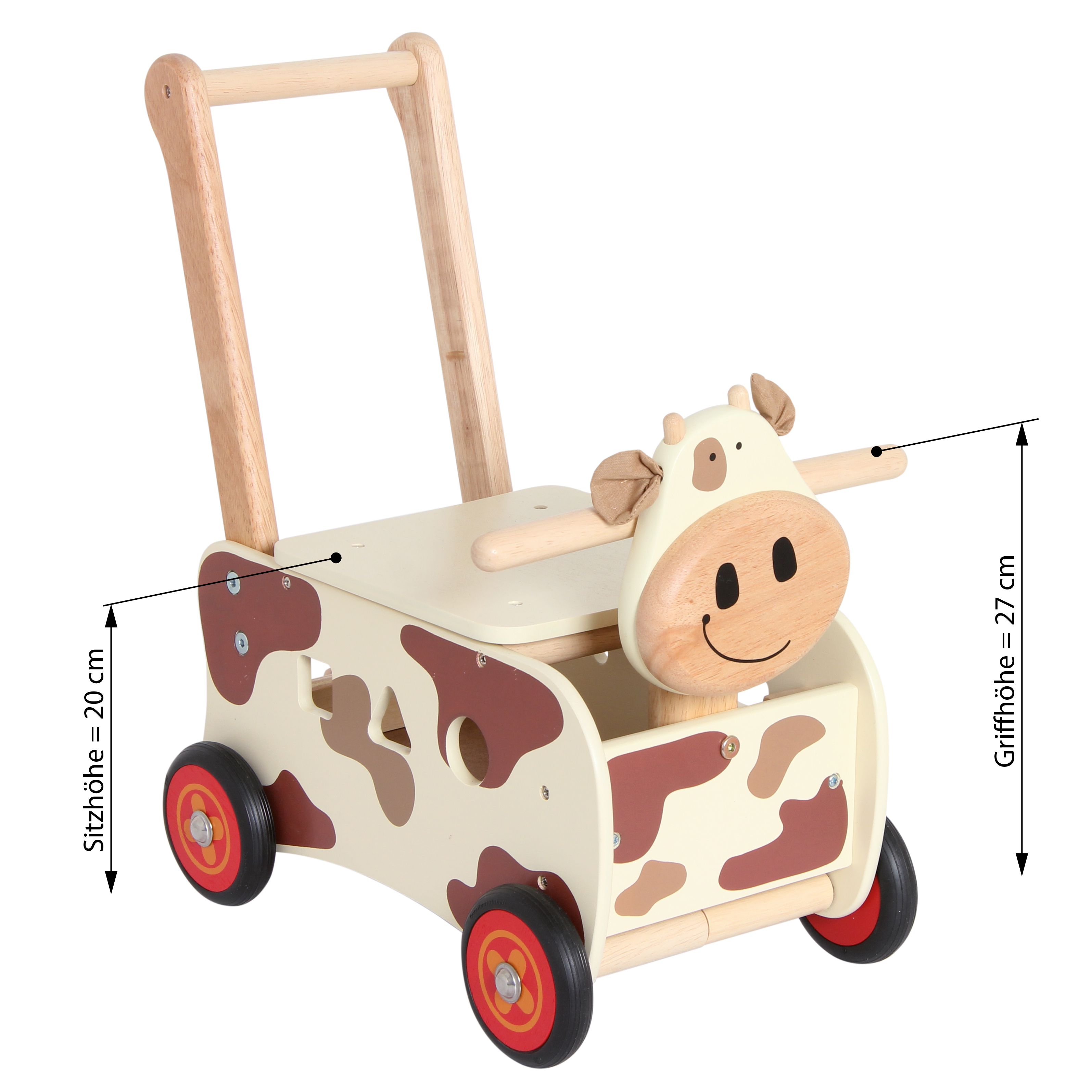 Stabiler Spielwagen aus Holz im Tier-Design. Das multifunktionelle Gefährt hat einen Griffbügel, eine abnehmbare Ablage- und Sitzfläche sowie ein Formensortierspiel in den Seitenteilen. Inklusive sechs Bauklötzen für das Sortierspiel und einer kleinen Spiel-Kuh, die man am Schwänzchen des Schiebewagen-Tieres festmachen und hinter sich herziehen kann. Kleine Kinder können auf dem Wagen sitzen oder ihn als Rutscher verwenden. Ab 12 Monaten. Sitzhöhe: 20 cm. Griffhöhe: 44 cm.