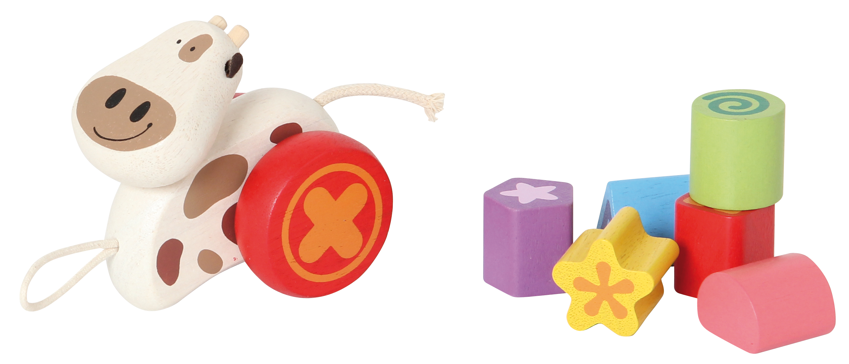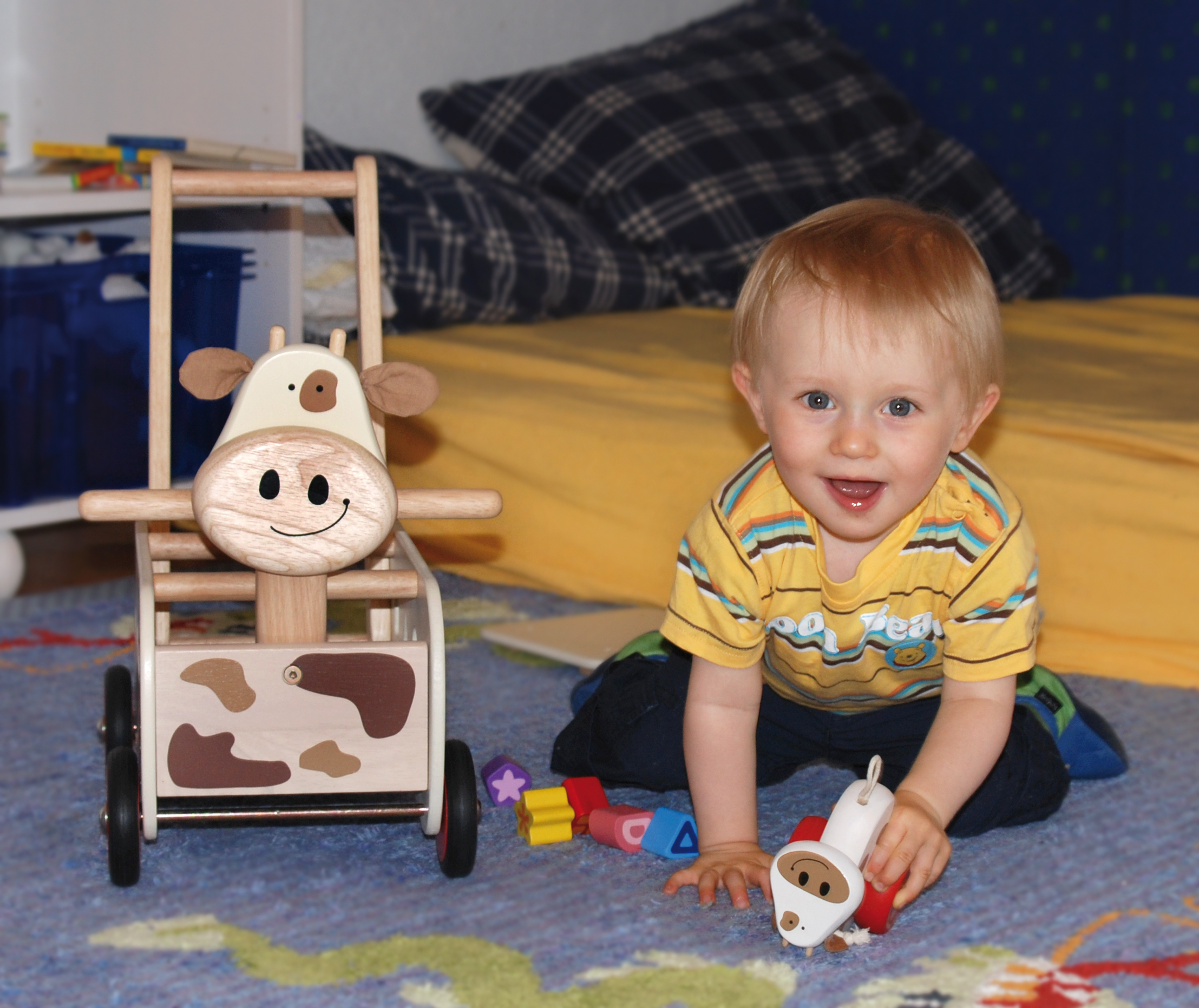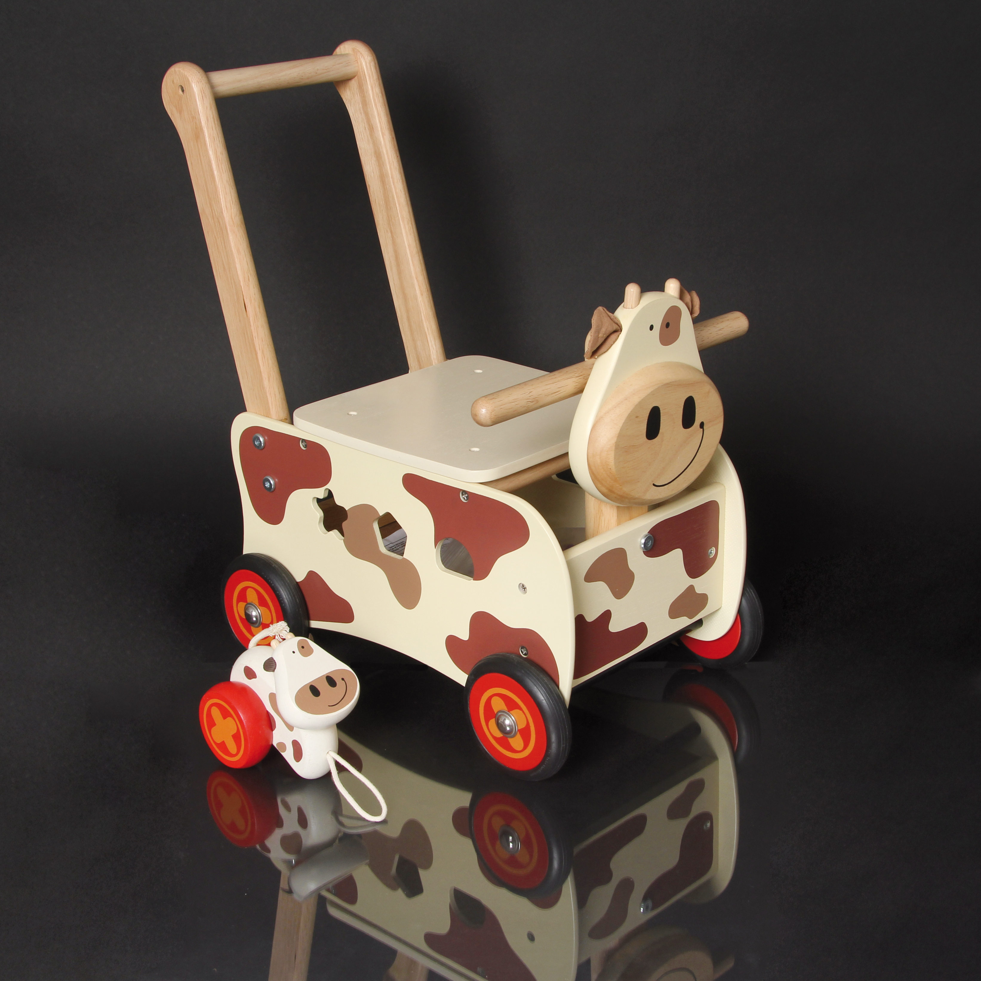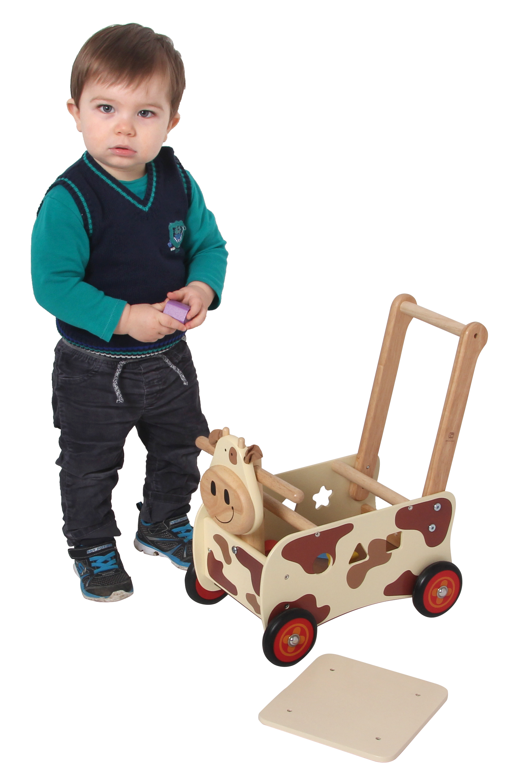 Stabiler Spielwagen aus Holz im Tier-Design. Das multifunktionelle Gefährt hat einen Griffbügel, eine abnehmbare Ablage- und Sitzfläche sowie ein Formensortierspiel in den Seitenteilen. Inklusive sechs Bauklötzen für das Sortierspiel und einer kleinen Spiel-Kuh, die man am Schwänzchen des Schiebewagen-Tieres festmachen und hinter sich herziehen kann. Kleine Kinder können auf dem Wagen sitzen oder ihn als Rutscher verwenden. Ab 12 Monaten. Sitzhöhe: 20 cm. Griffhöhe: 44 cm.