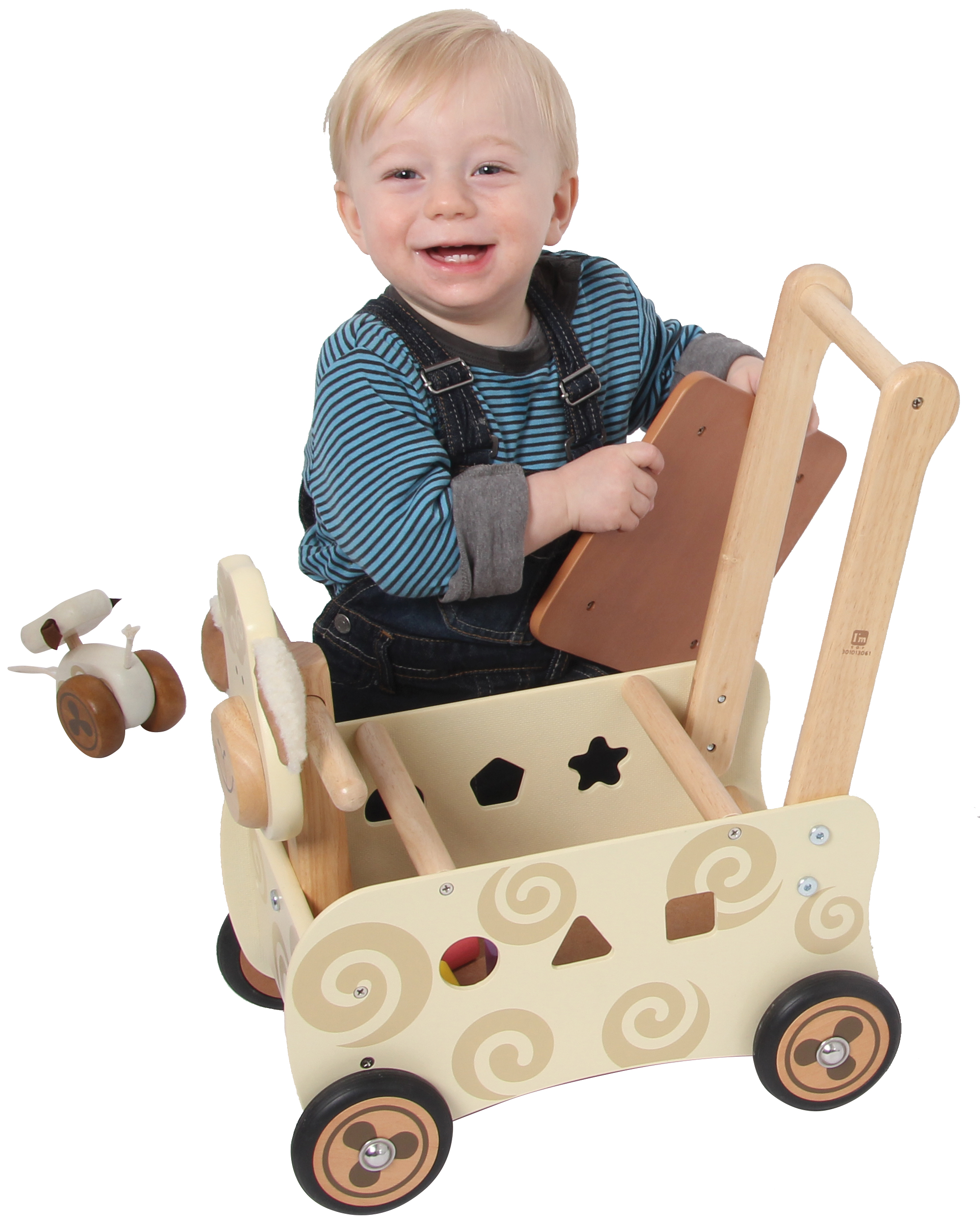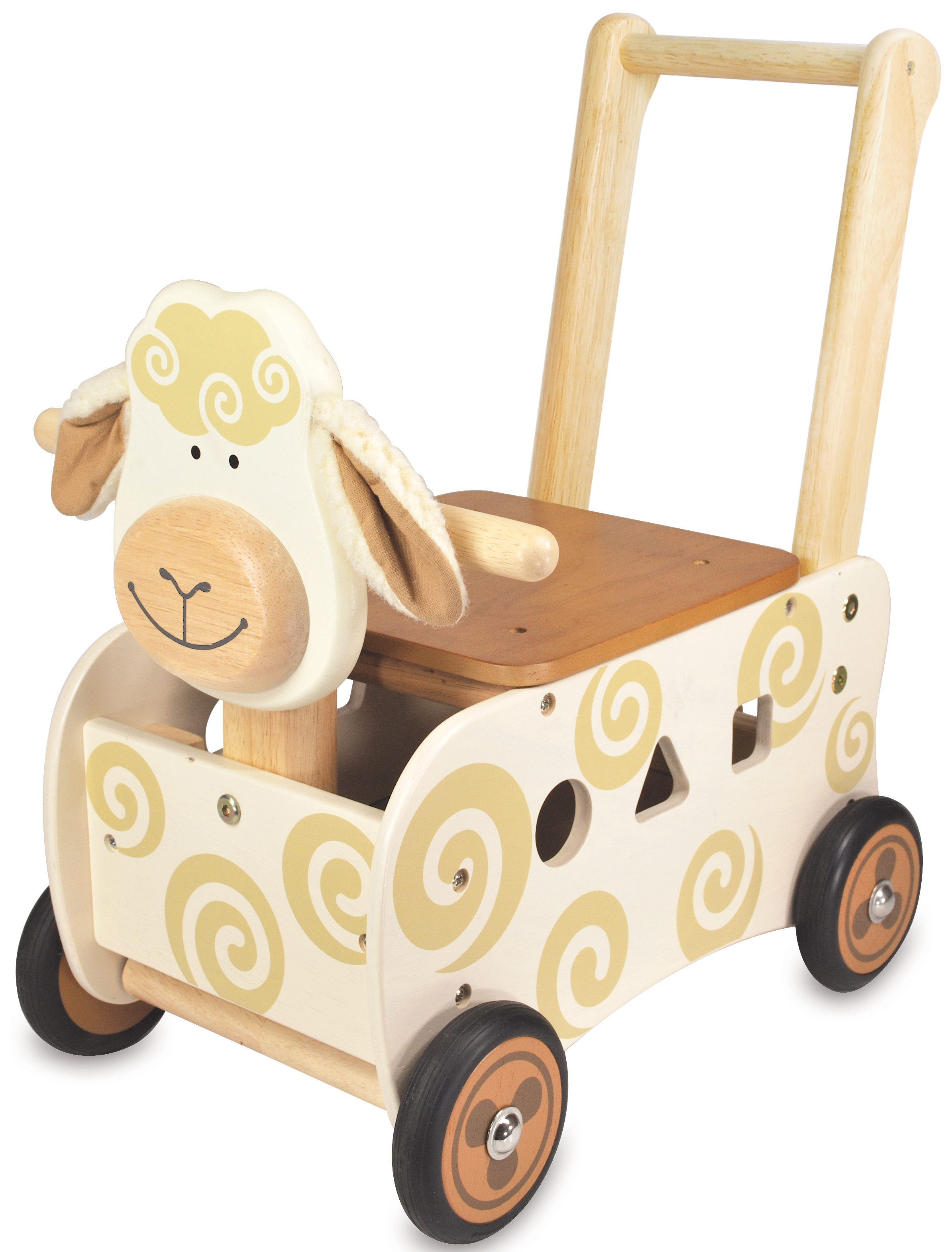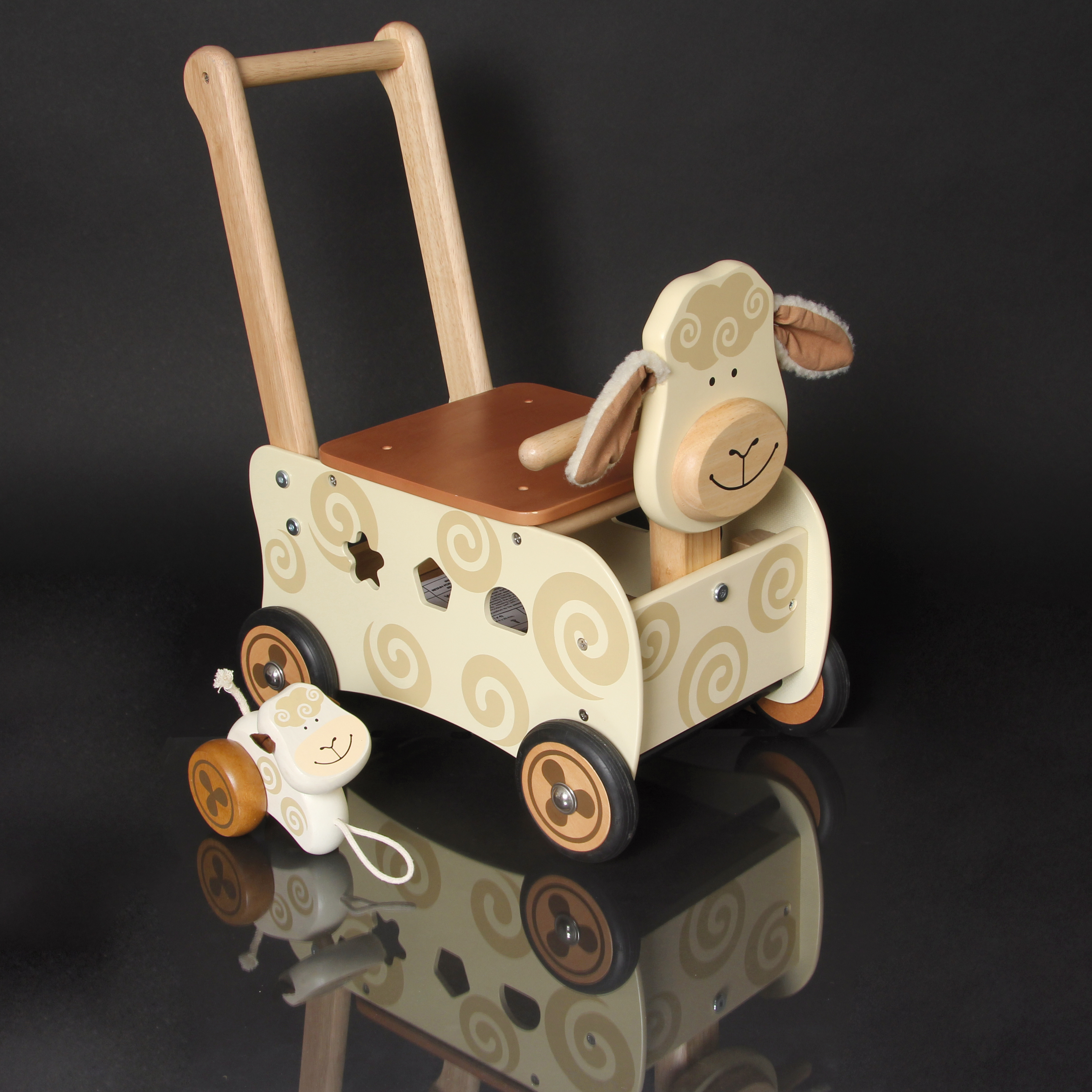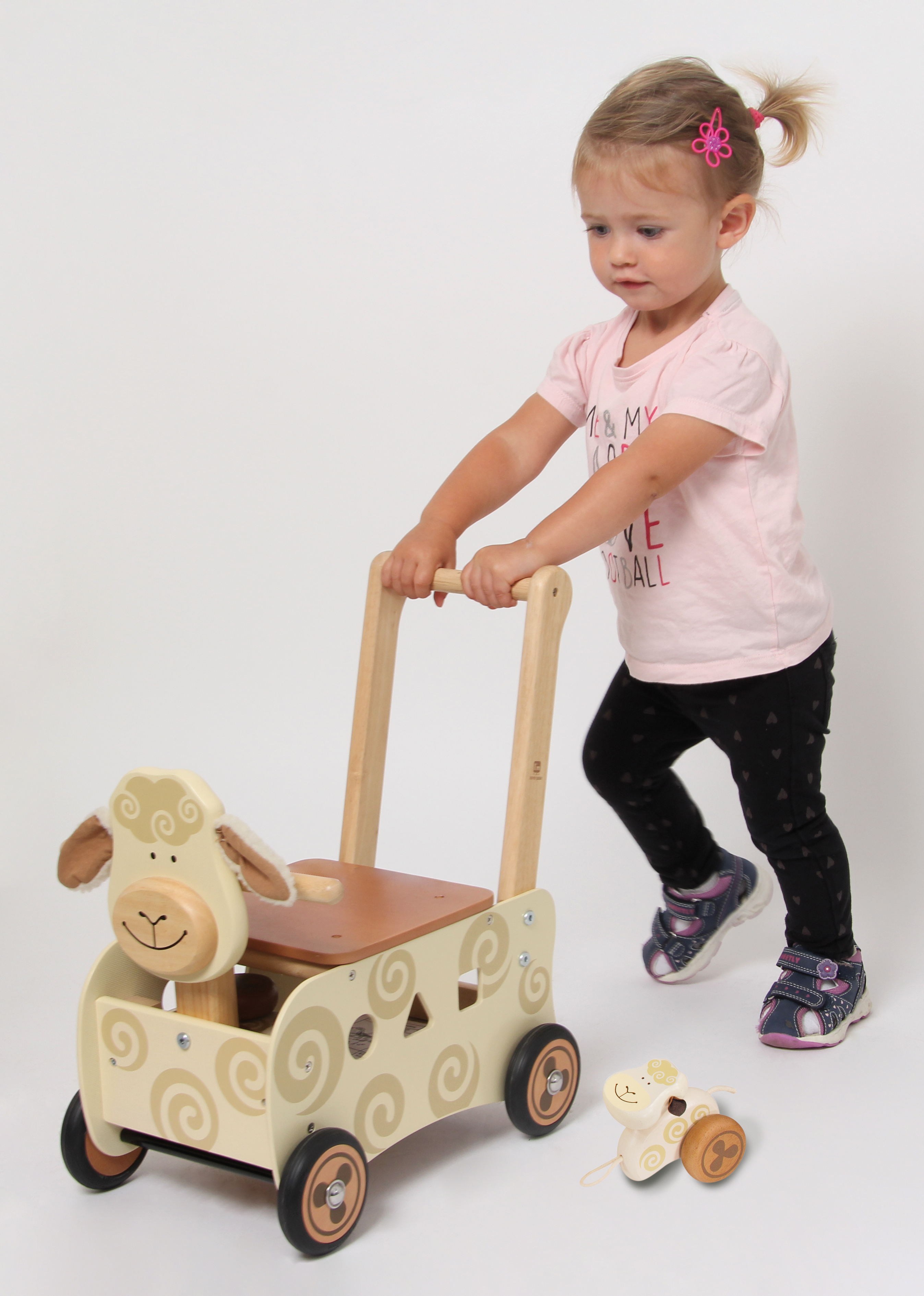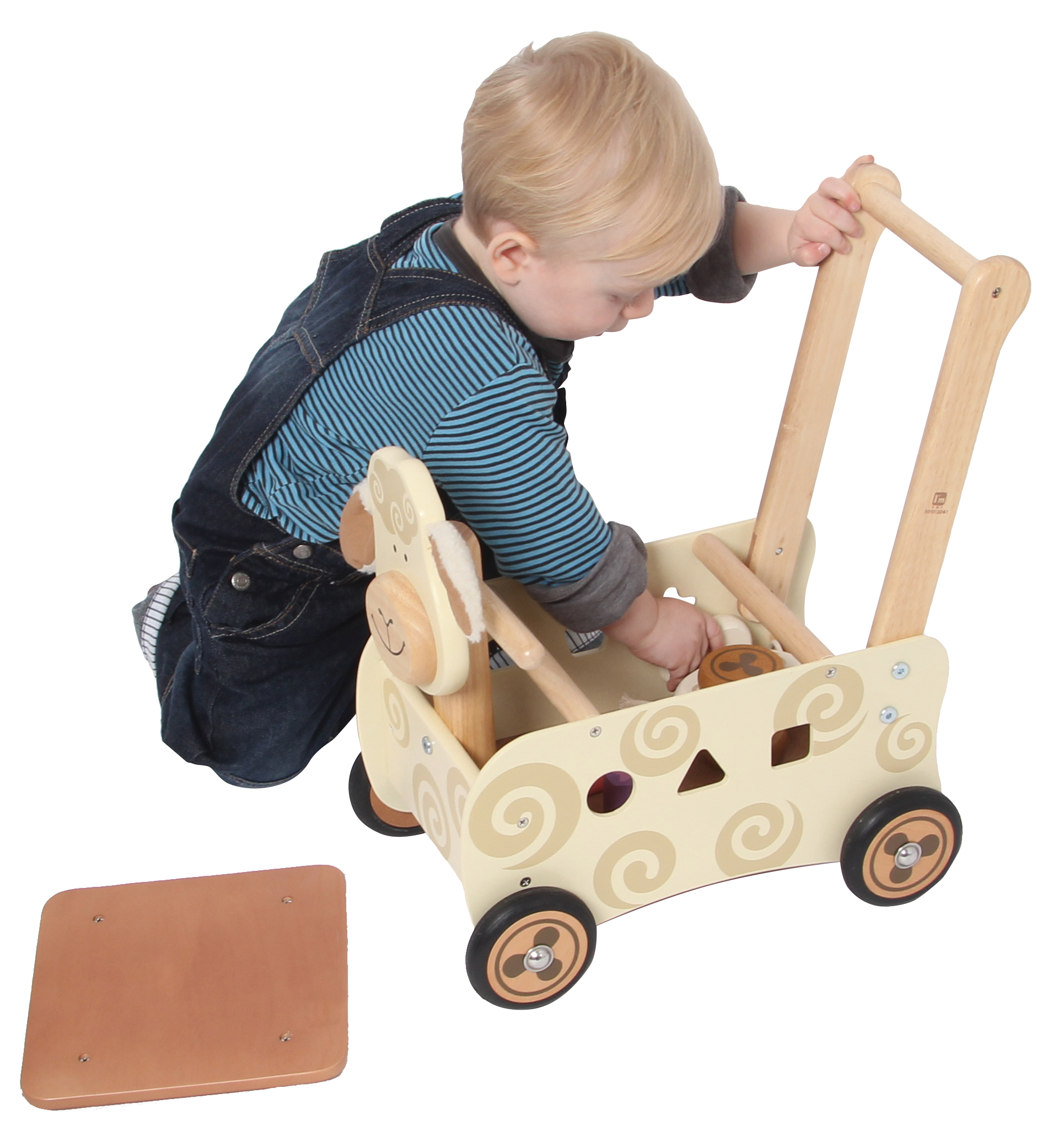 Das multifunktionelle Gefährt hat einen Griffbügel, eine abnehmbare Ablage- und Sitzfläche sowie ein Formensortierspiel in den Seitenteilen. Inklusive sechs Bauklötzen für das Sortierspiel und einem kleinen Spielschaf, das man am Schwänzchen des Schiebewagen-Tieres festmachen und hinter sich herziehen kann. Kleine Kinder können auf dem Wagen sitzen und ihn als Rutscher verwenden. Ab 12 Monaten. Sitzhöhe: 20 cm. Griffhöhe: 44 cm.