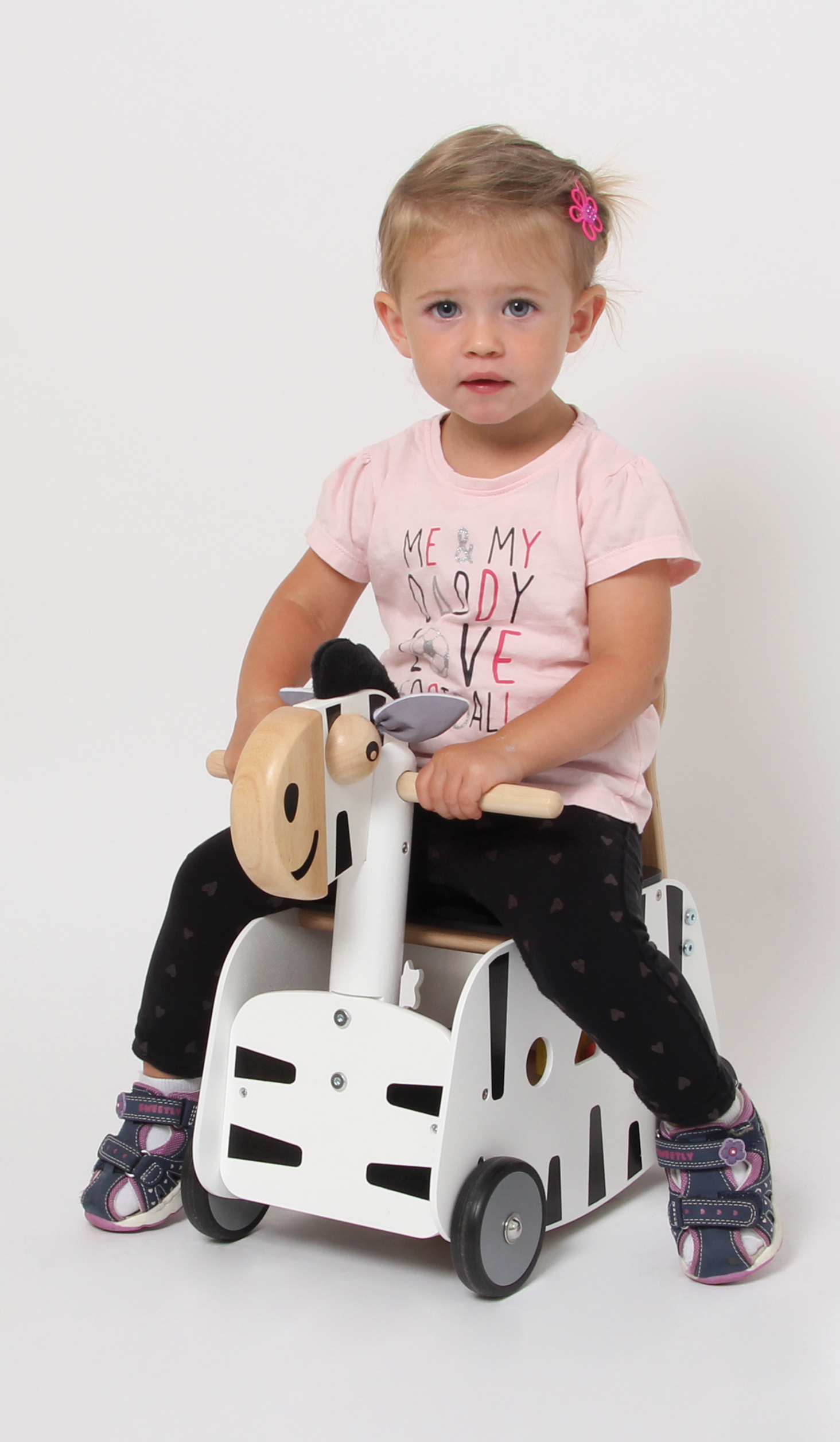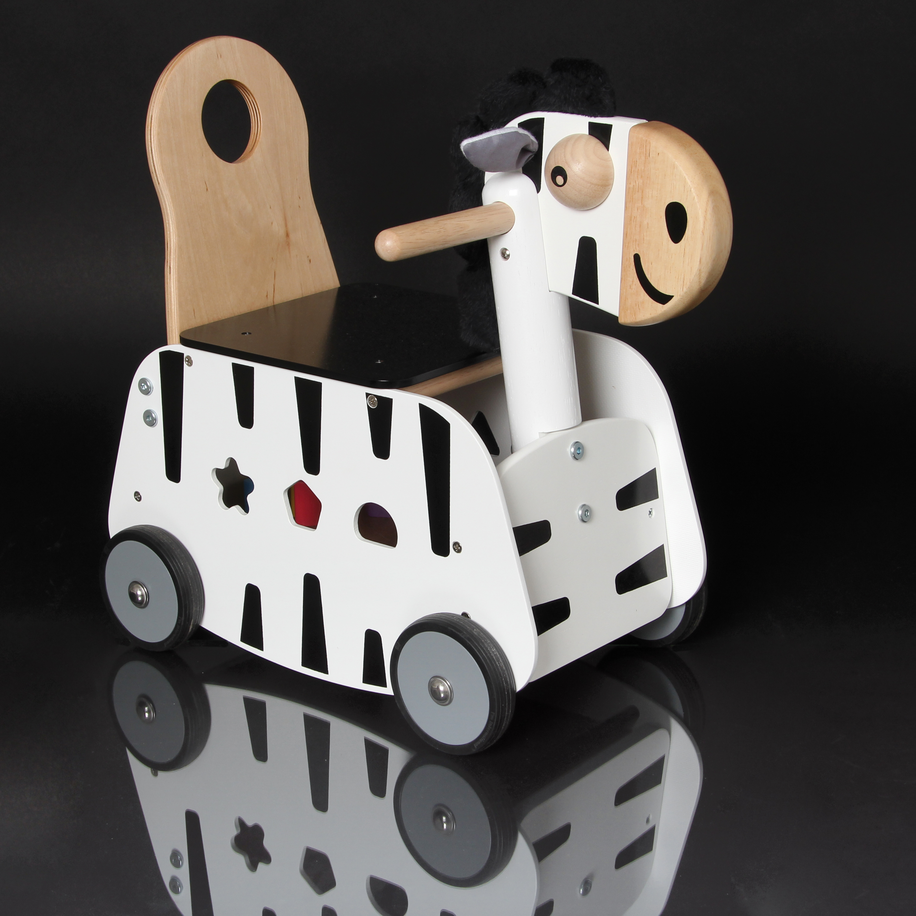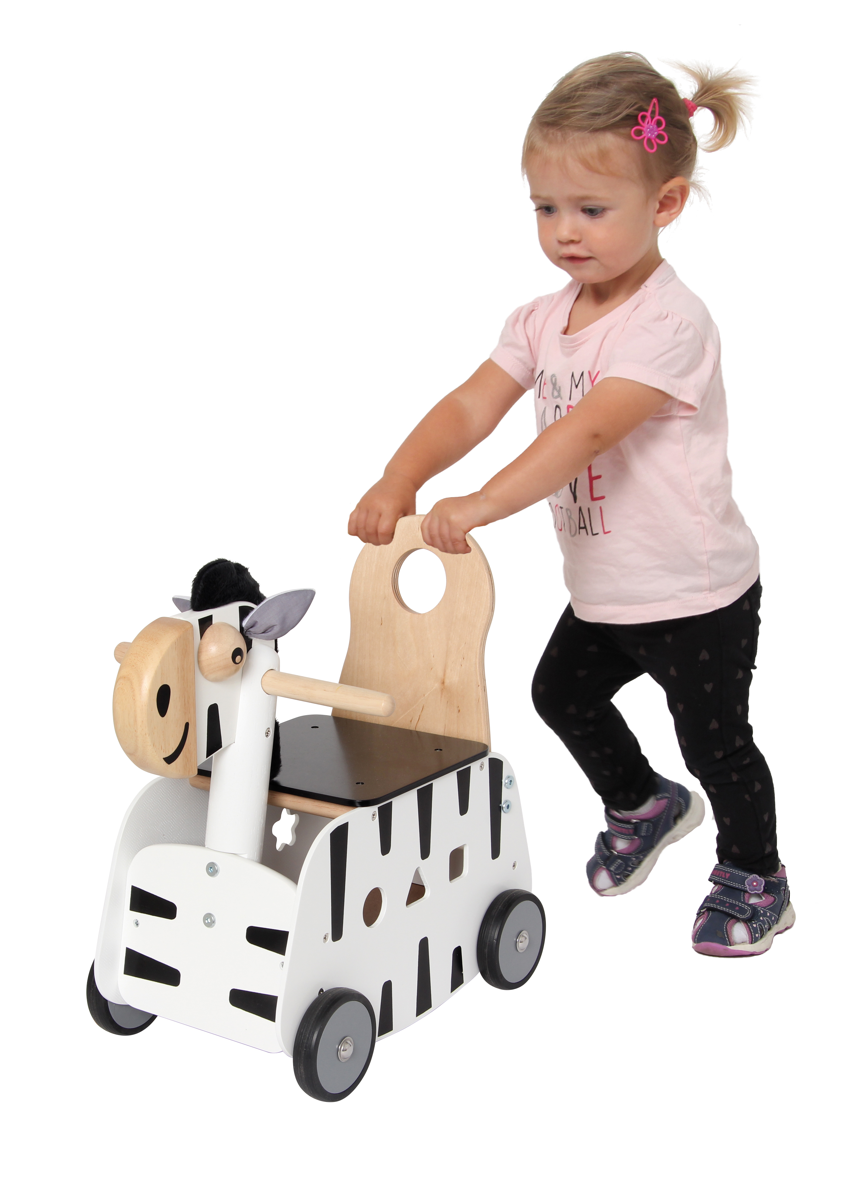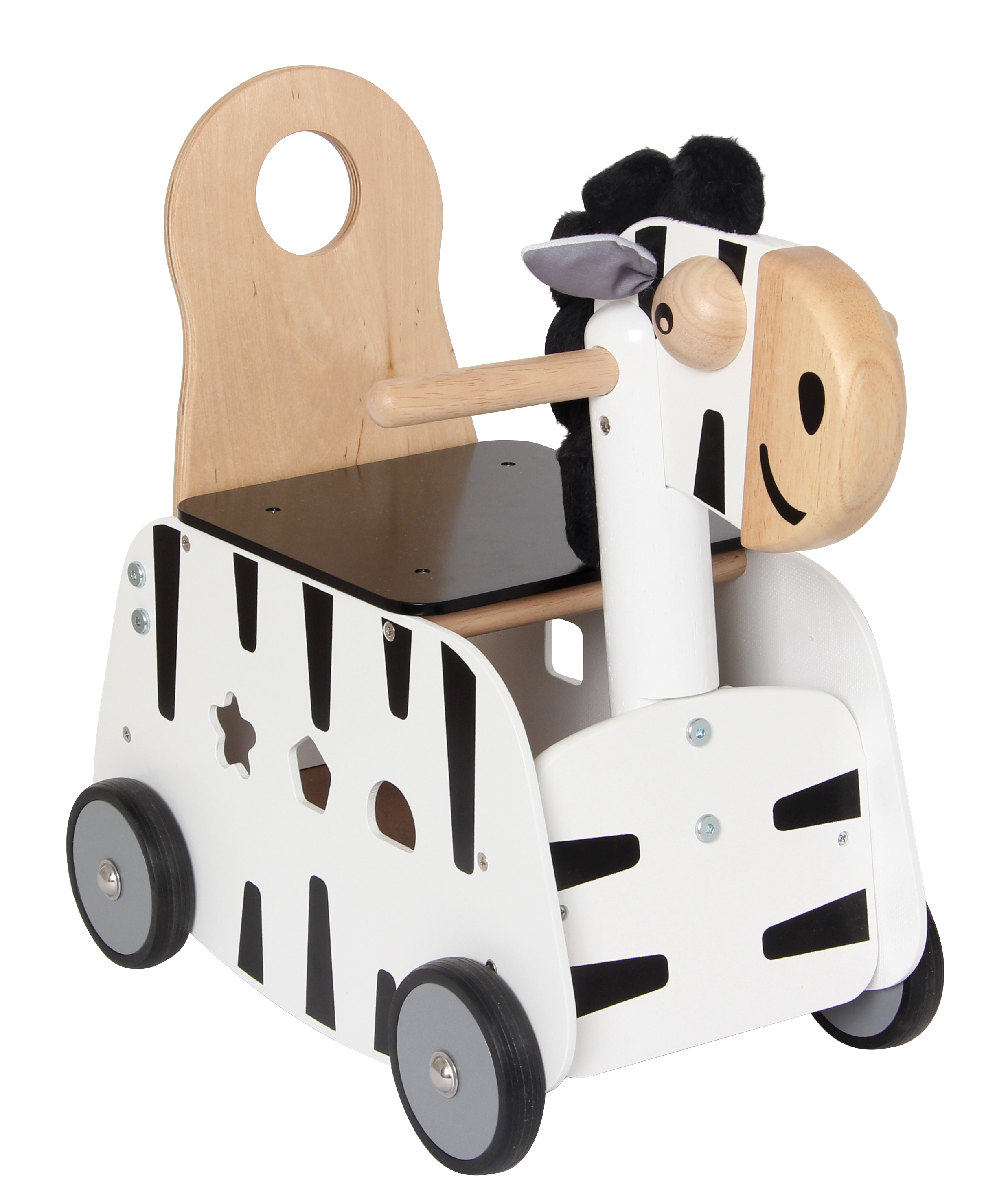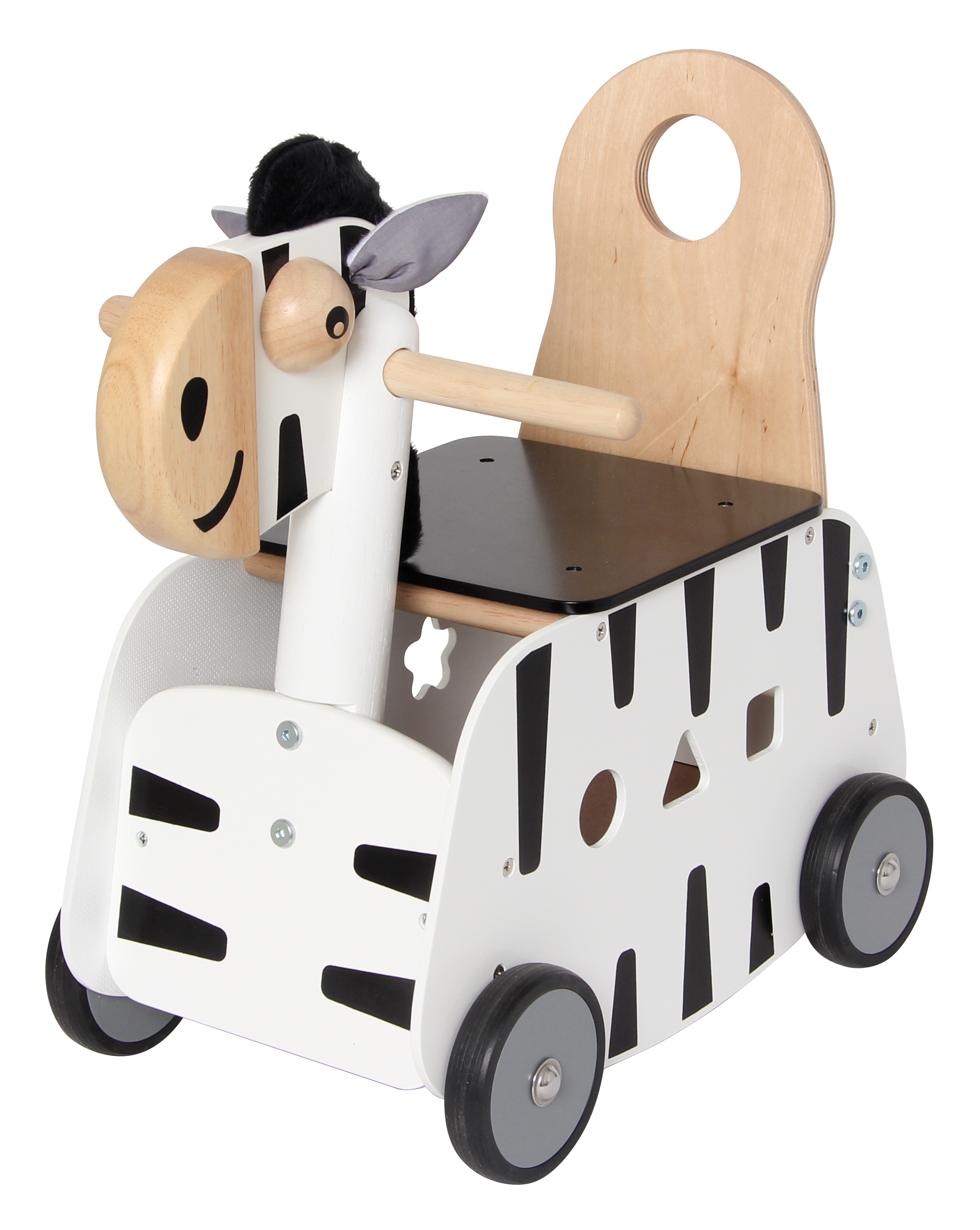 Stabiler Spielwagen und zugleich Rutscher aus Holz. Das freundliche Zebra hat eine abnehmbare Sitzfläche über dem Stauraum und ein integriertes Formensortierspiel. Umweltfreundlich hergestellt aus nachwachsendem Gummibaumholz und mit unbedenklichen Farben lackiert. Sitzhöhe: 22,5 cm, Griffhöhe: 41 cm.