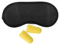 Reiseset mit Schlafmaske (Material: Mikrofaser) und Ohrstöpsel (Material: EVA).