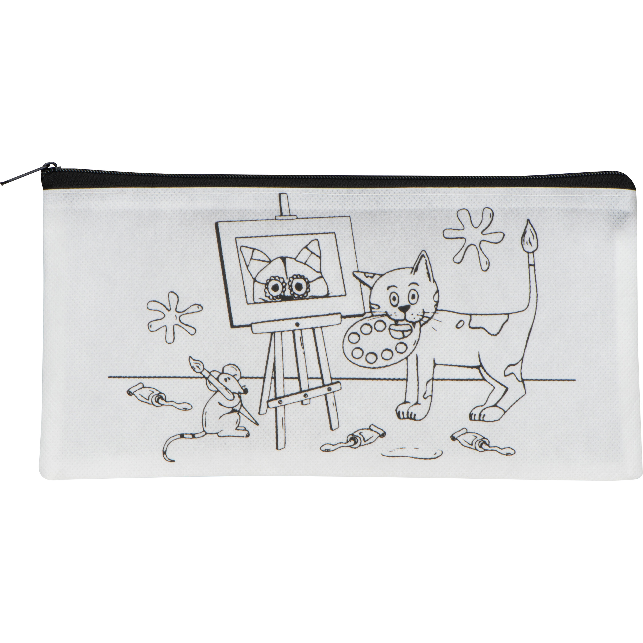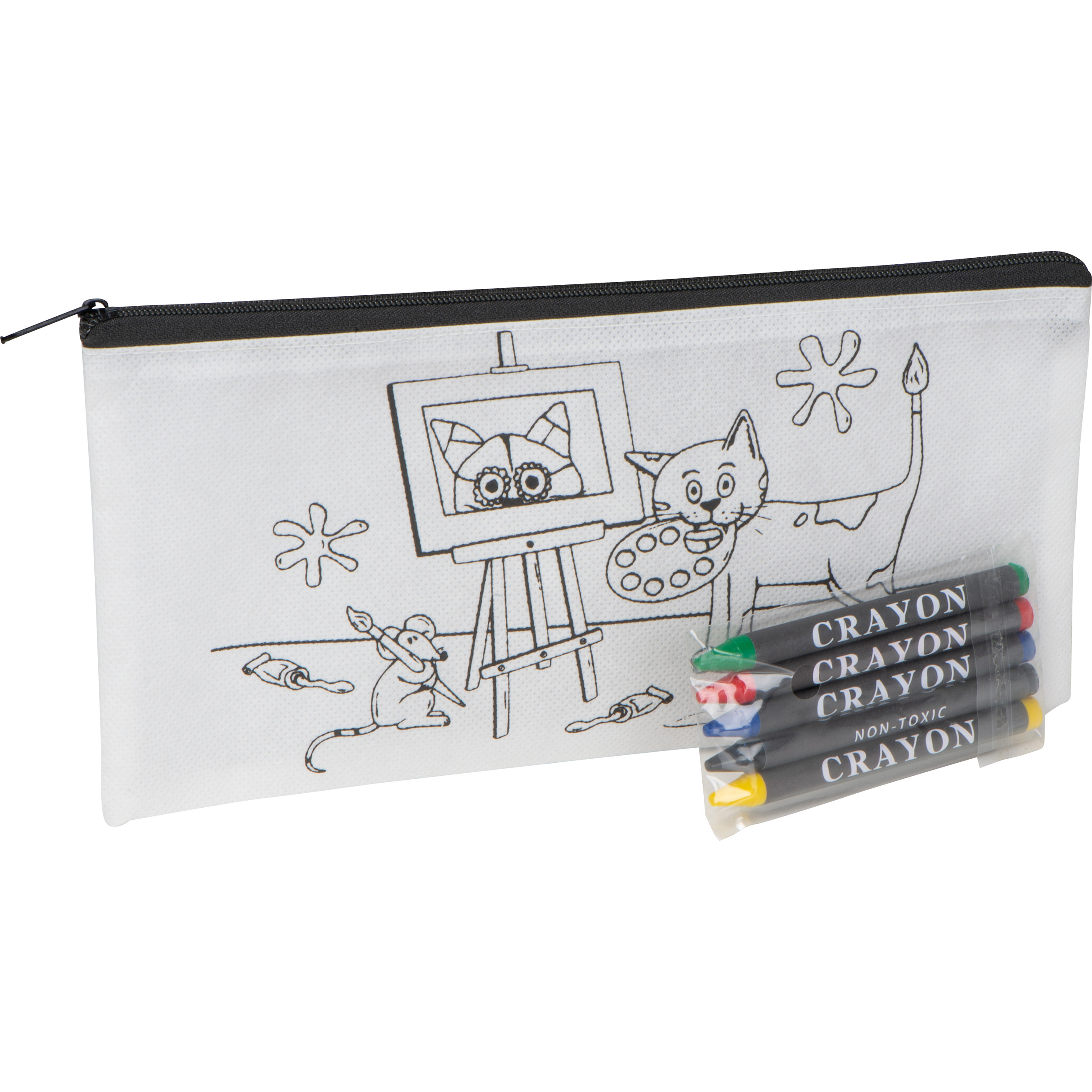Non-Woven-Stiftetui mit fünf Wachsmalstiften (gelb, schwarz, blau, rot und grün), bedruckt mit einem fröhlichen Motiv zum Ausmalen. Ideal, um Kinder zu beschäftigen und ihre Fantasie zu fördern. Ihre Werbung drucken wir auf die Rückseite.