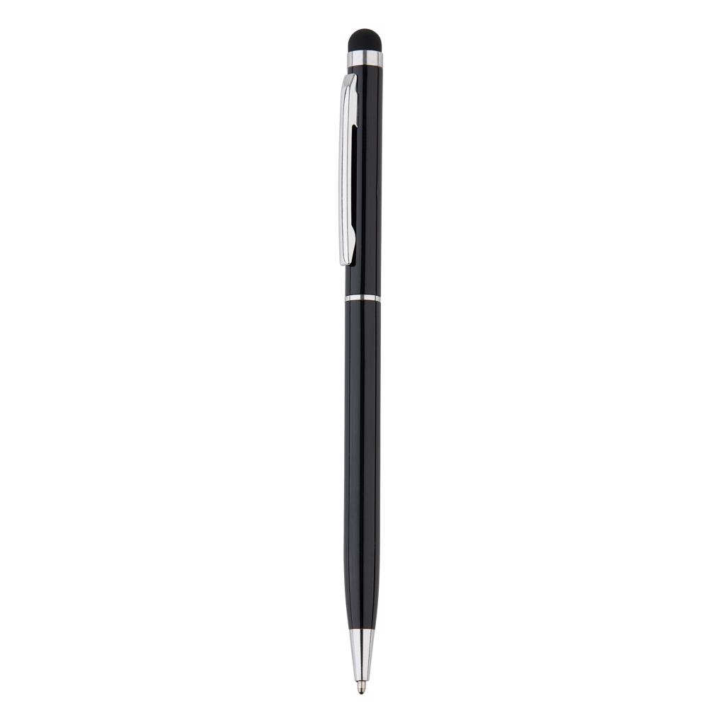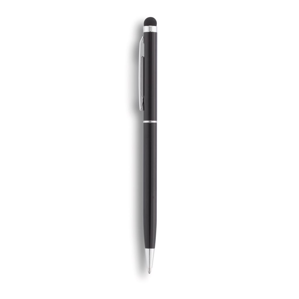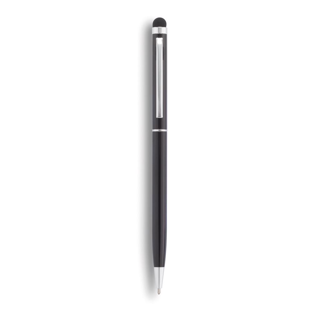 Schwarzschreibender Kugelschreiber aus Aluminium mit Stylus und einfacher Handhabung durch den Drehmachanismus.