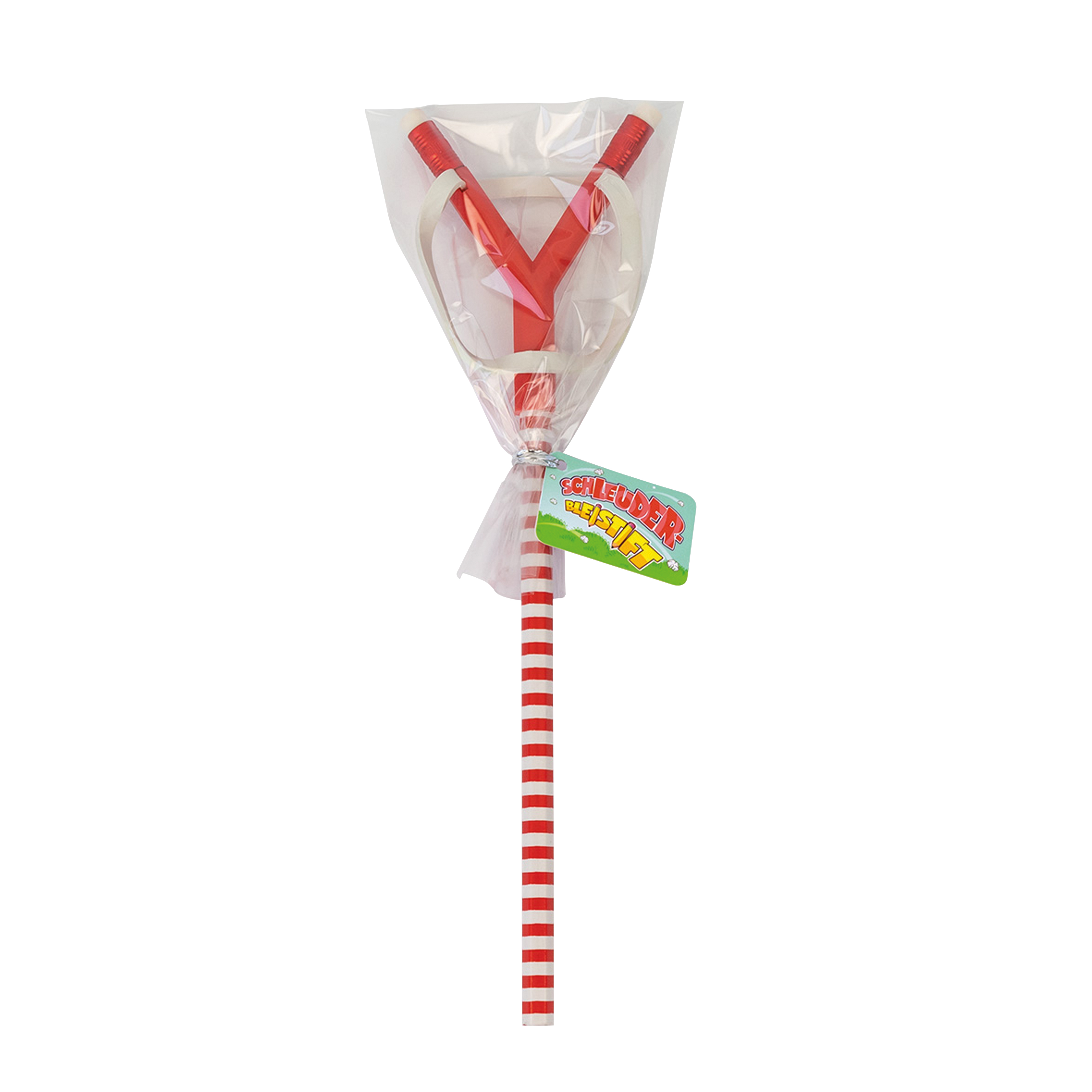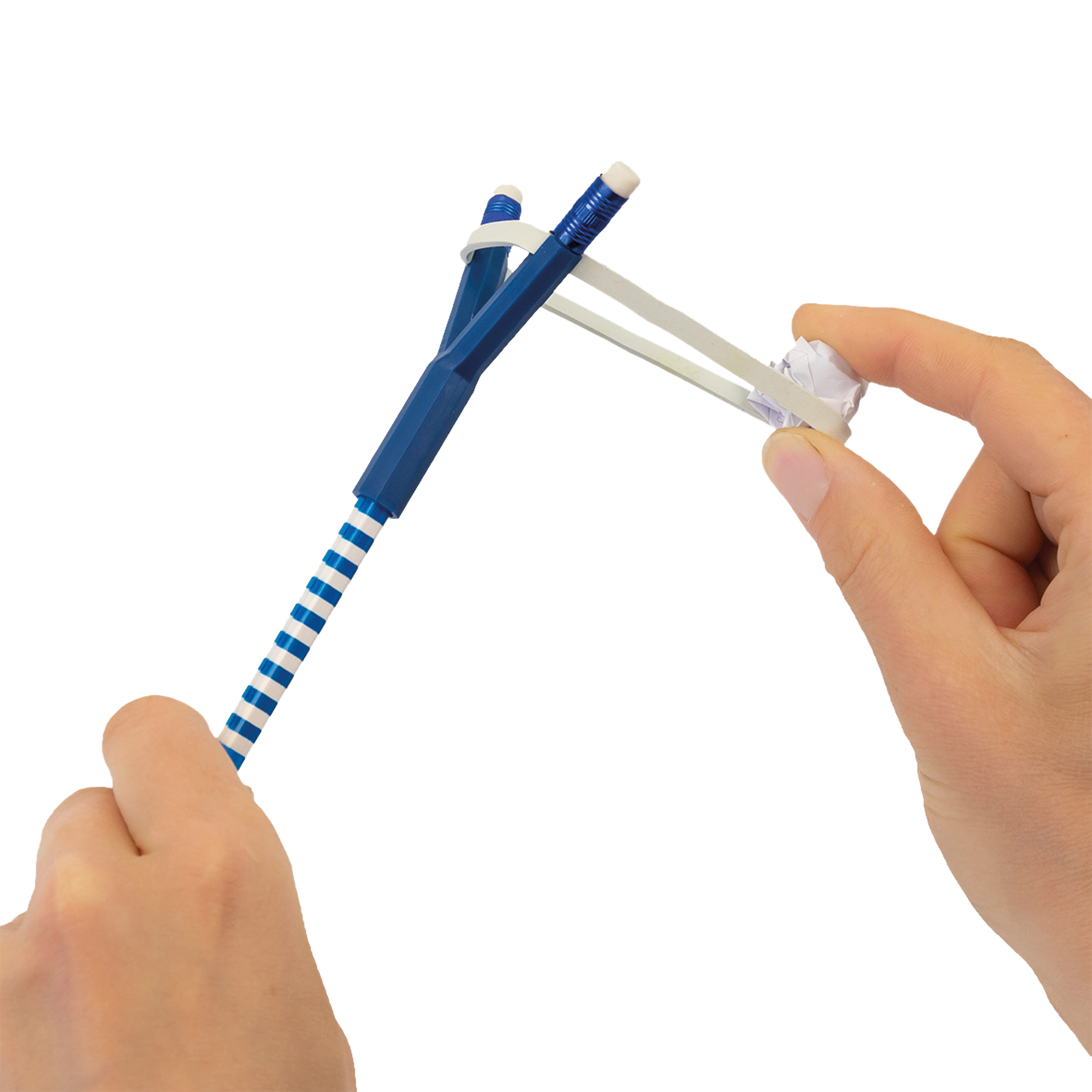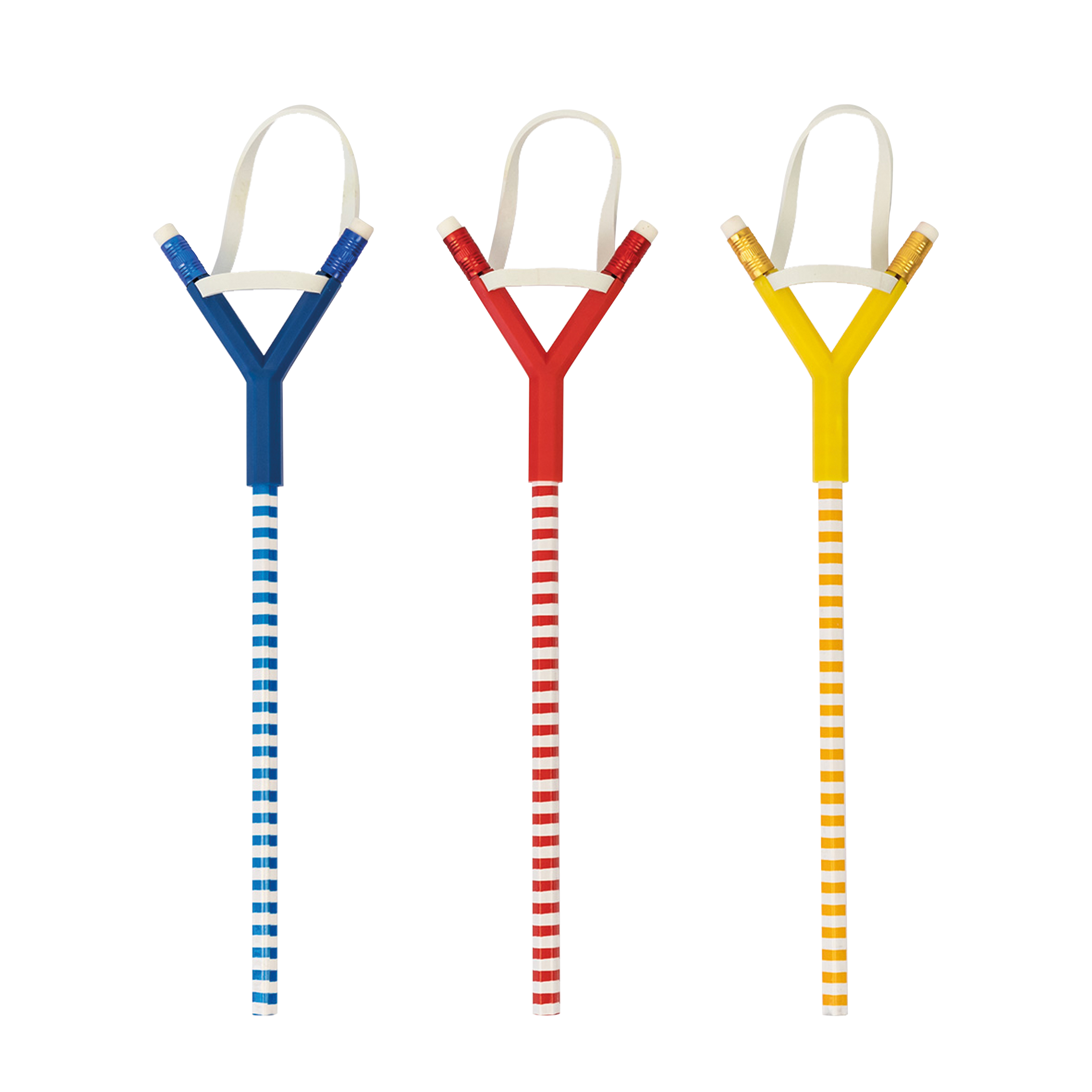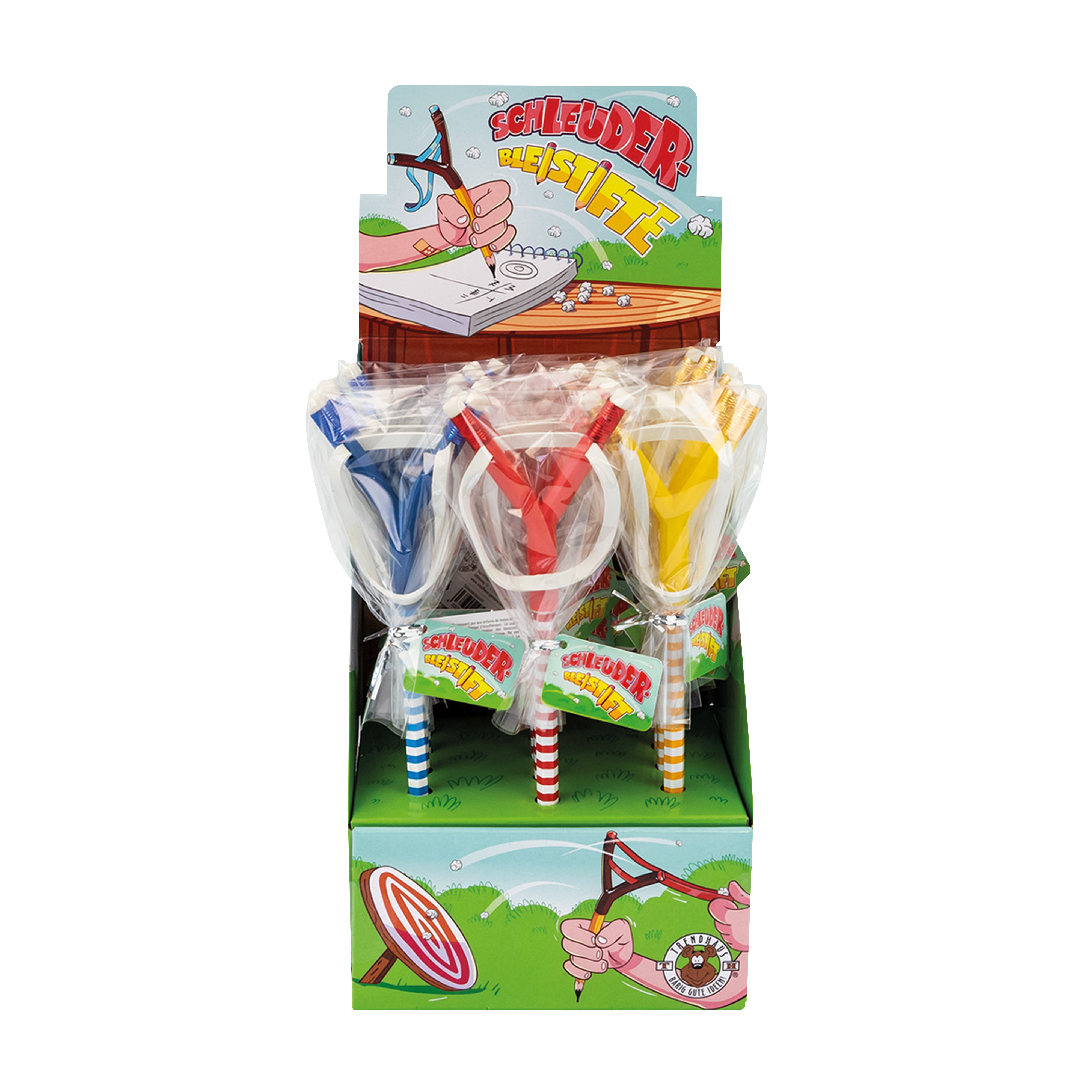 Lustiger (Schreib-)Spaß gegen Langeweile! Bleistift mit cooler, aufgesteckter Schleuder inkl. 2 Radierertopper. In 3 Farben: blau, gelb, rot Material: Holz, Gummi, Aluminium, Kunststoff