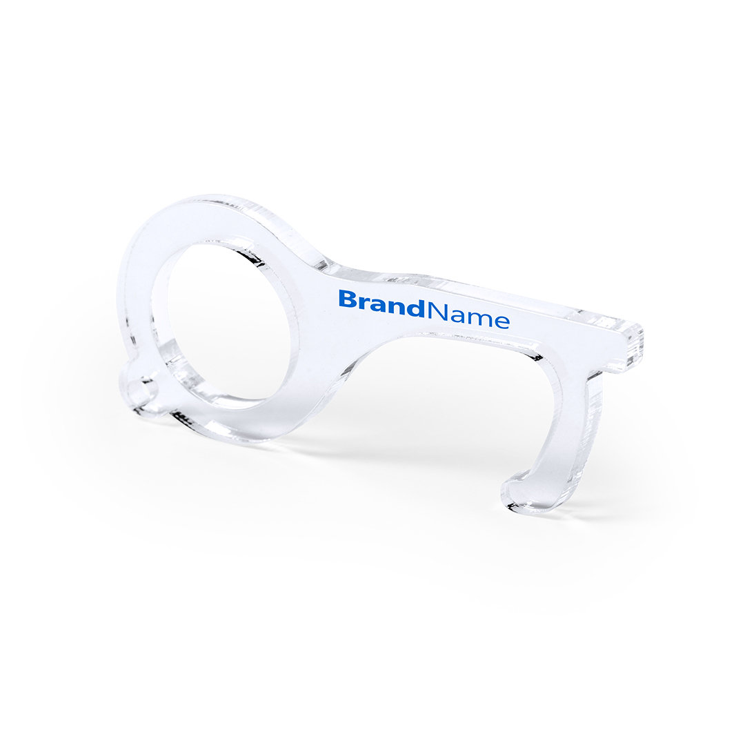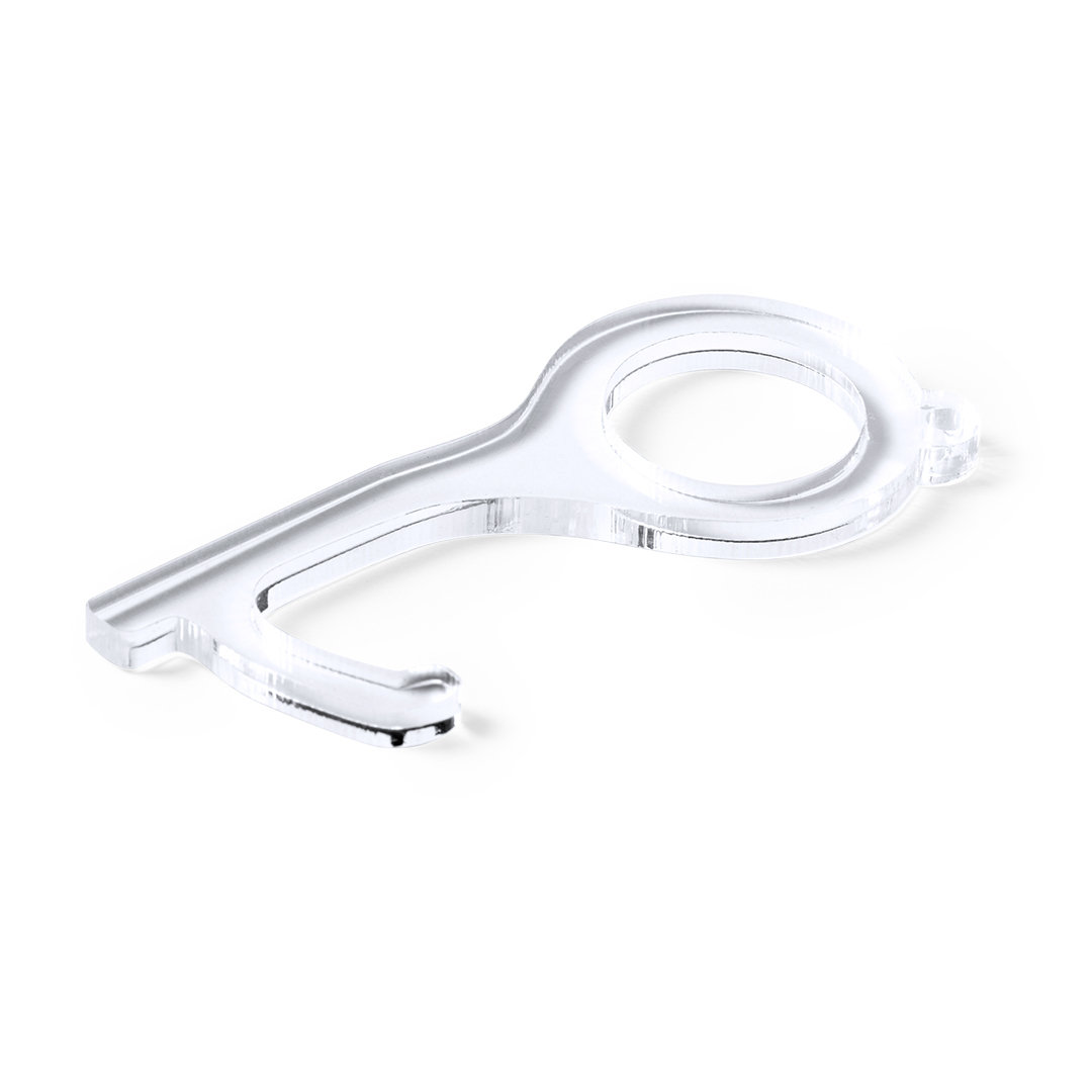 Hygienischer berührungssicherer Schlüsselanhänger, hergestellt aus langlebigem und auffälligem Acrylmaterial in transparenter Ausführung. Speziell entwickelt, um das Berühren gewöhnlicher Oberflächen mit den Händen zu vermeiden (Türgriffe, Schalter, öffentliche Wasserhähne, Geldautomaten...). Mit einer bequemen Fingerstanzung und in einer individuellen Designtasche präsentiert. Empfohlen für Tampondruck.