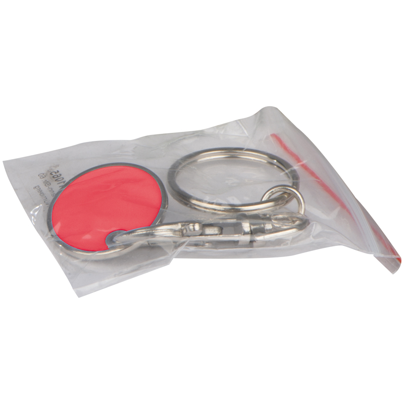 Schlüsselanhänger mit einem durch einen Karabinerhaken abnehmbaren Einkaufswagenchip. Die eine Seite des Chips ist farbig. Ihre Werbung gravieren wir auf die silberne Seite des Chips.