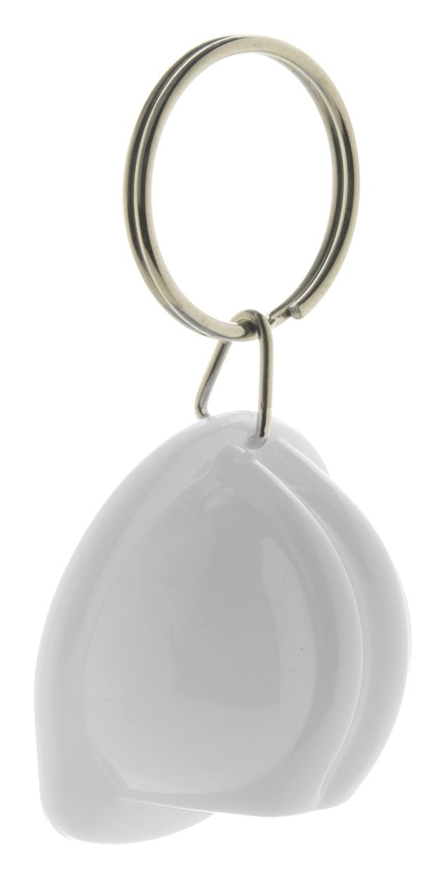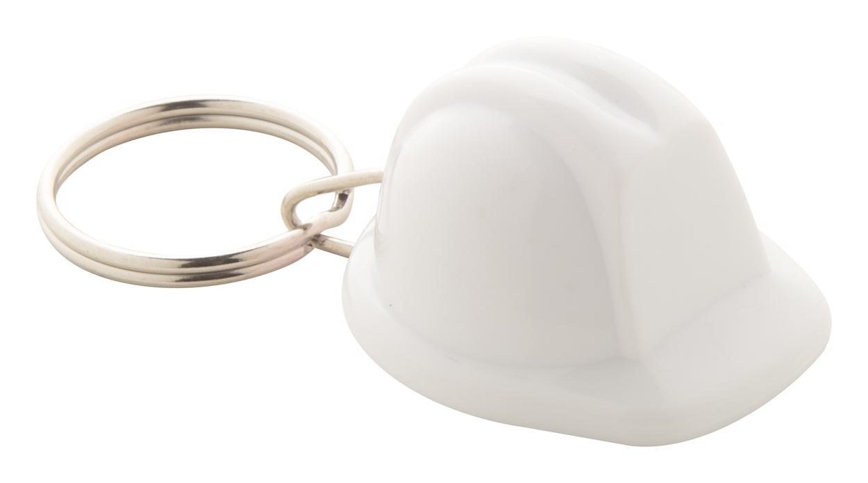 Schlüsselanhänger in Form eines Sicherheitshelmes aus Kunststoff.