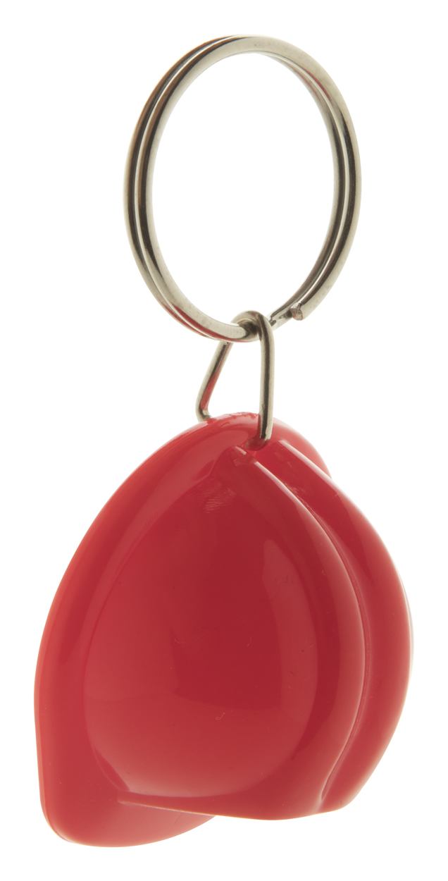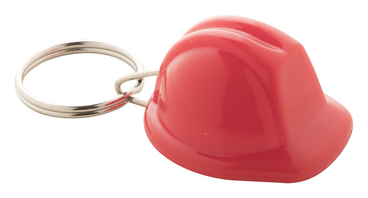 Schlüsselanhänger in Form eines Sicherheitshelmes aus Kunststoff.